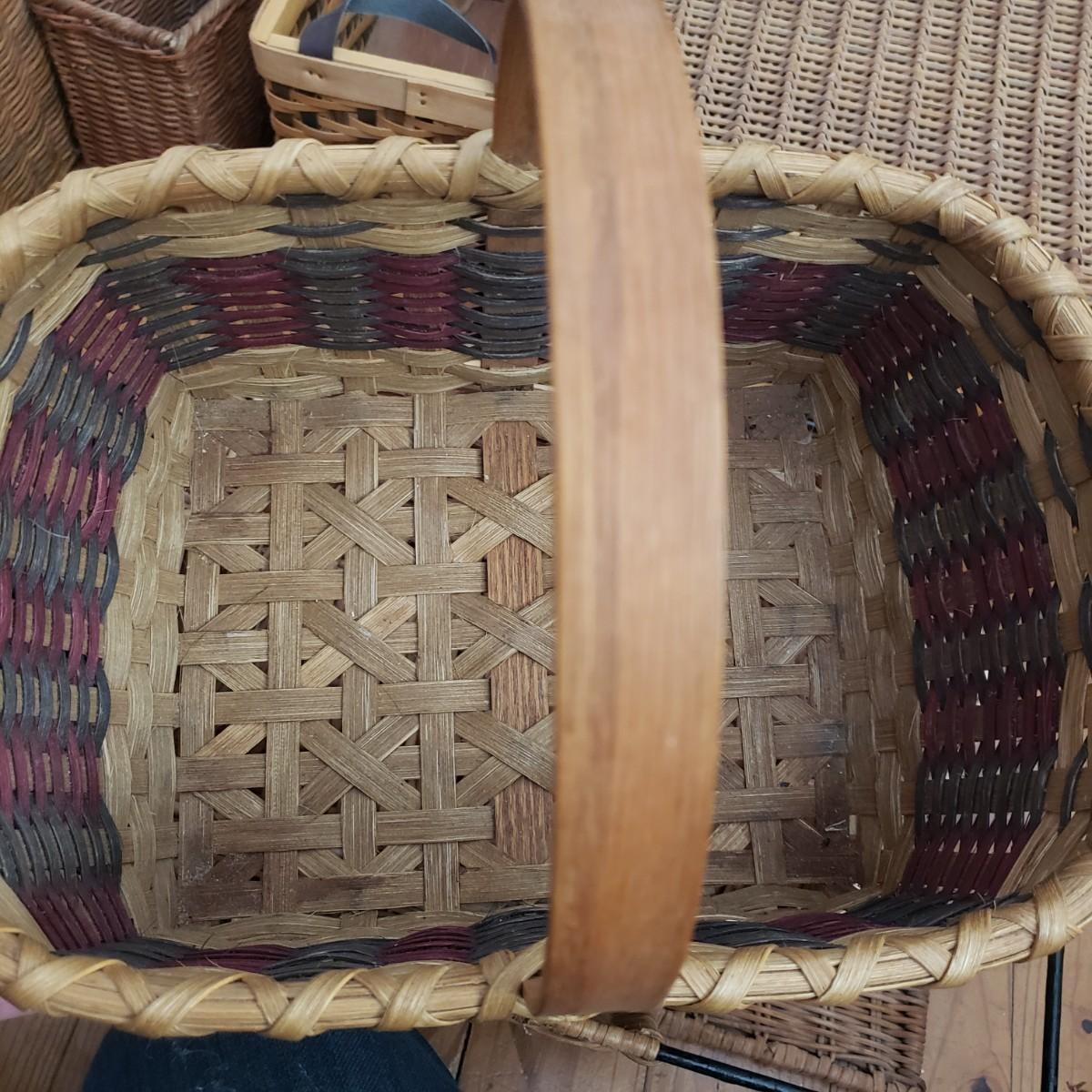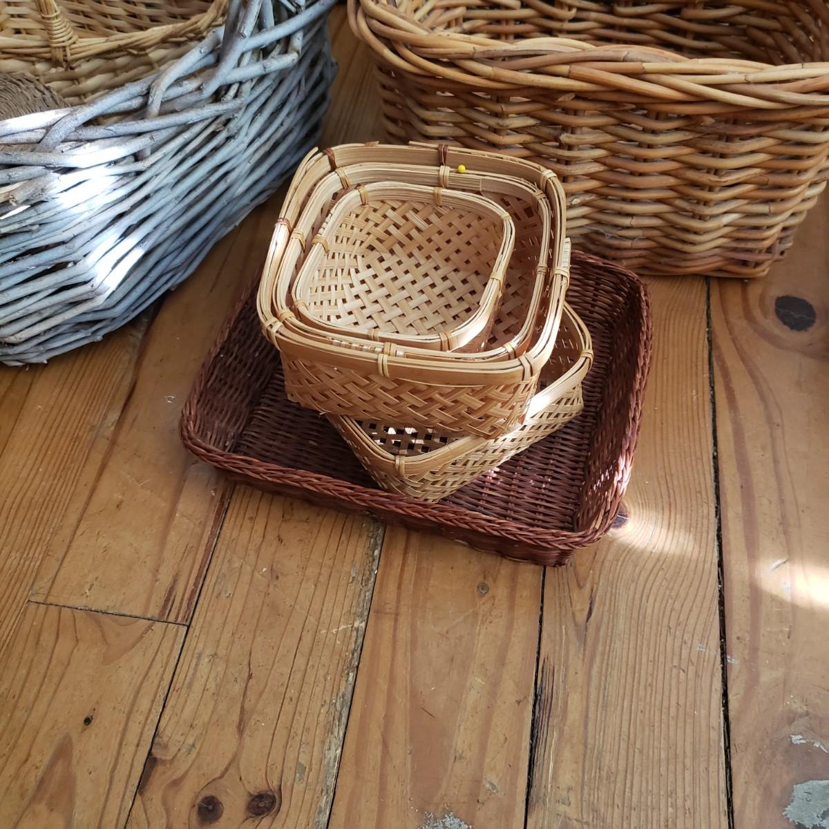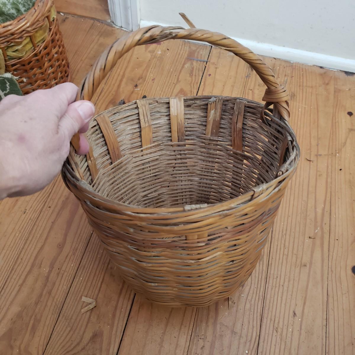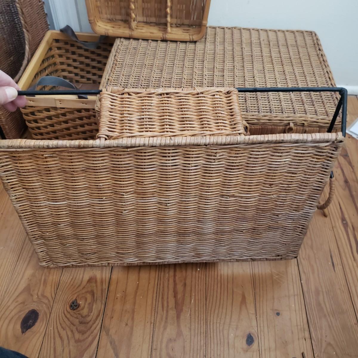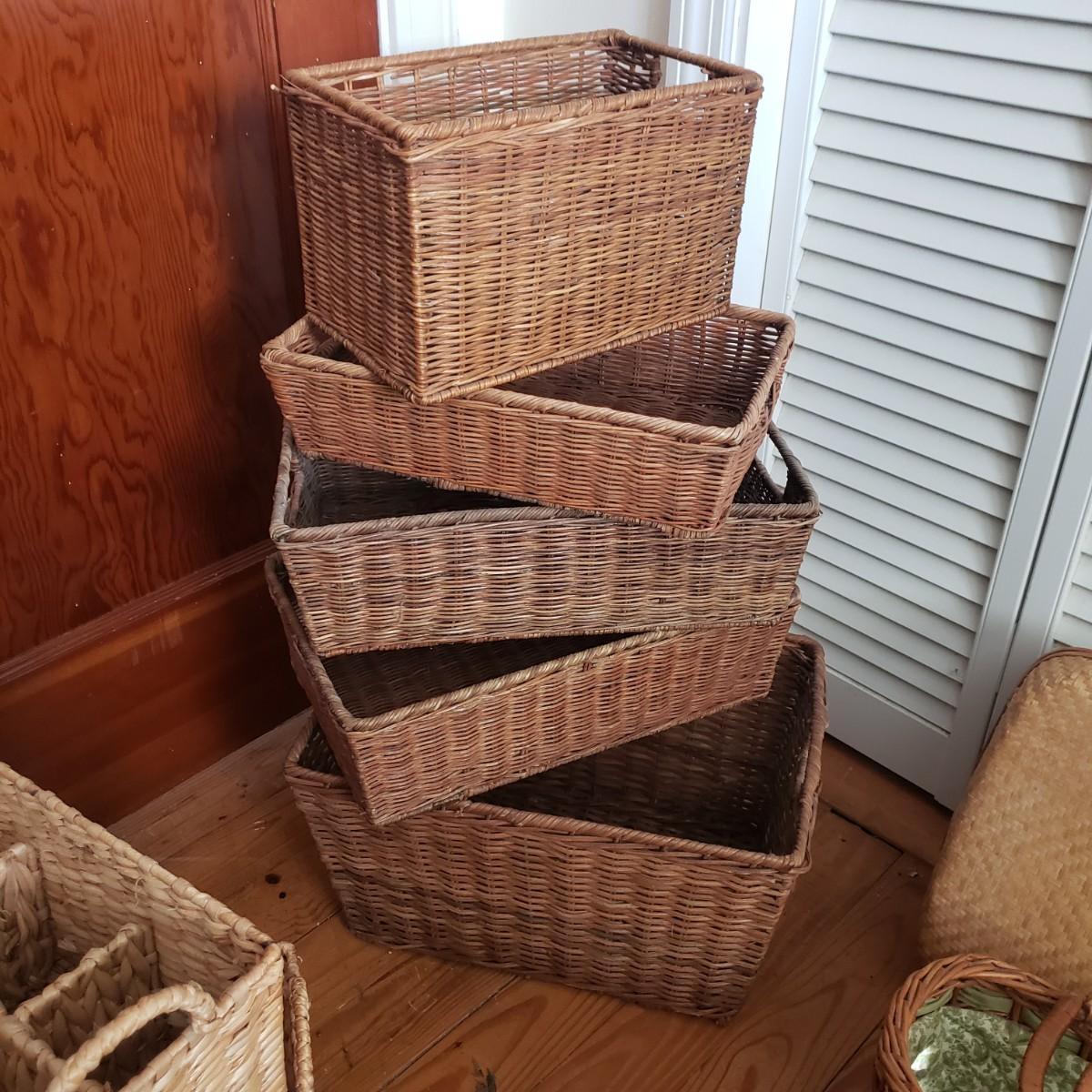 This large lot of baskets has such a variety! There is a wicker suitcase, a vintage purse, wire wrapped rectangular baskets for extra support and a handmade market basket with a leather wrapped handle. The three wicker utensil holders measure 12" x 7" x 6"H each. The purse with fabric lining the inside has "VML" embroidered on it with a sweet green velvet, yet a little faded, bow.