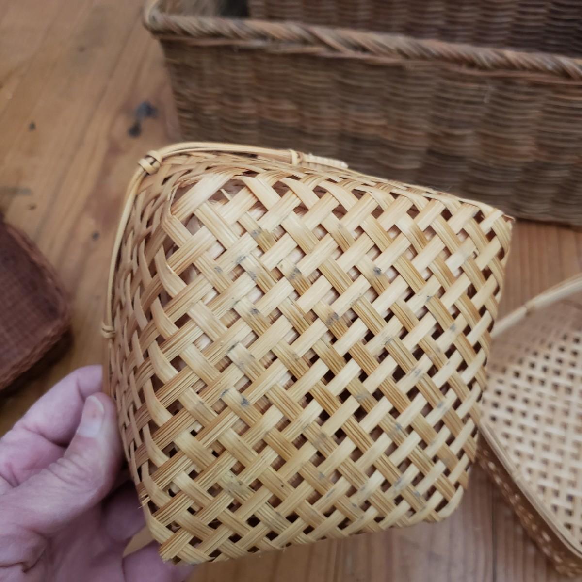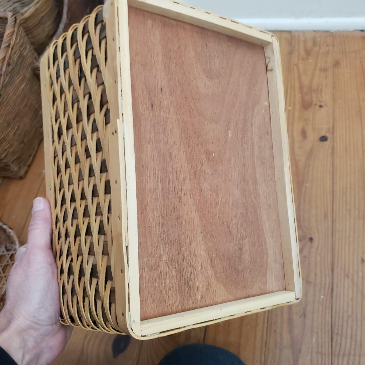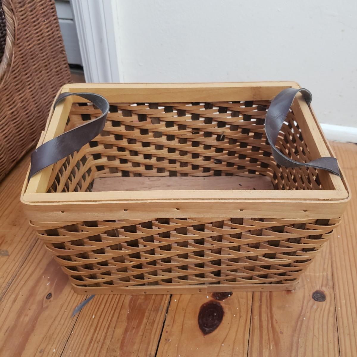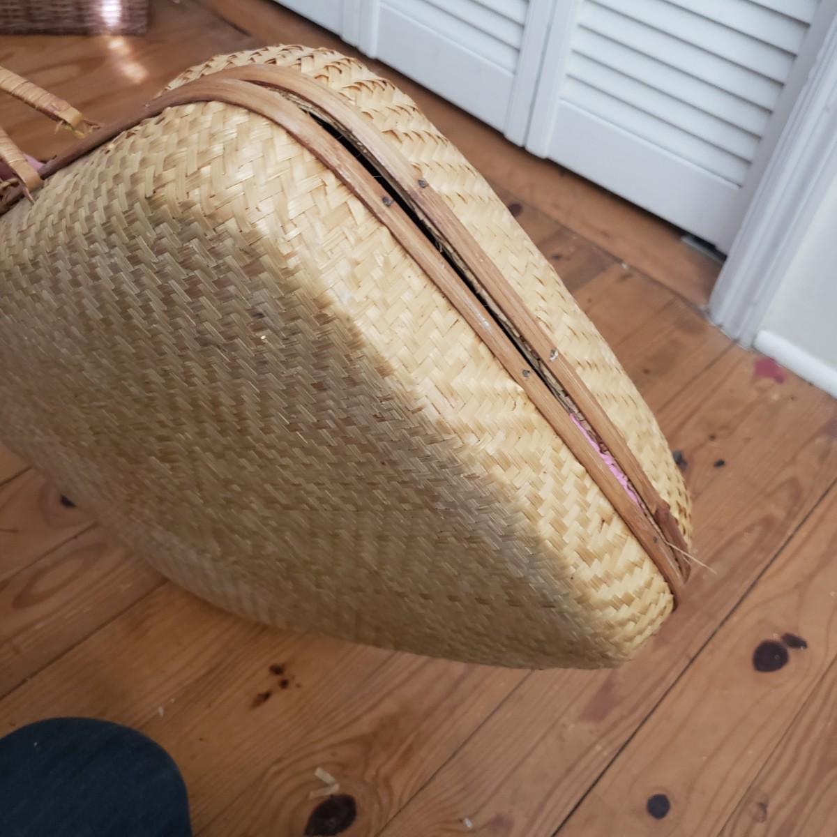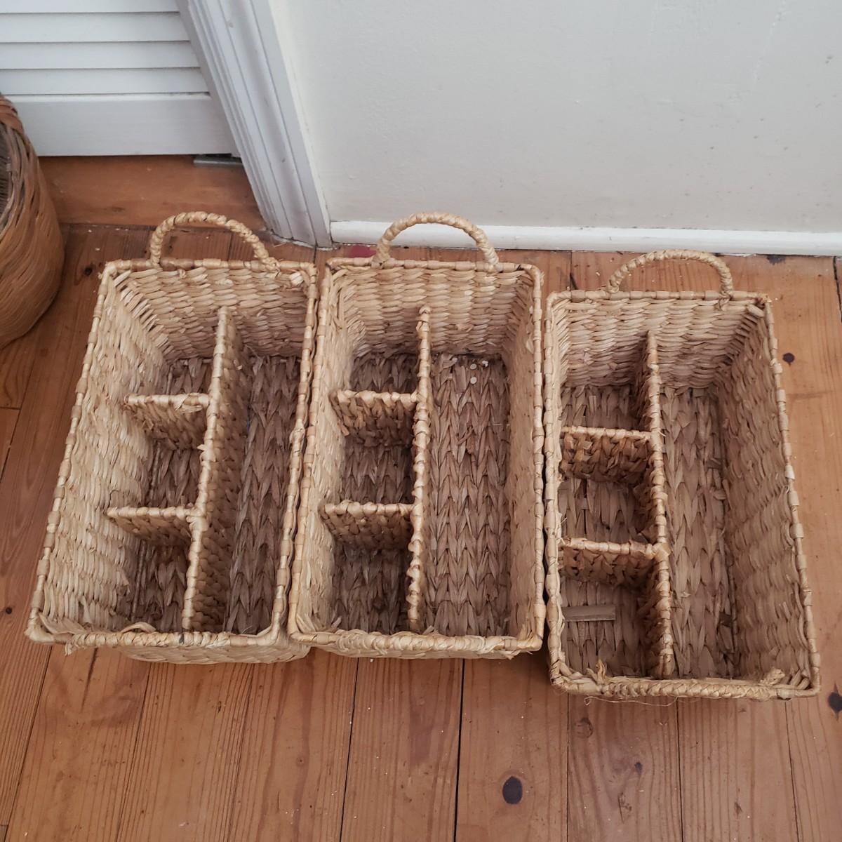 This large lot of baskets has such a variety! There is a wicker suitcase, a vintage purse, wire wrapped rectangular baskets for extra support and a handmade market basket with a leather wrapped handle. The three wicker utensil holders measure 12" x 7" x 6"H each. The purse with fabric lining the inside has "VML" embroidered on it with a sweet green velvet, yet a little faded, bow.