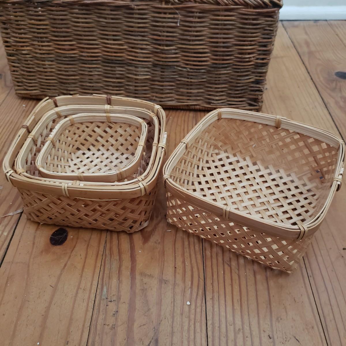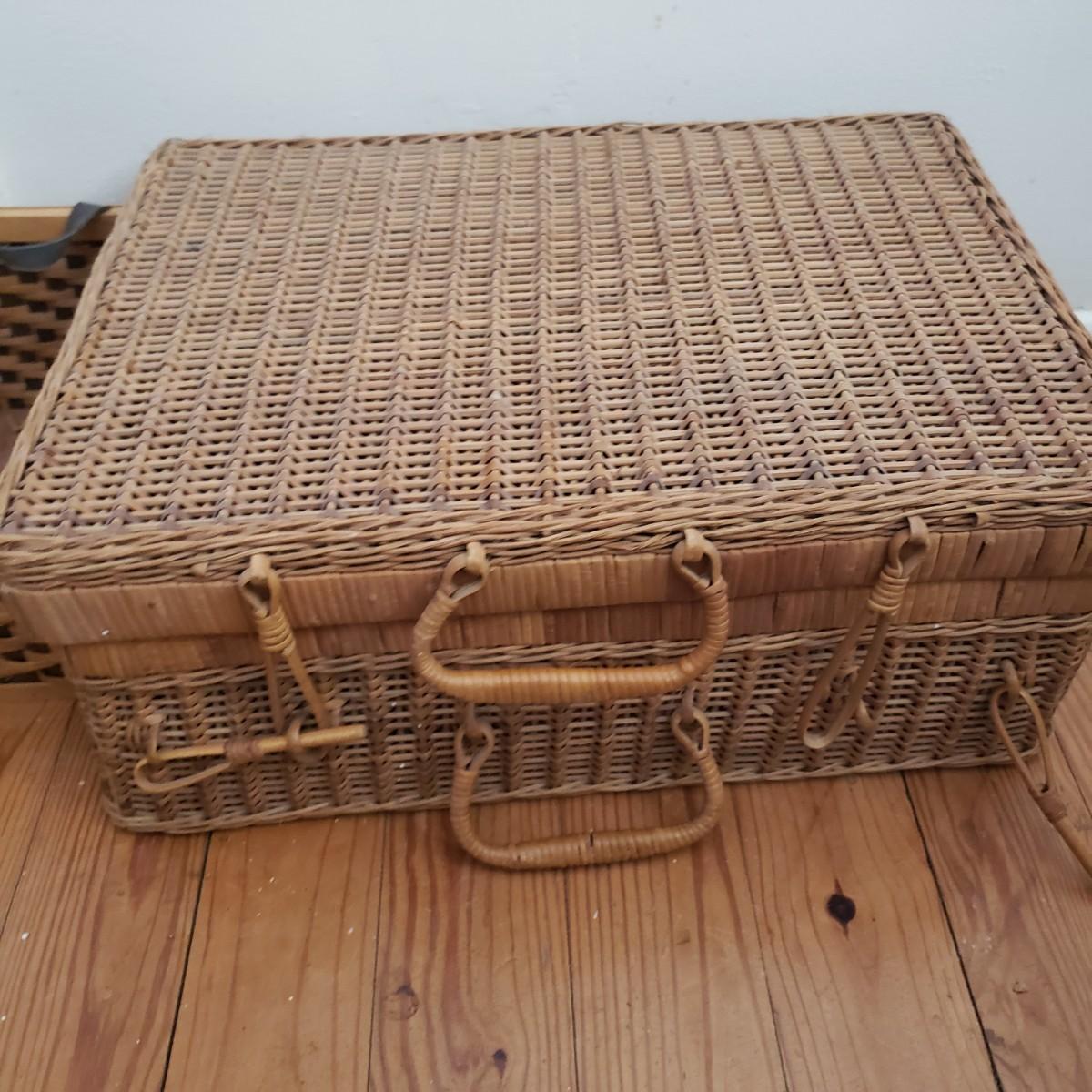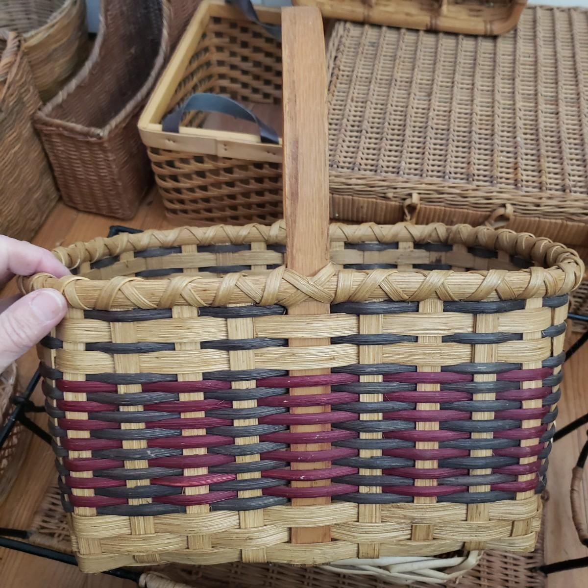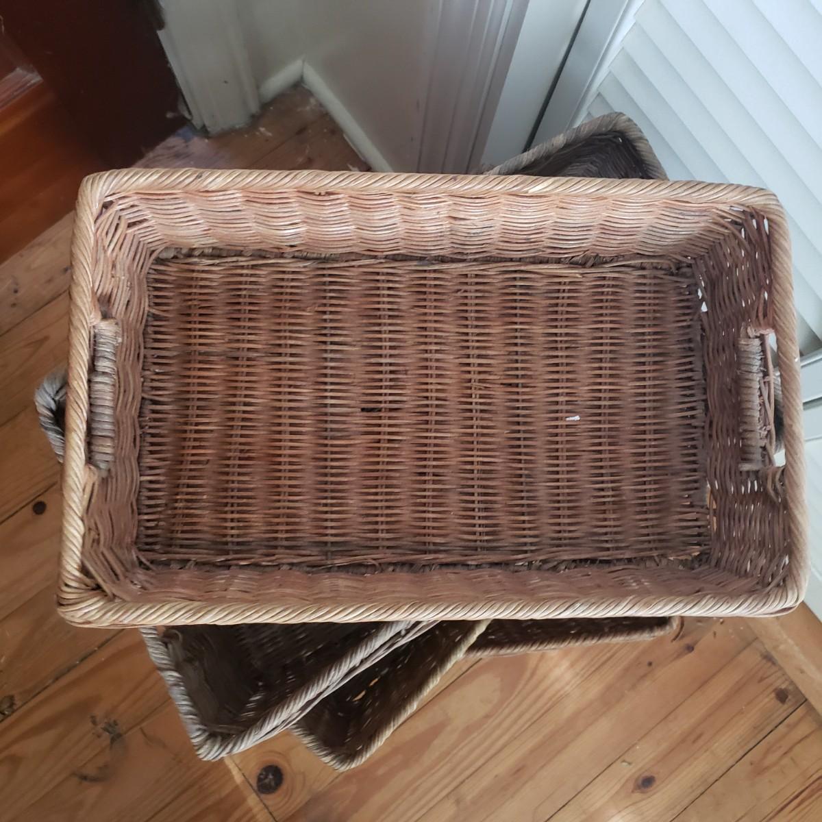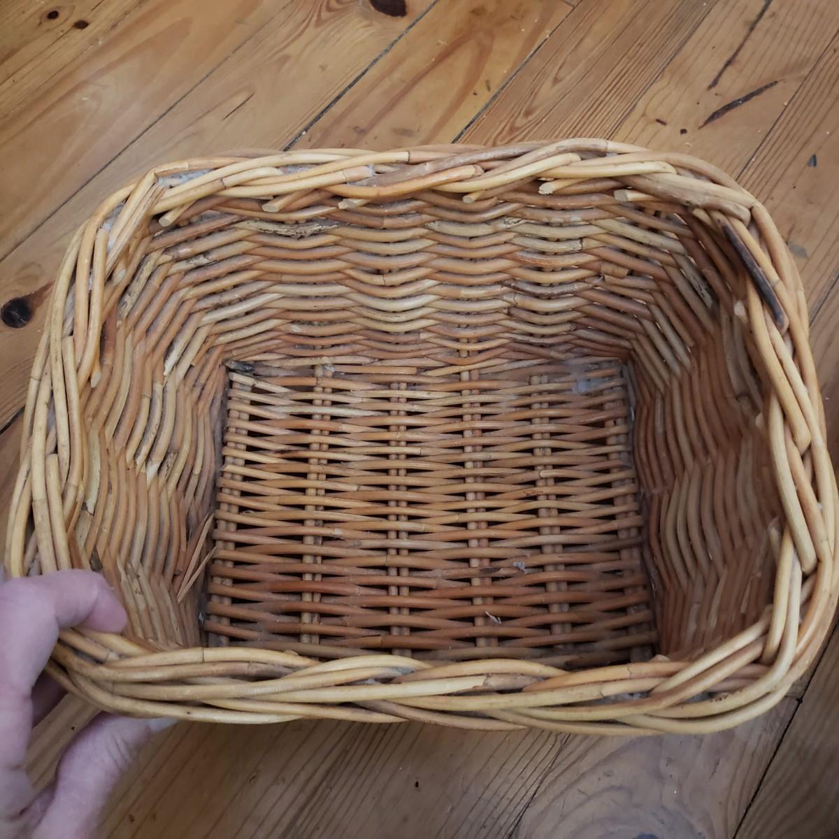 This large lot of baskets has such a variety! There is a wicker suitcase, a vintage purse, wire wrapped rectangular baskets for extra support and a handmade market basket with a leather wrapped handle. The three wicker utensil holders measure 12" x 7" x 6"H each. The purse with fabric lining the inside has "VML" embroidered on it with a sweet green velvet, yet a little faded, bow.
