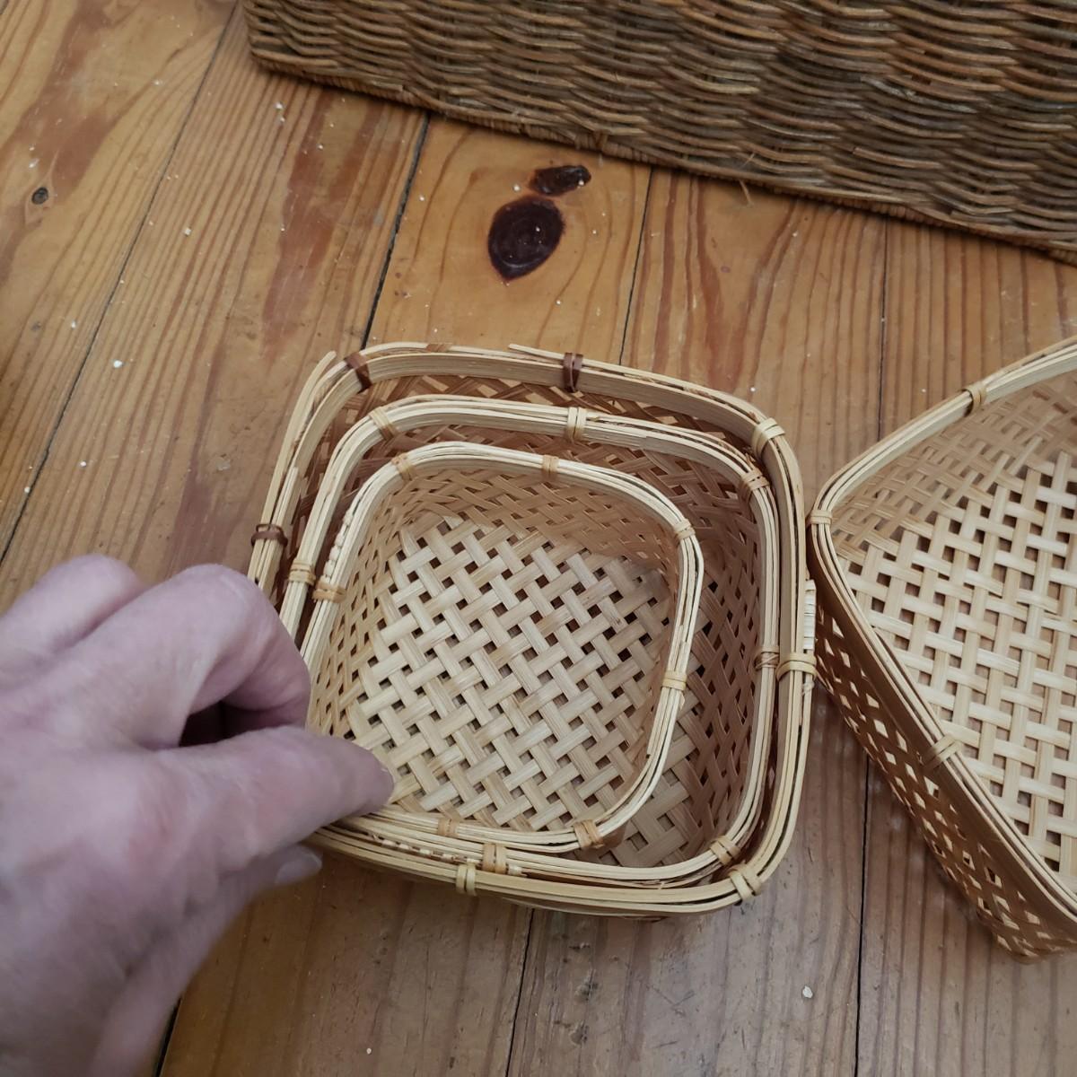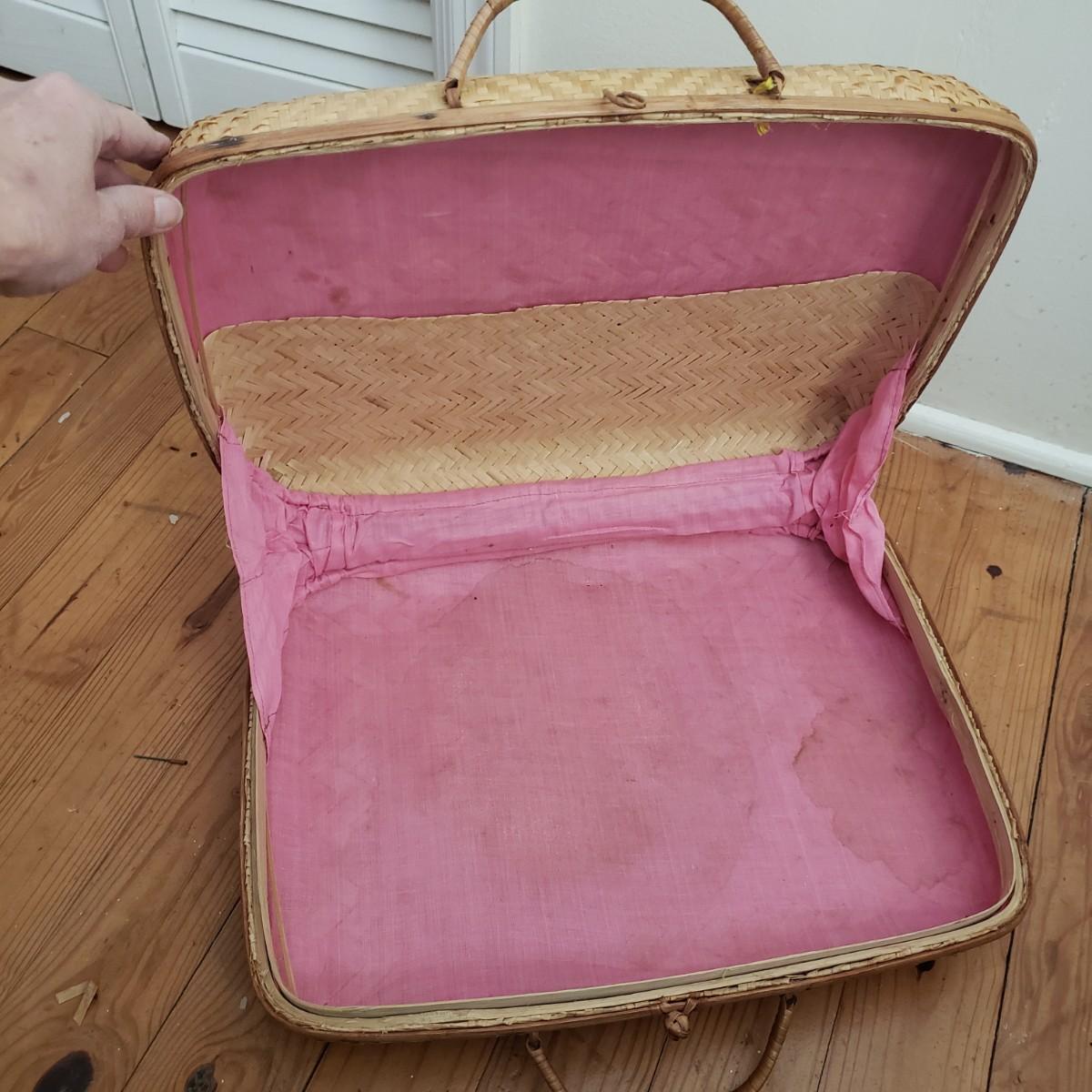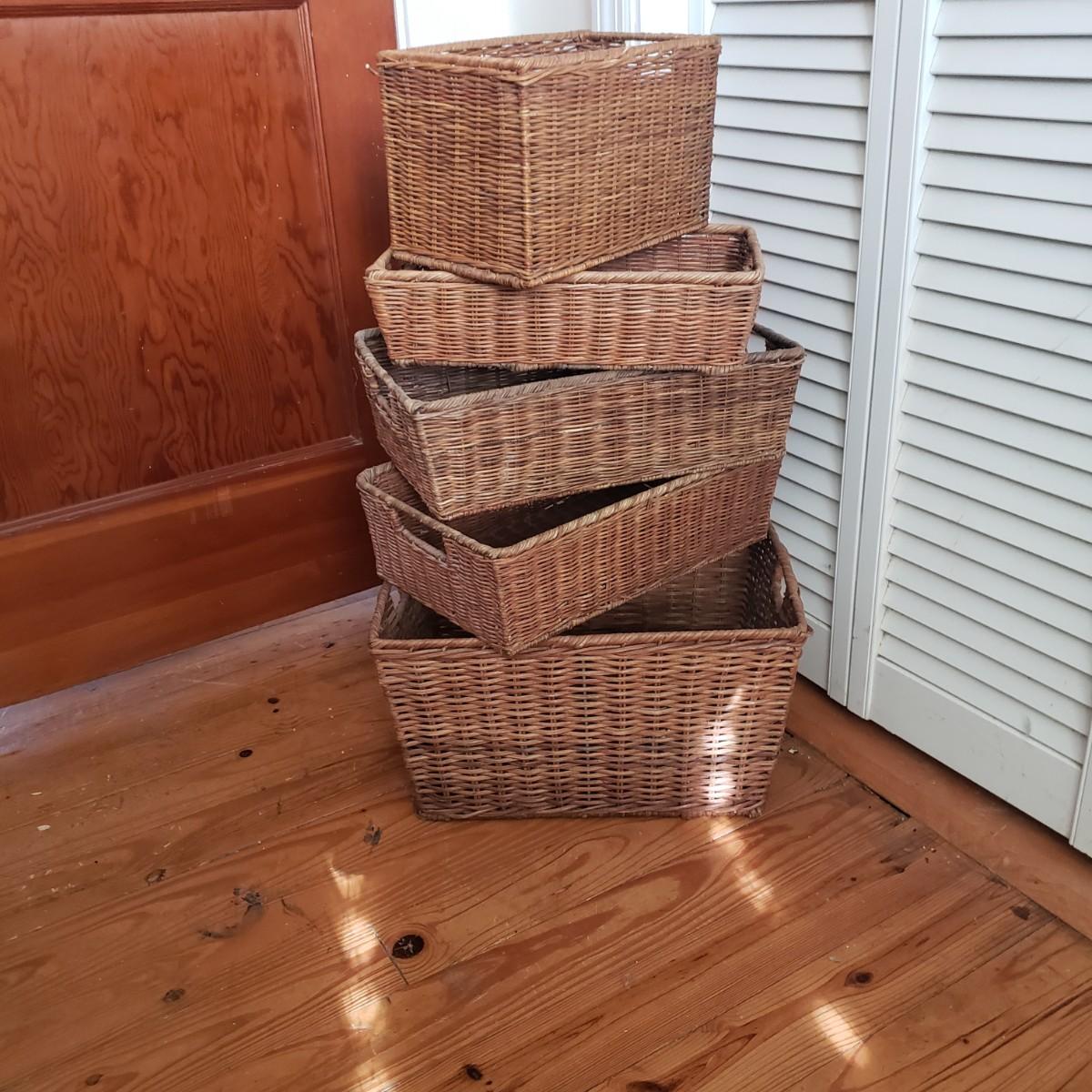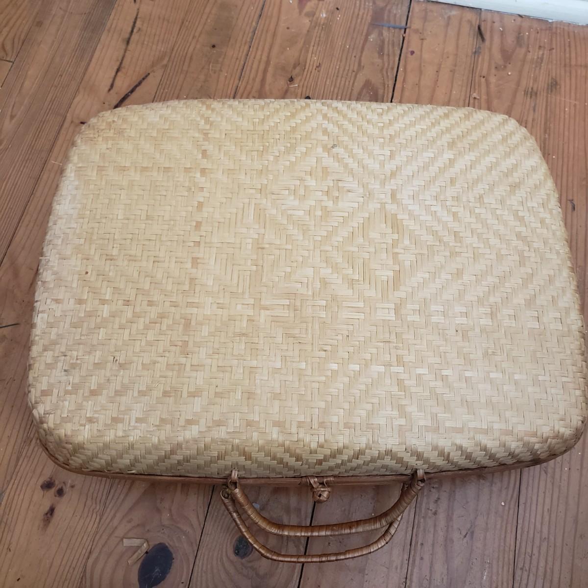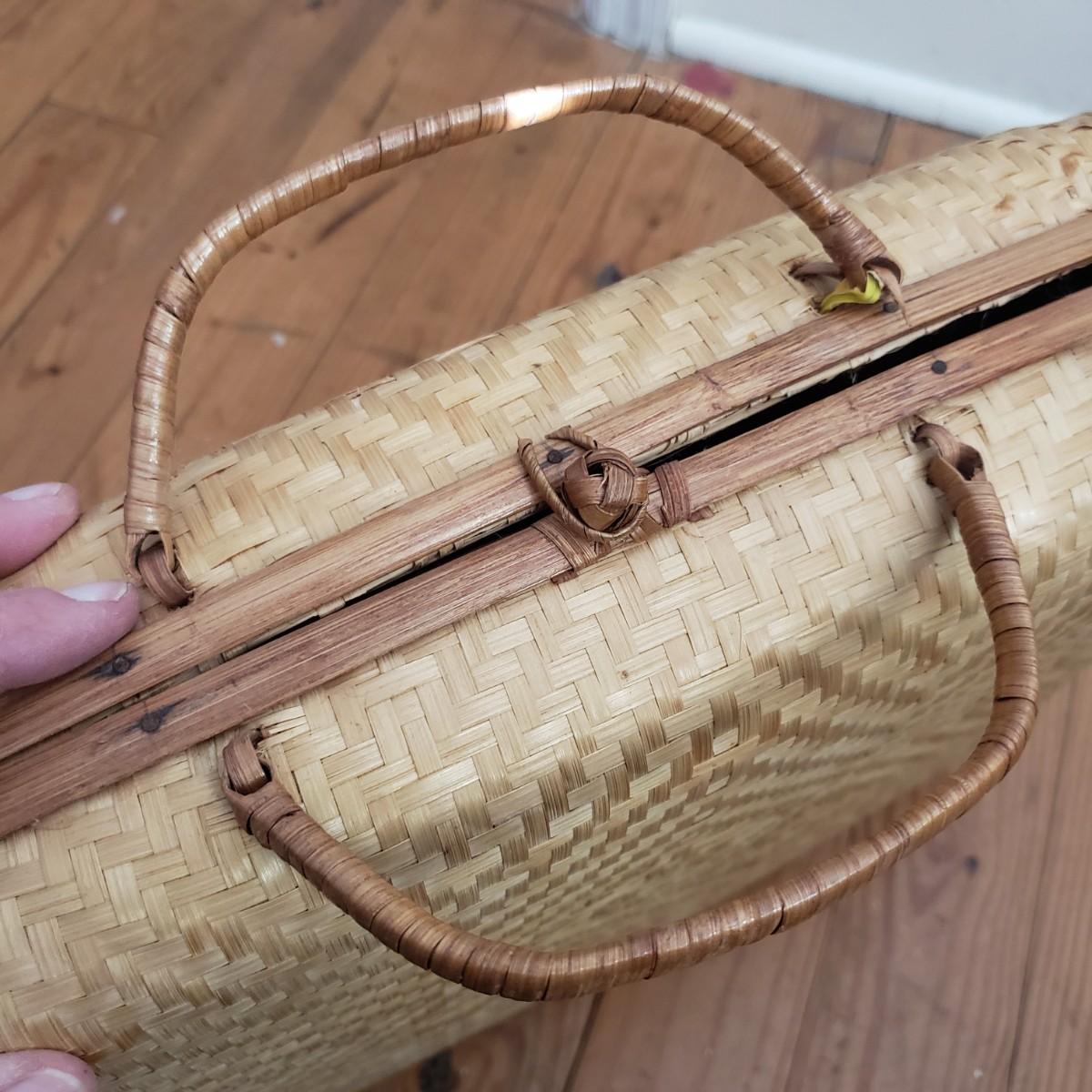 This large lot of baskets has such a variety! There is a wicker suitcase, a vintage purse, wire wrapped rectangular baskets for extra support and a handmade market basket with a leather wrapped handle. The three wicker utensil holders measure 12" x 7" x 6"H each. The purse with fabric lining the inside has "VML" embroidered on it with a sweet green velvet, yet a little faded, bow.