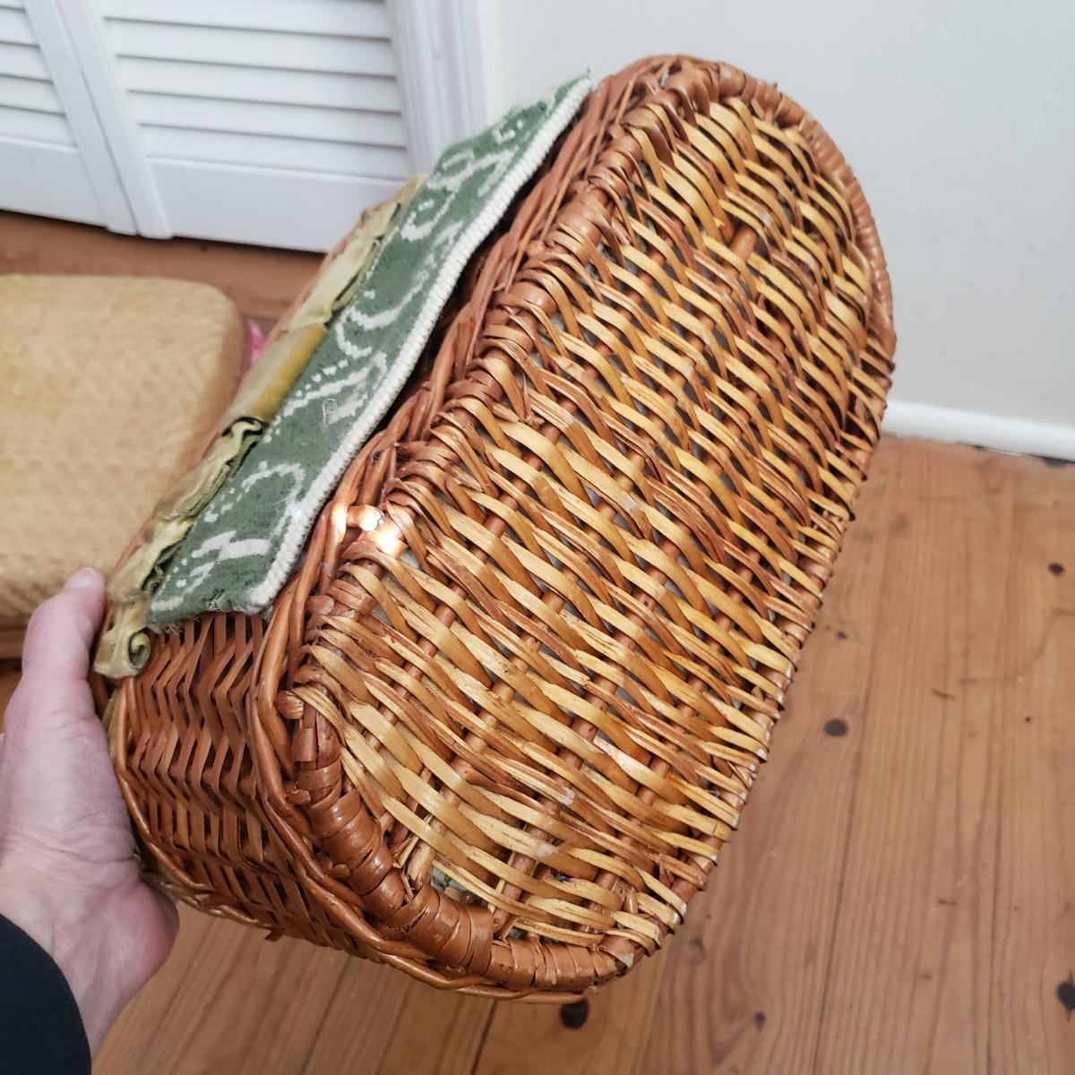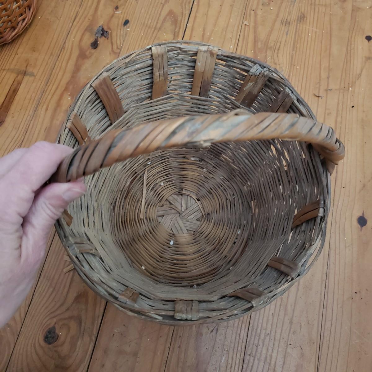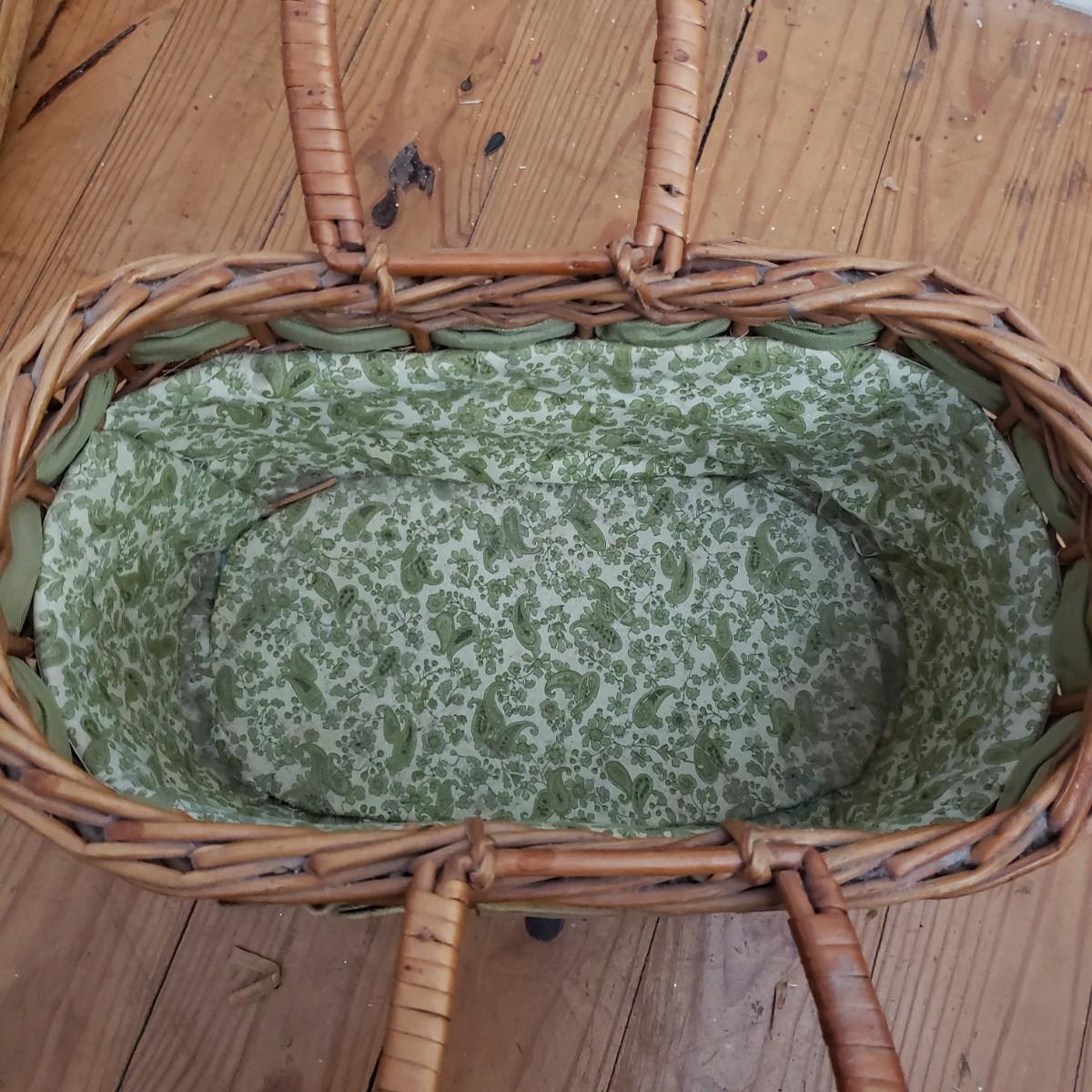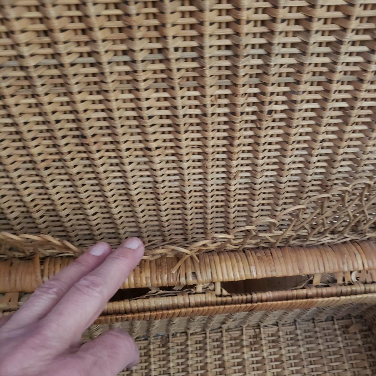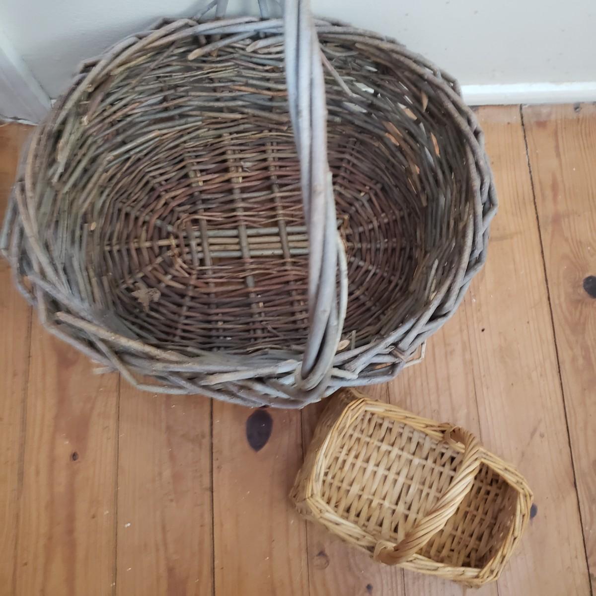 This large lot of baskets has such a variety! There is a wicker suitcase, a vintage purse, wire wrapped rectangular baskets for extra support and a handmade market basket with a leather wrapped handle. The three wicker utensil holders measure 12" x 7" x 6"H each. The purse with fabric lining the inside has "VML" embroidered on it with a sweet green velvet, yet a little faded, bow.