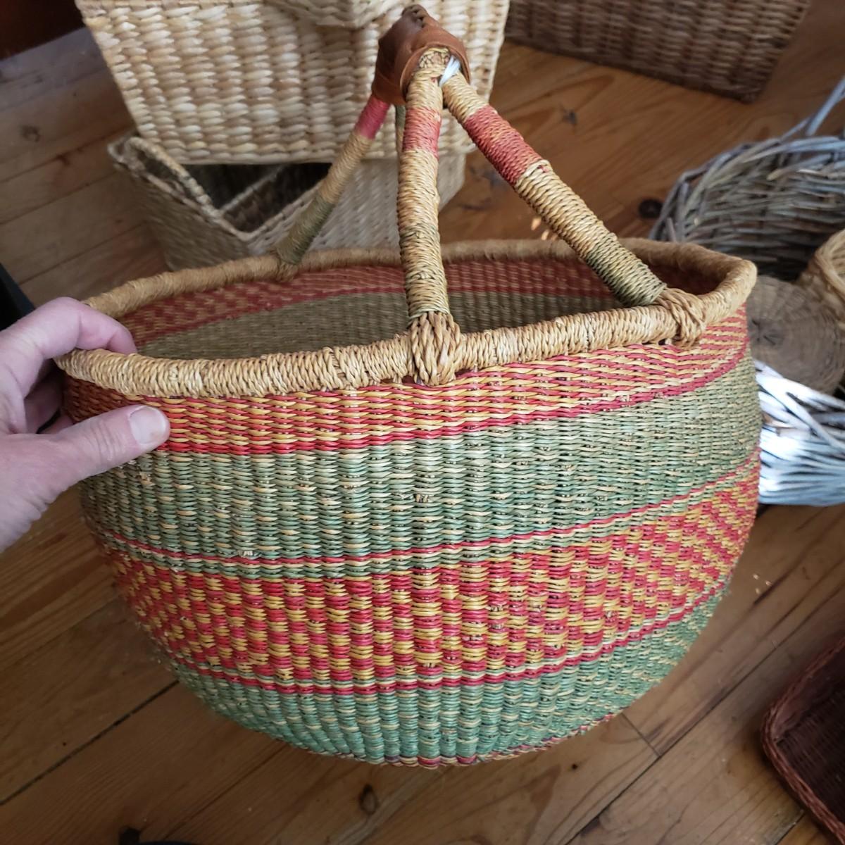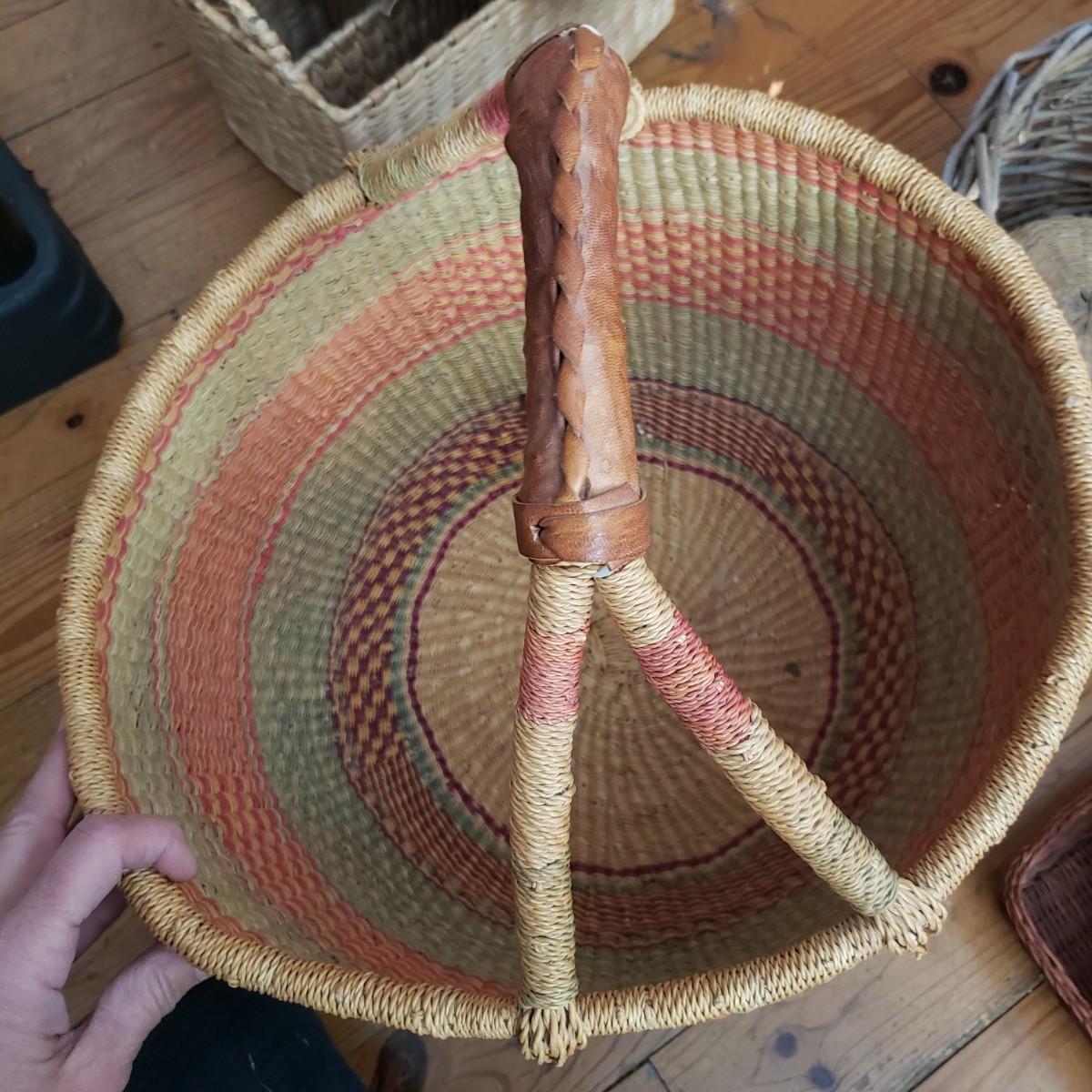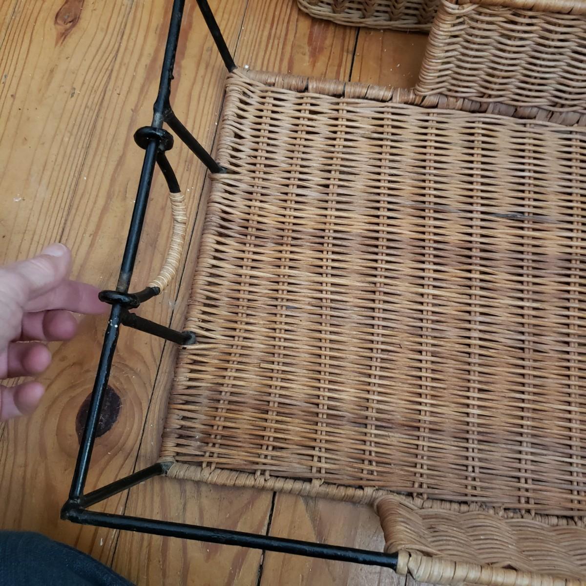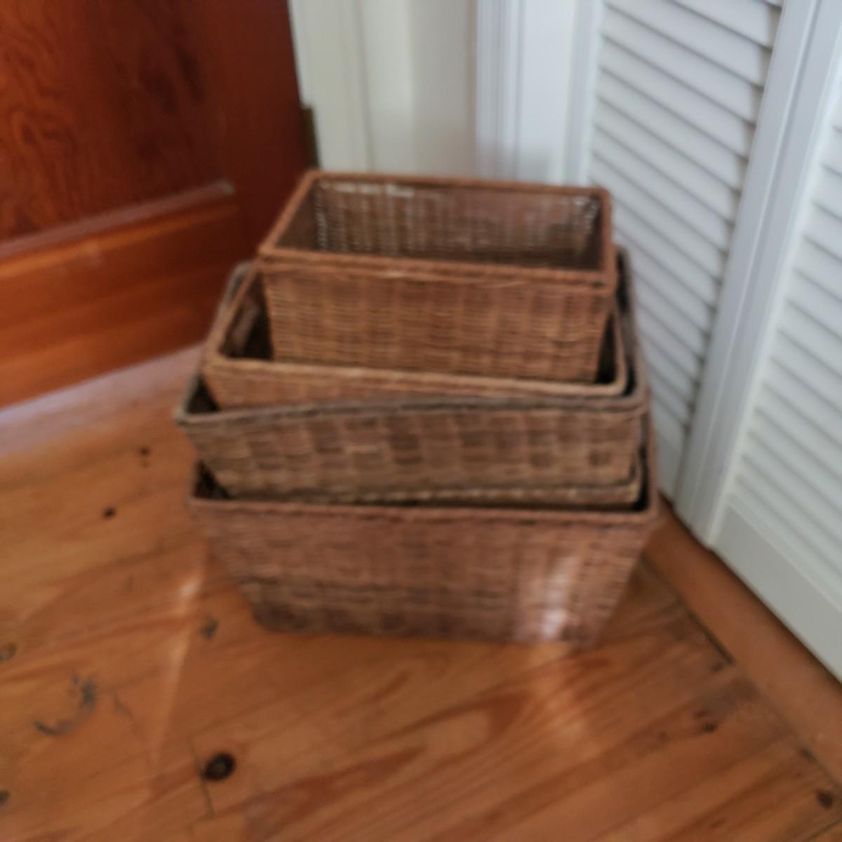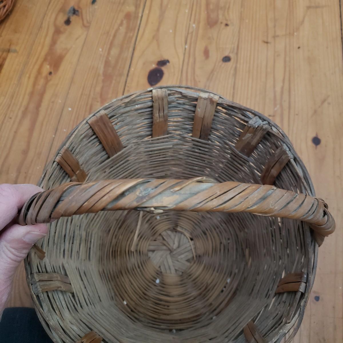 This large lot of baskets has such a variety! There is a wicker suitcase, a vintage purse, wire wrapped rectangular baskets for extra support and a handmade market basket with a leather wrapped handle. The three wicker utensil holders measure 12" x 7" x 6"H each. The purse with fabric lining the inside has "VML" embroidered on it with a sweet green velvet, yet a little faded, bow.