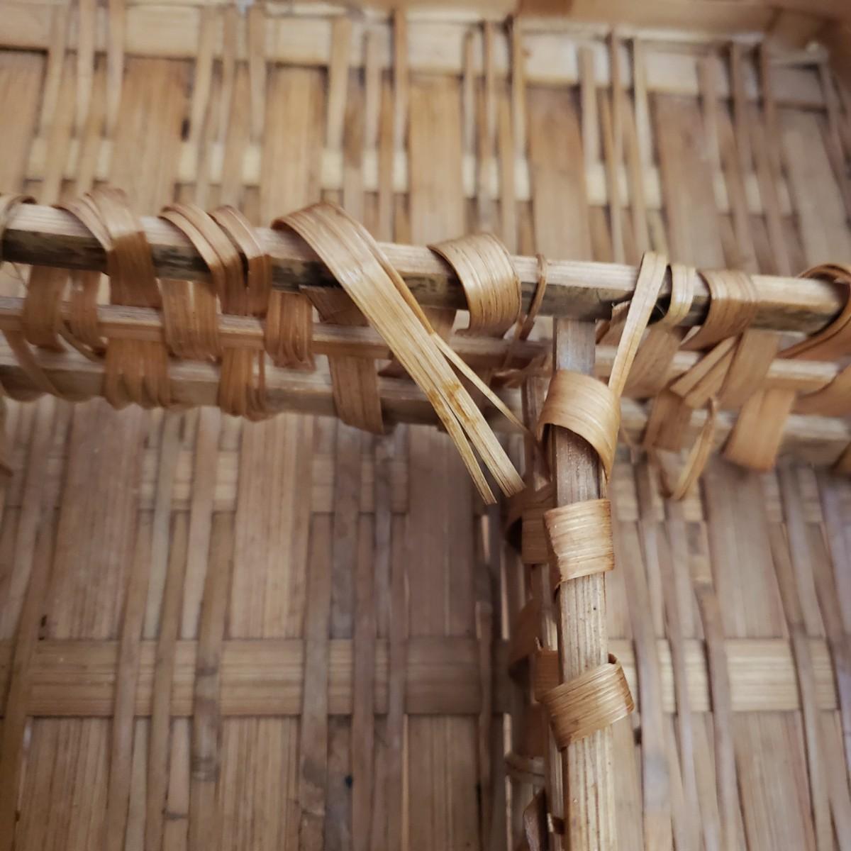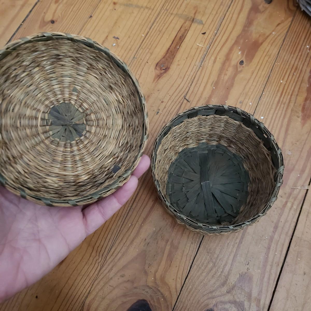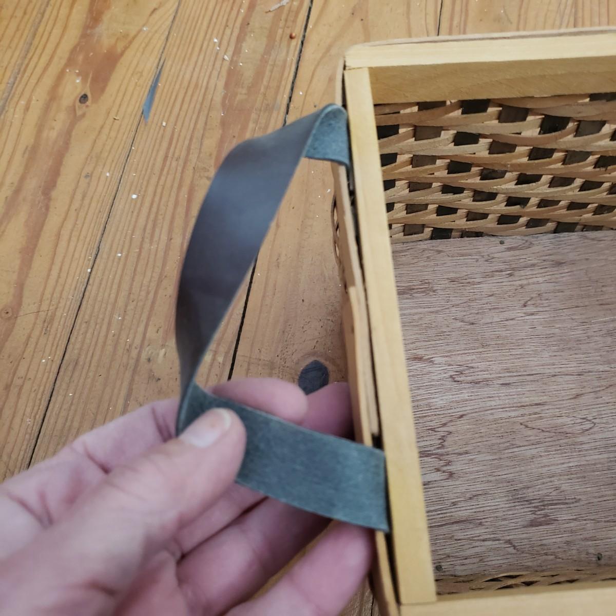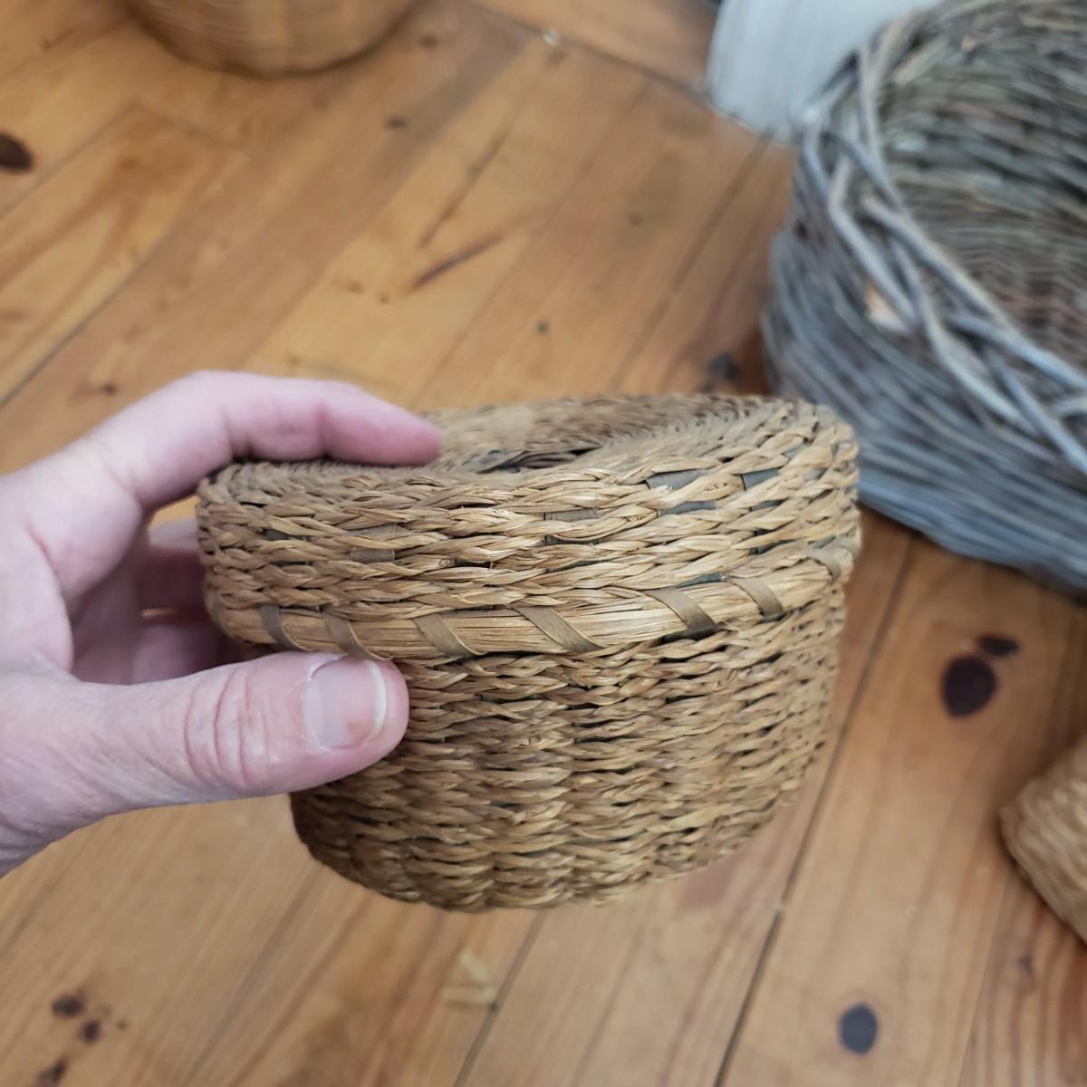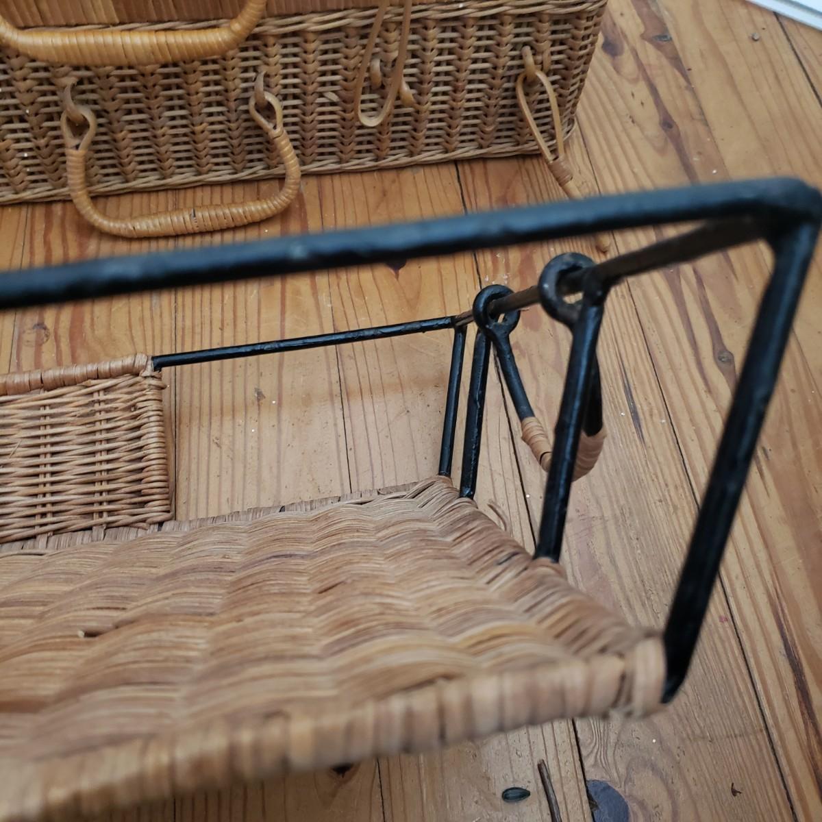This large lot of baskets has such a variety! There is a wicker suitcase, a vintage purse, wire wrapped rectangular baskets for extra support and a handmade market basket with a leather wrapped handle. The three wicker utensil holders measure 12" x 7" x 6"H each. The purse with fabric lining the inside has "VML" embroidered on it with a sweet green velvet, yet a little faded, bow.