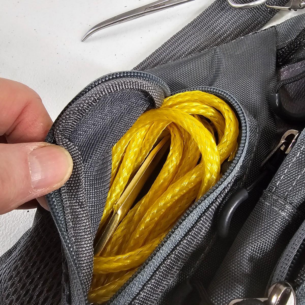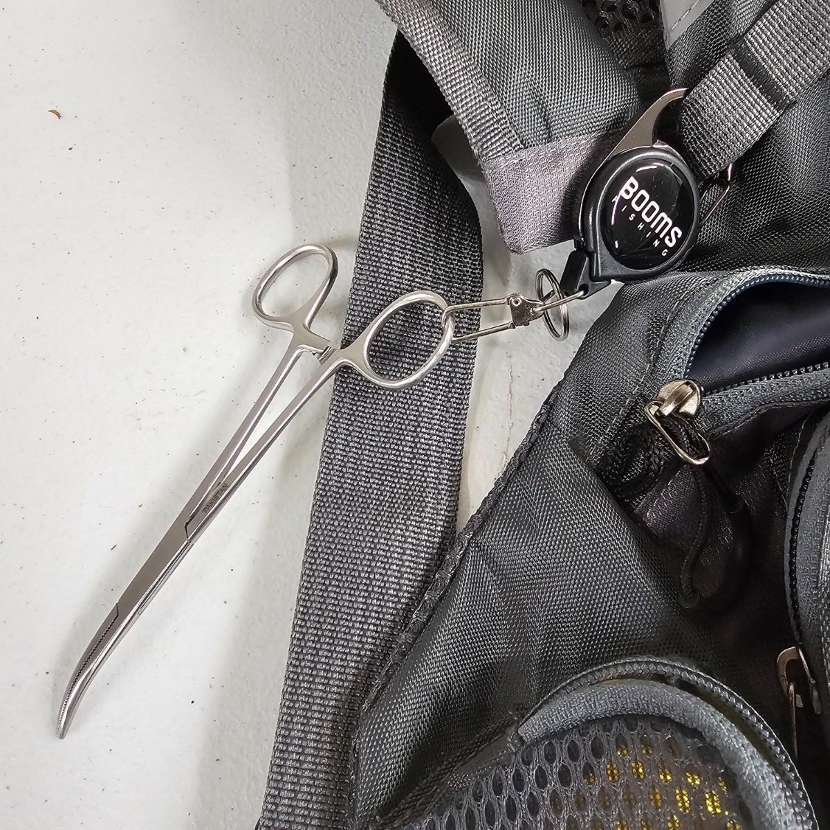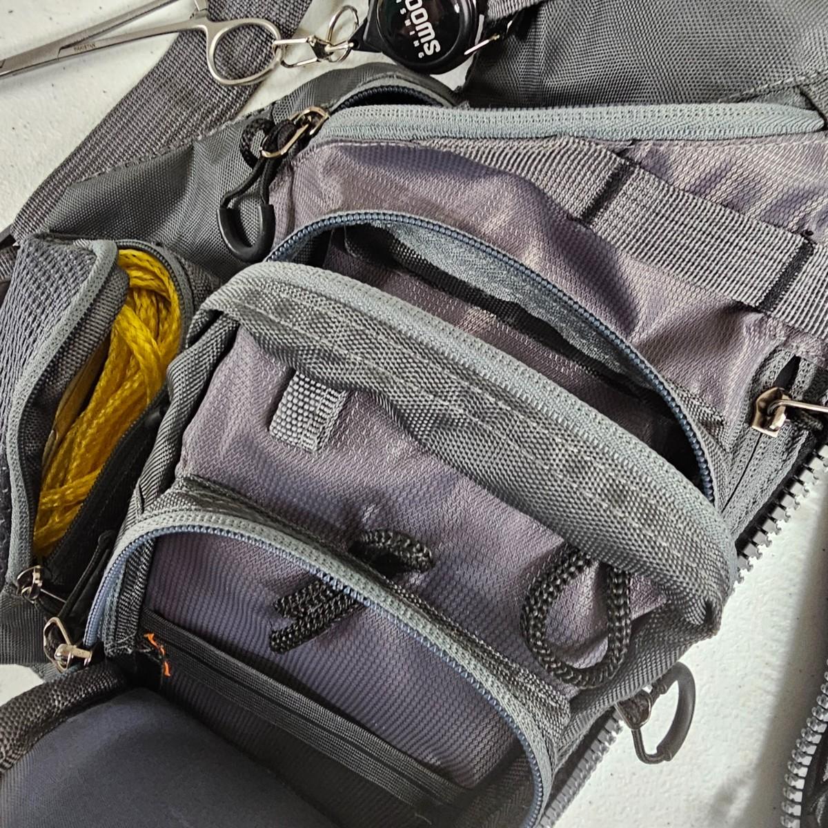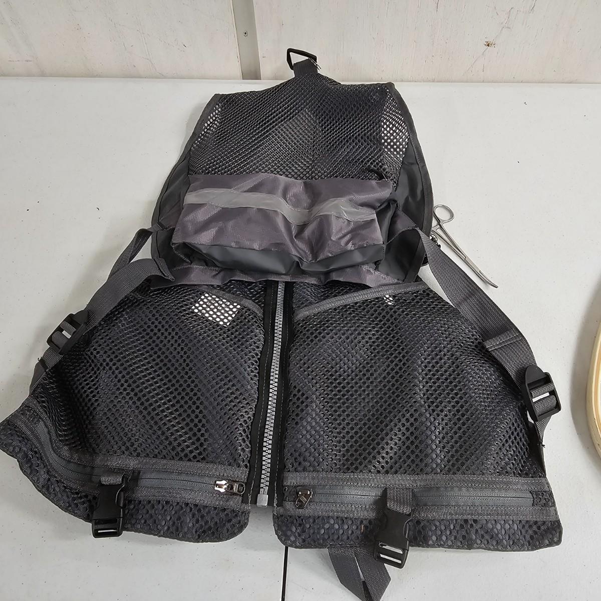 A multi pocketed mesh vest by Bassdash, this item has pockets inside pockets all over. Open back design for cool and comfort, vest measures 20" x 26". Comes with attached forceps, scissors and more. Also a fiberglass laminated landing net by Cortland with a stretchy plastic net. Measures 11" x 24". See photos for details. Shipping available.