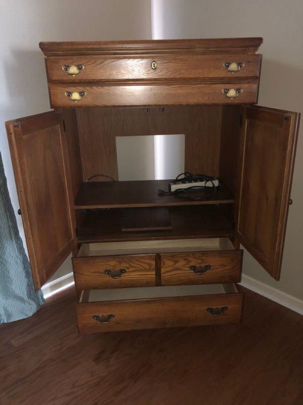 Queen bedroom set includes: bed with head/foot boards. 1 Door Chest 40wx20dx64h, 1 triple dresser with 8 drawers 64wx19dx35h, and mirror 48x46. This furniture is in excellent condition. Would retail for 6200+ Must be picked up in Broussard.