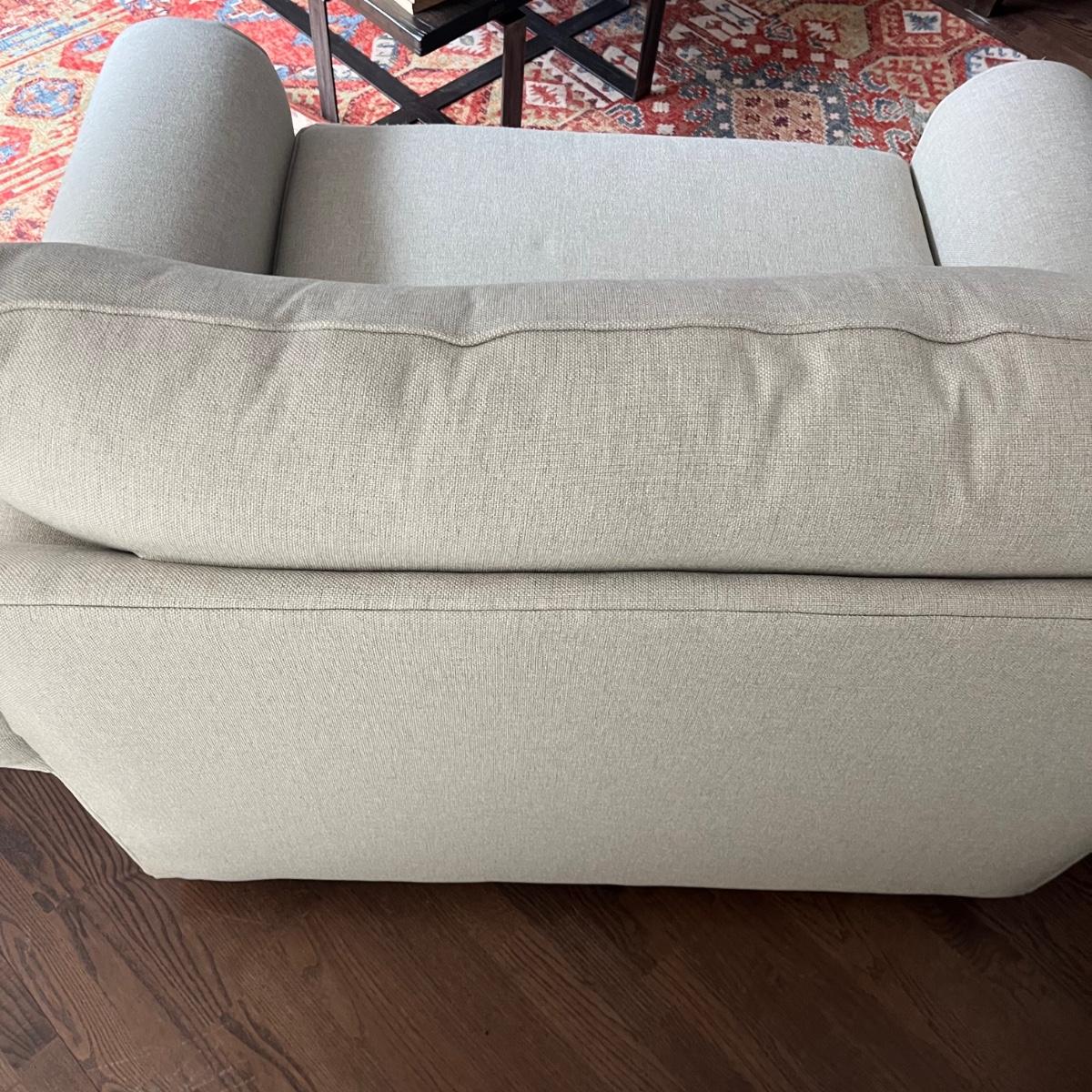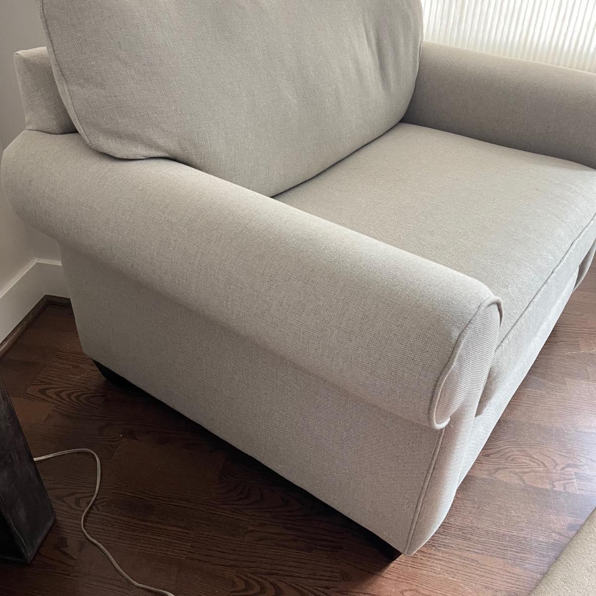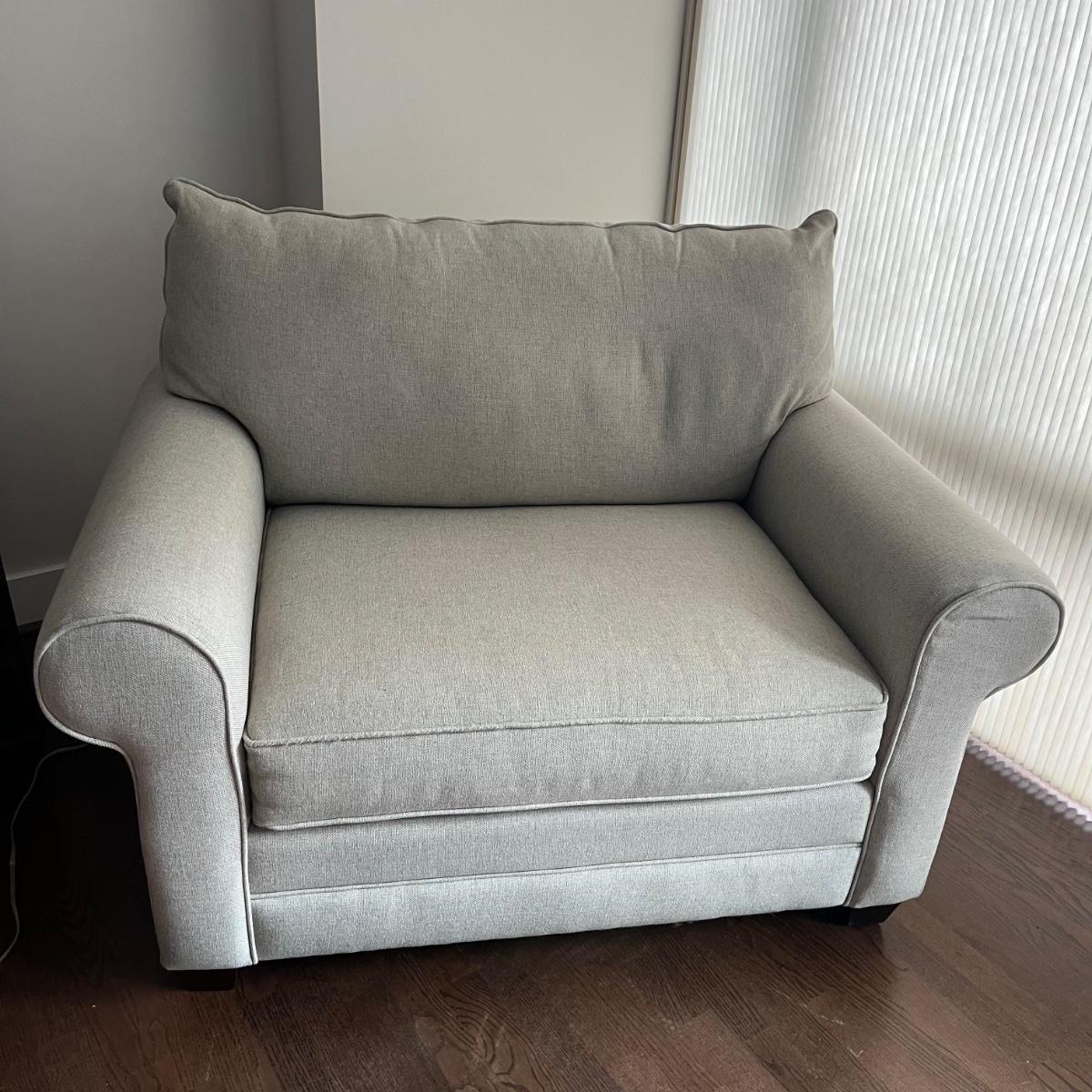 Lot includes a large Bassett fabric arm chair with rolled arms and wooden feet. A very pale grey/cream color chair in excellent condition and measures 36” x 52” x 38” with a 19” seat height.