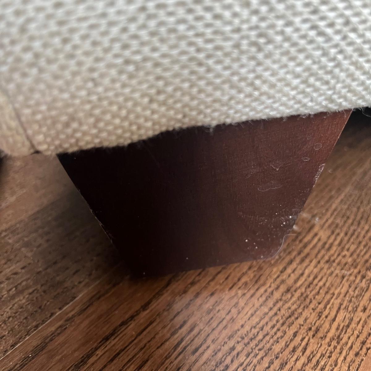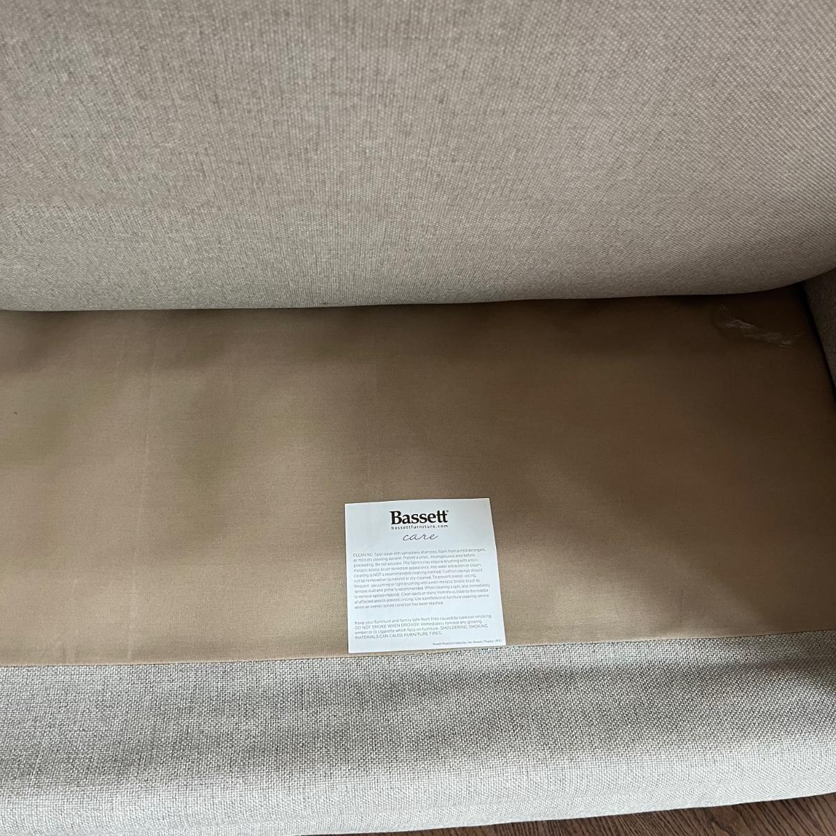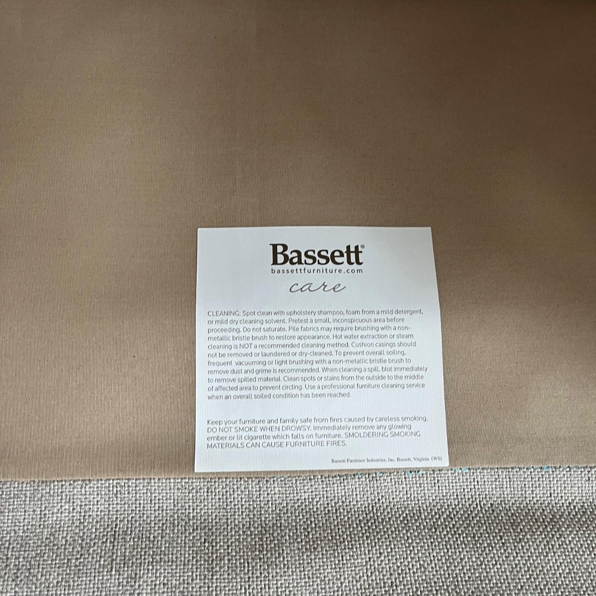 Lot includes a large Bassett fabric arm chair with rolled arms and wooden feet. A very pale grey/cream color chair in excellent condition and measures 36” x 52” x 38” with a 19” seat height.