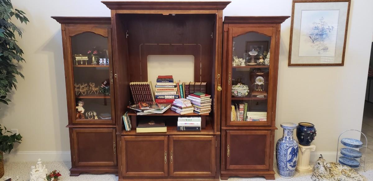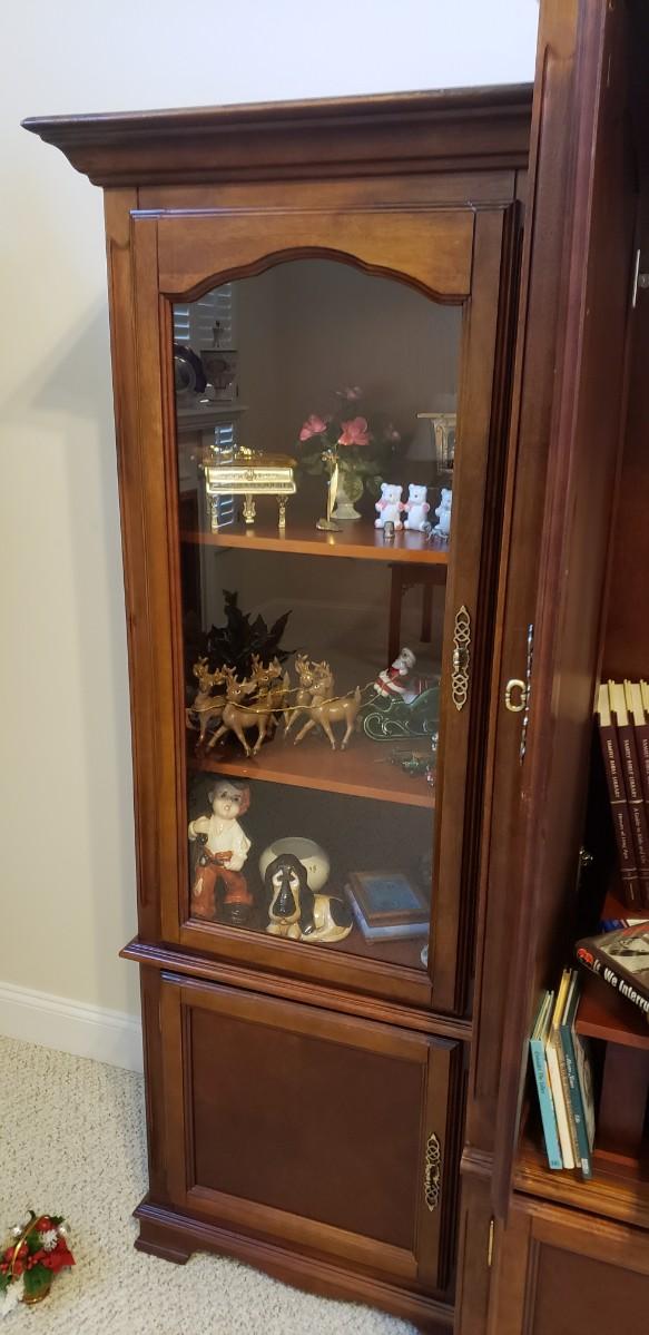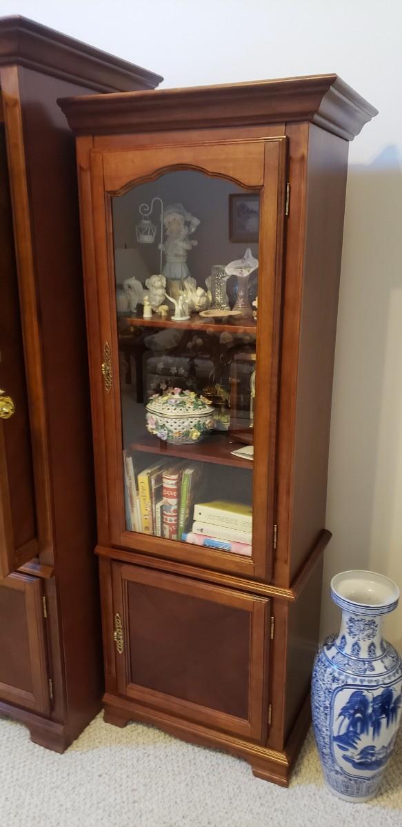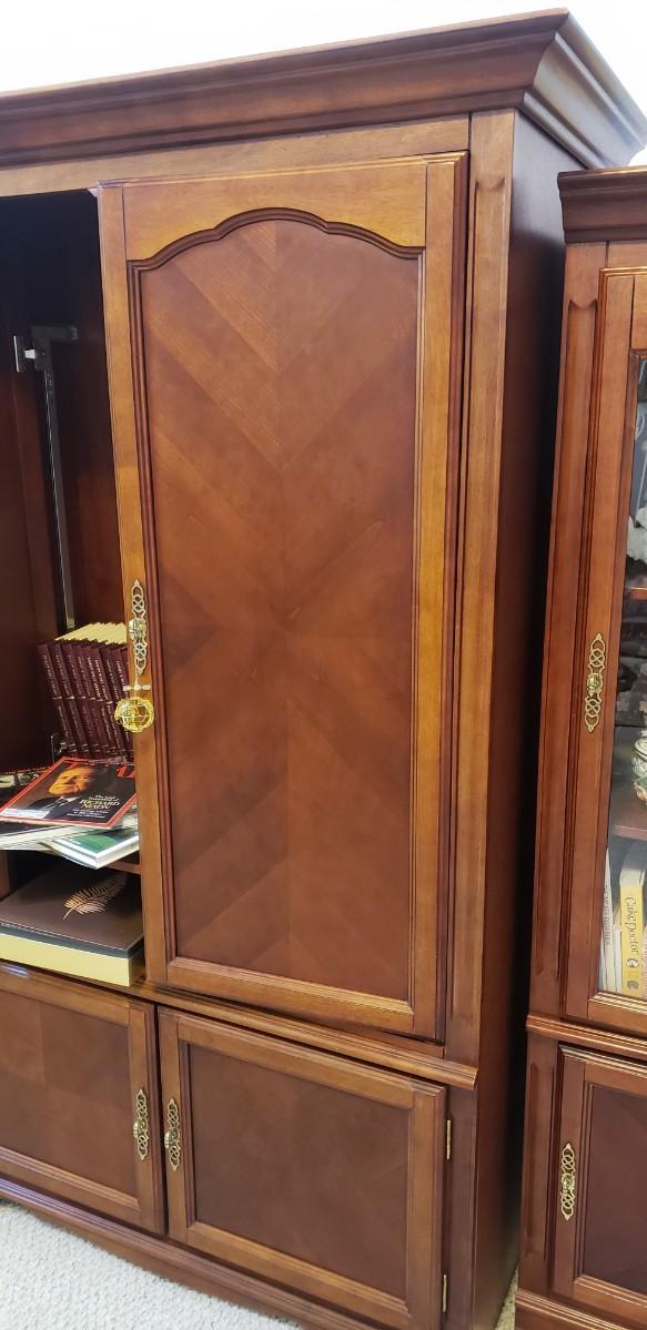 The 2 sides sections offer 1 door on the bottom with 2 shelves & 1 glass door with 3 shelves. They each measure 23" x 16 1/2" x 69 1/2".