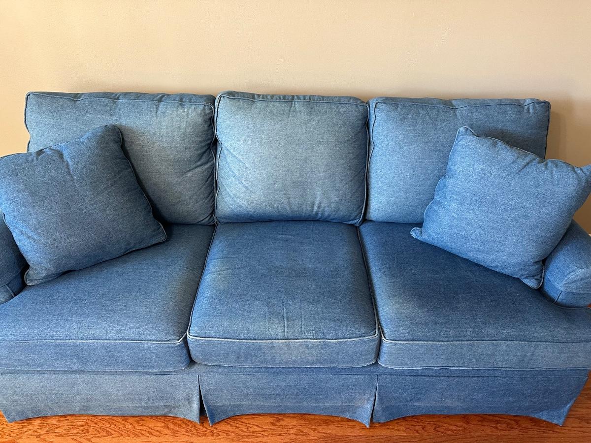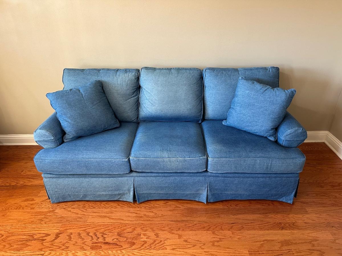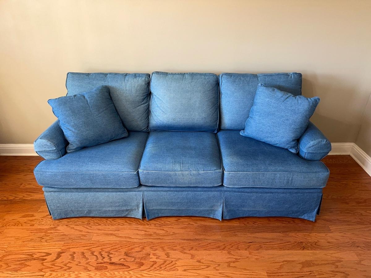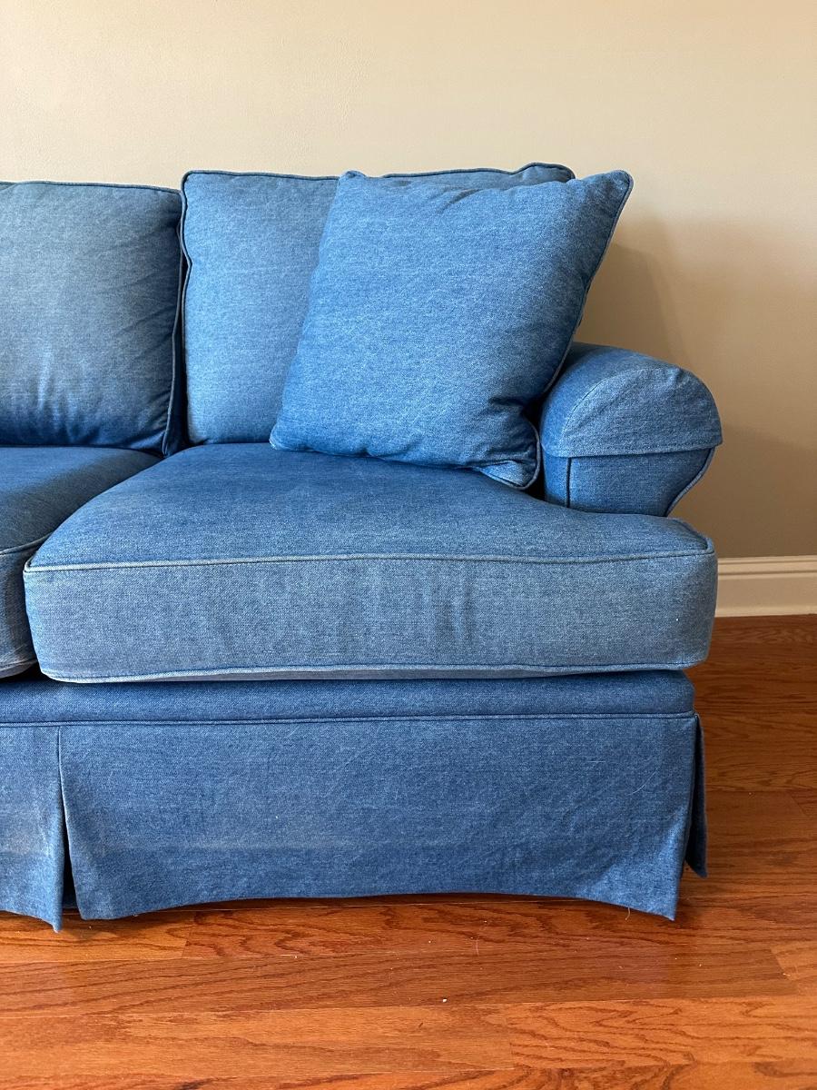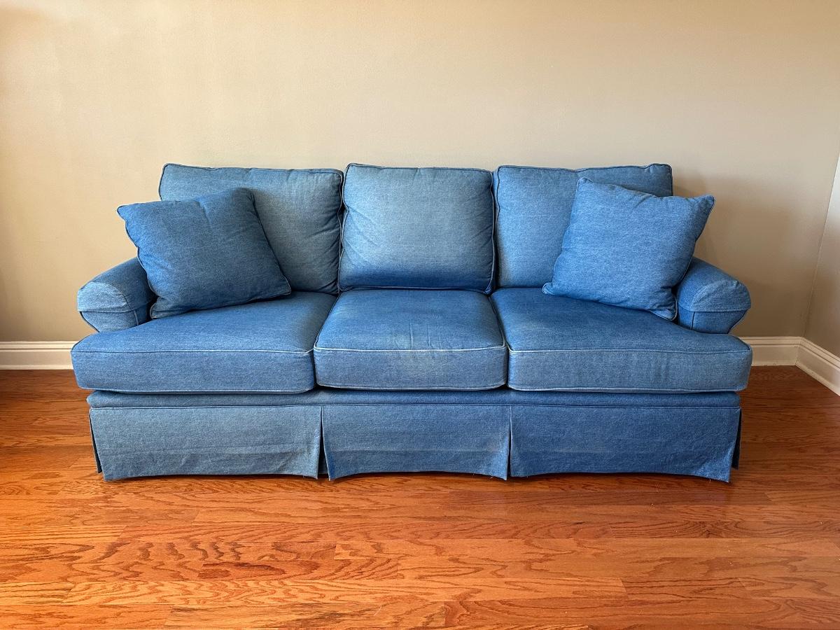 Bassett Denim Blue Skirted Sofa with Rolled Arms & Cushions