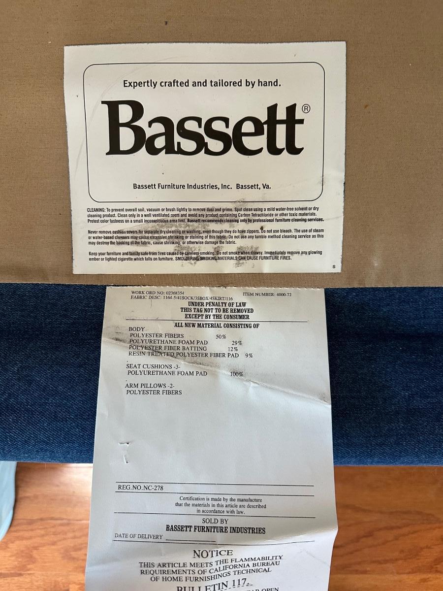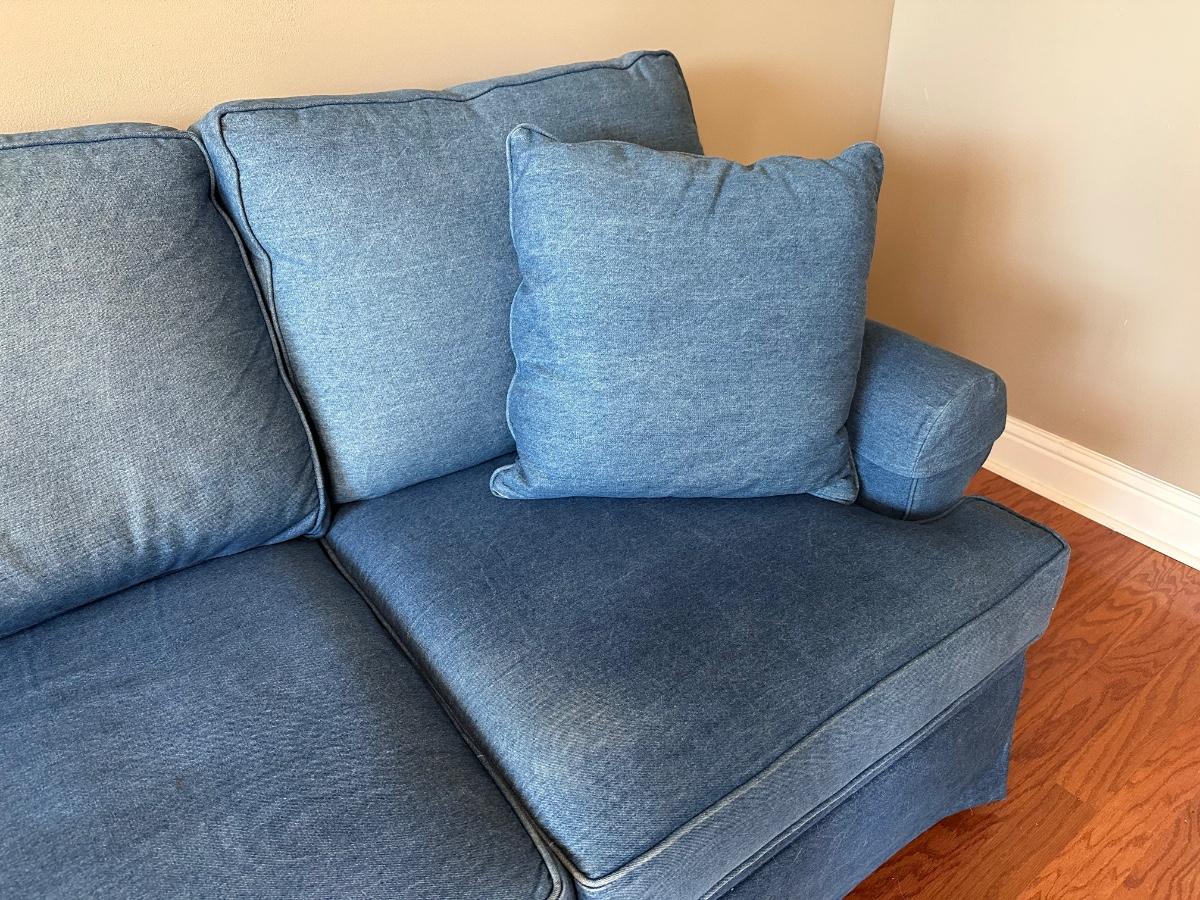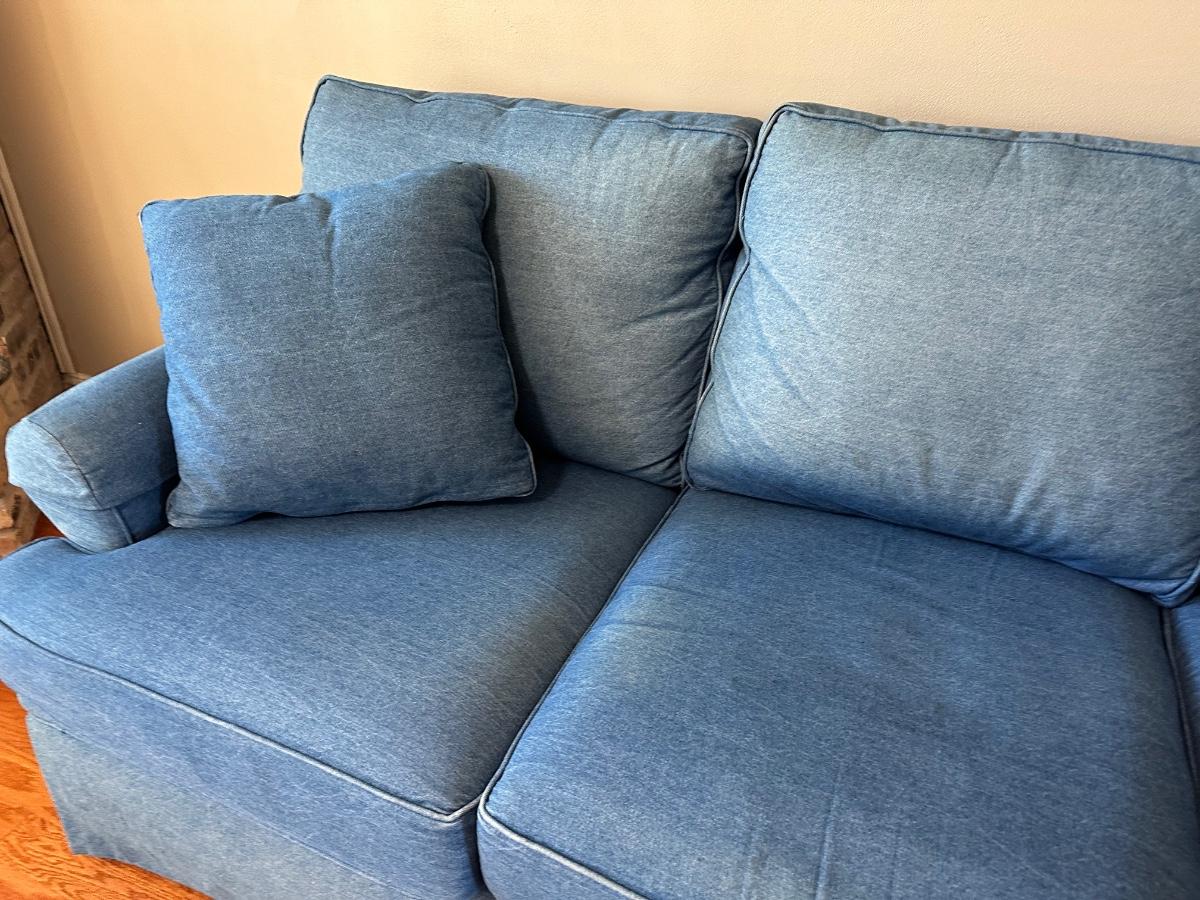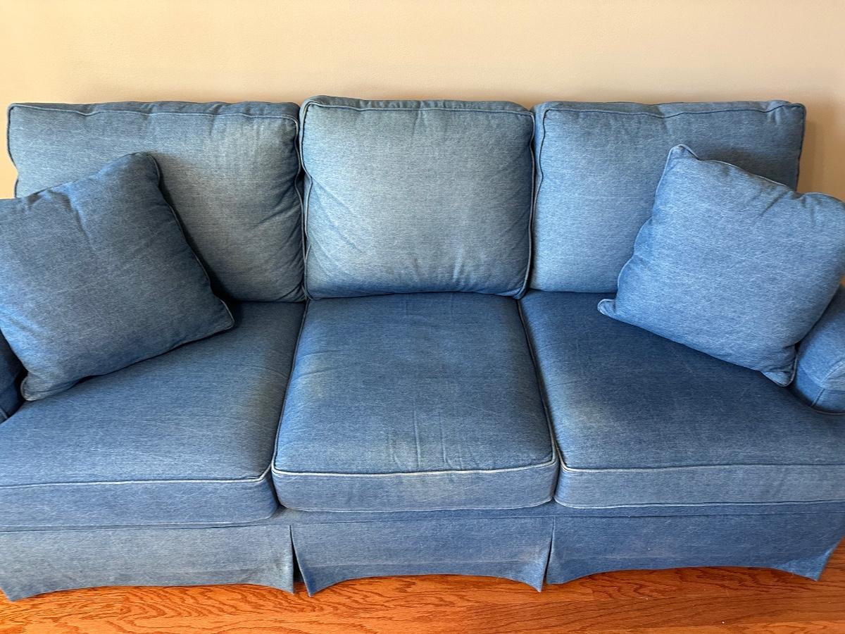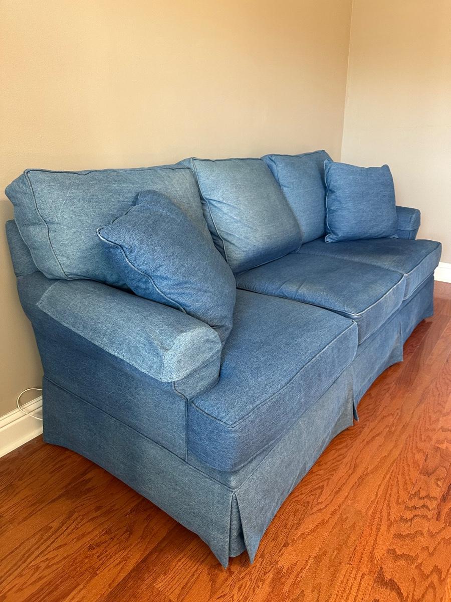 Bassett Denim Blue Skirted Sofa with Rolled Arms & Cushions