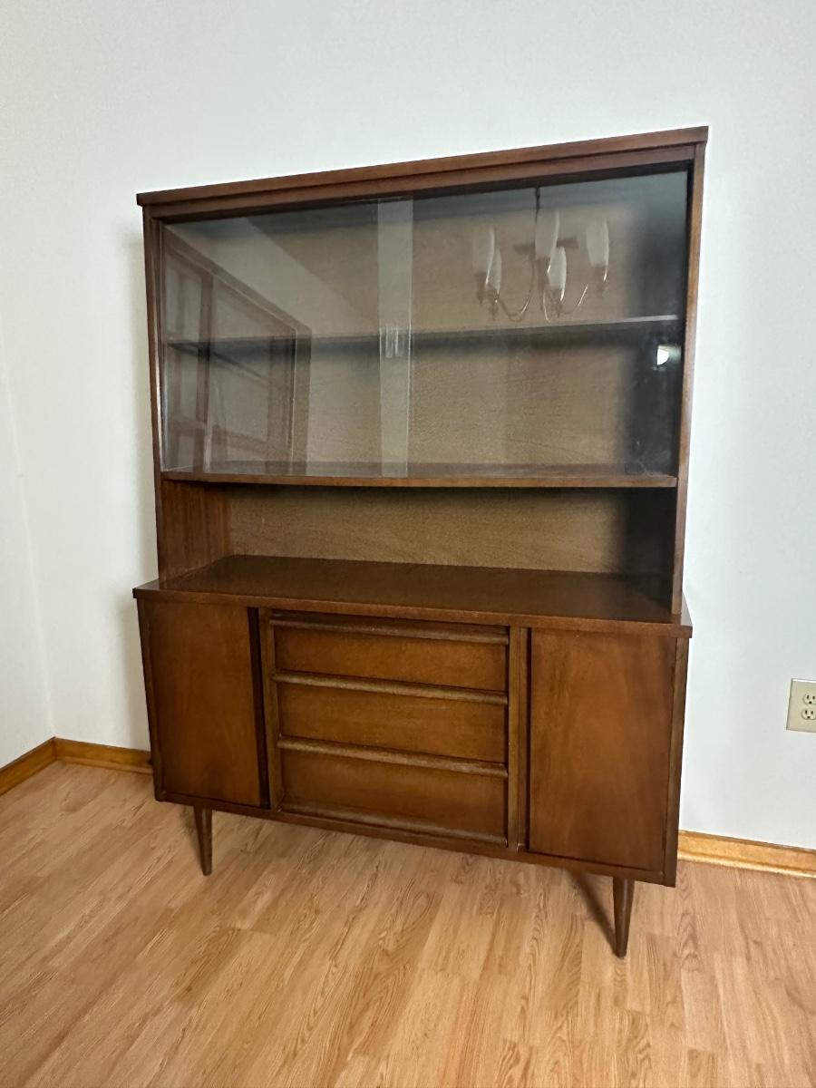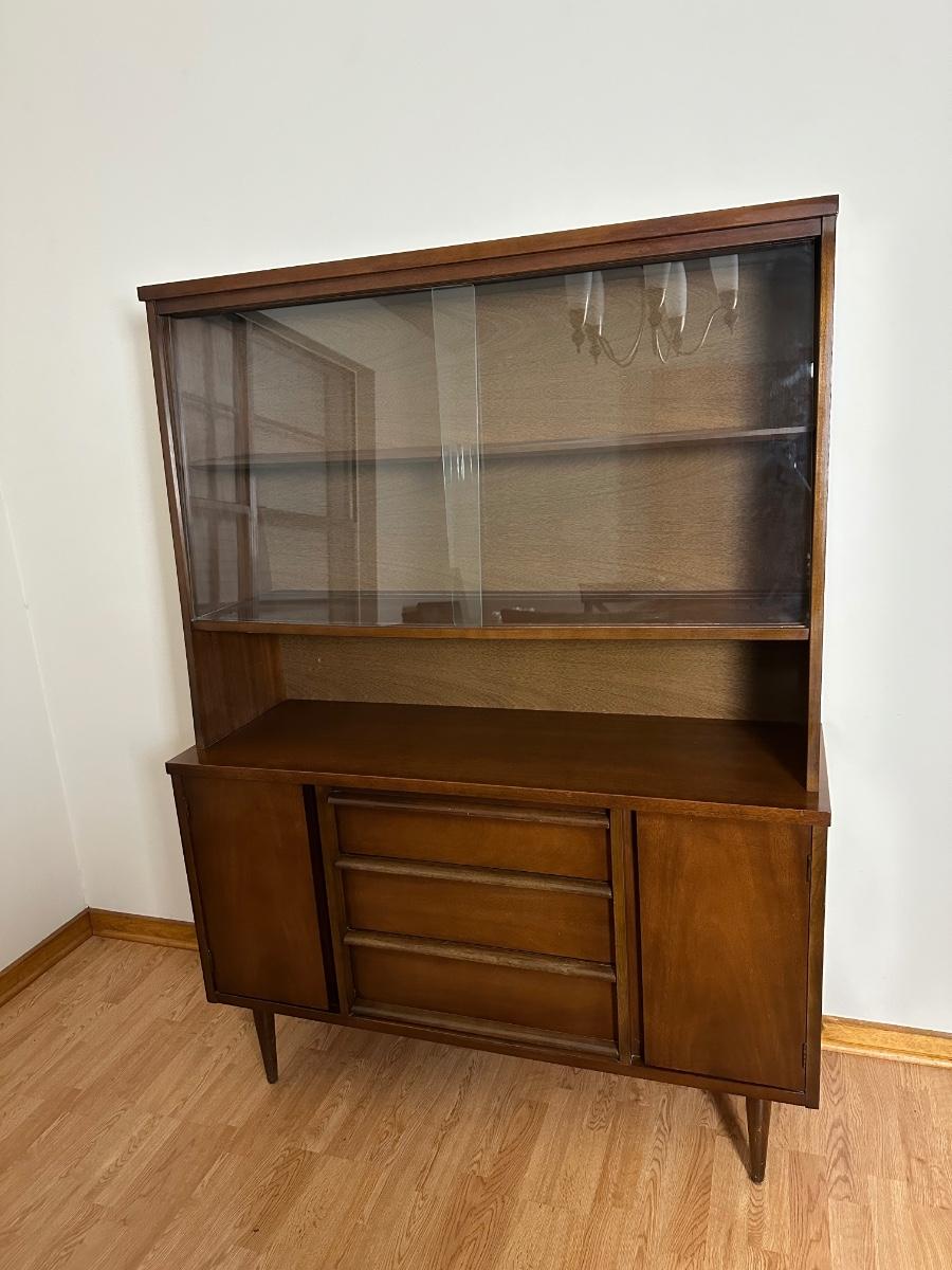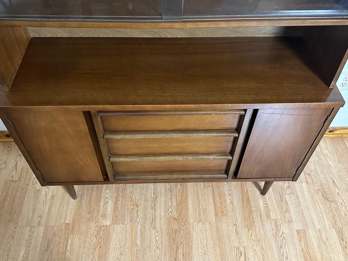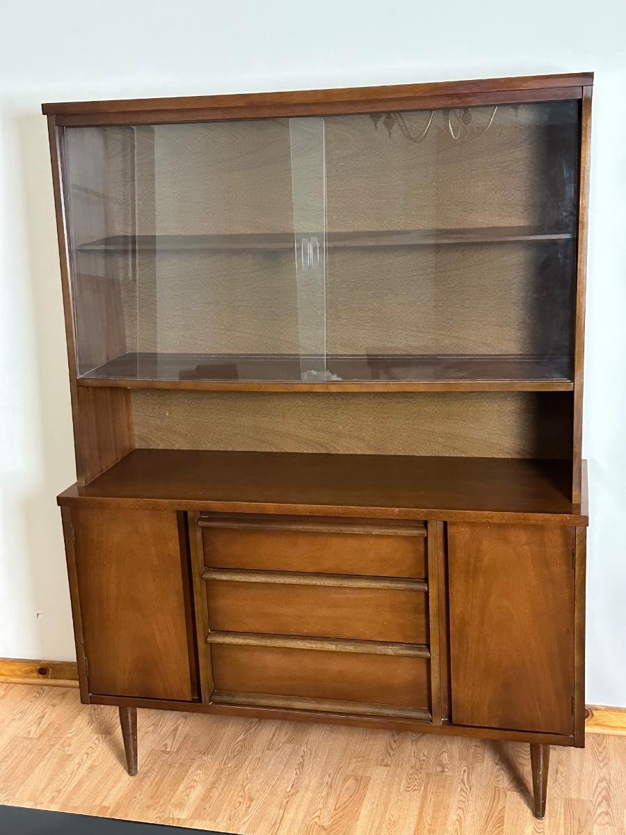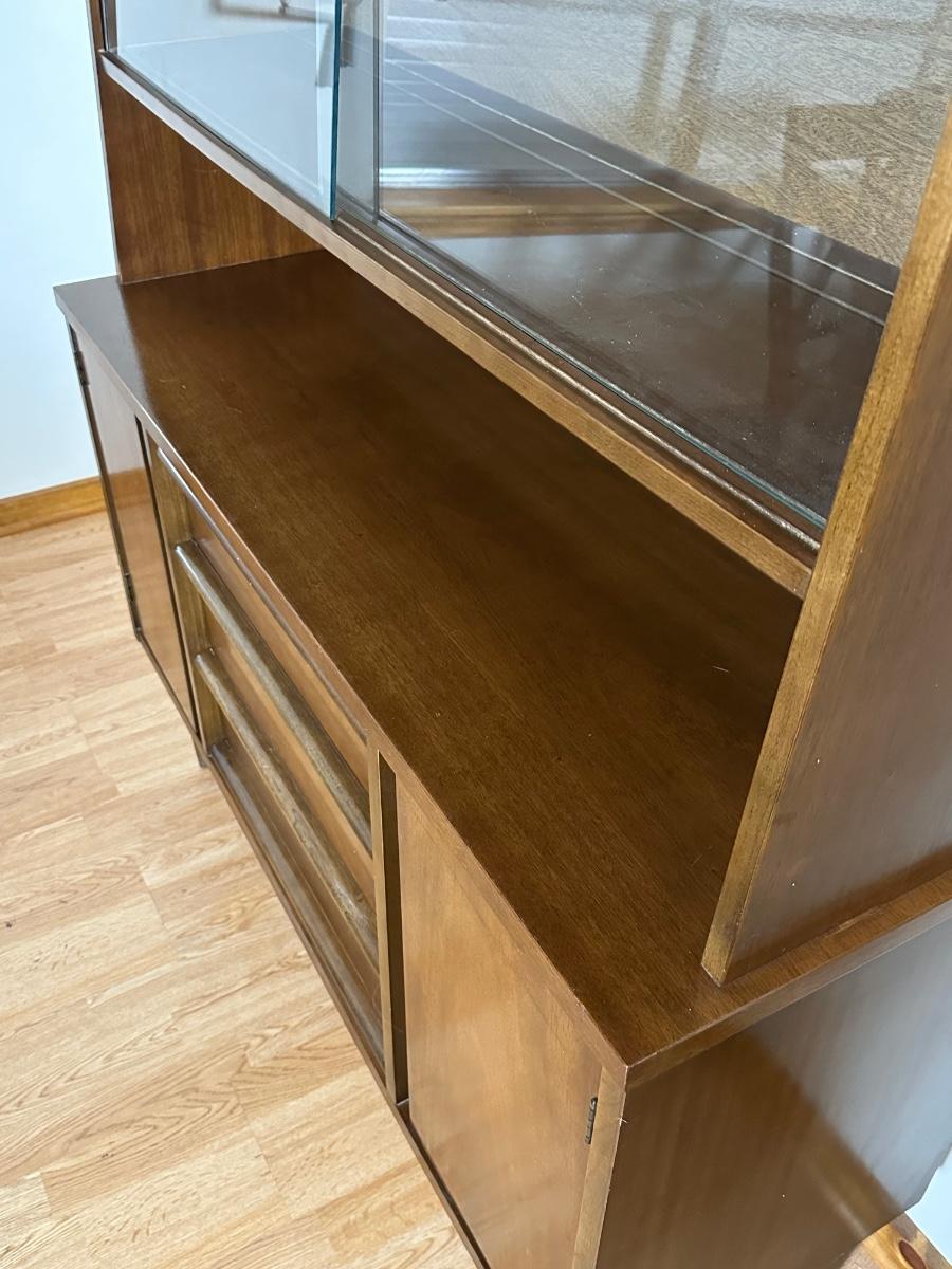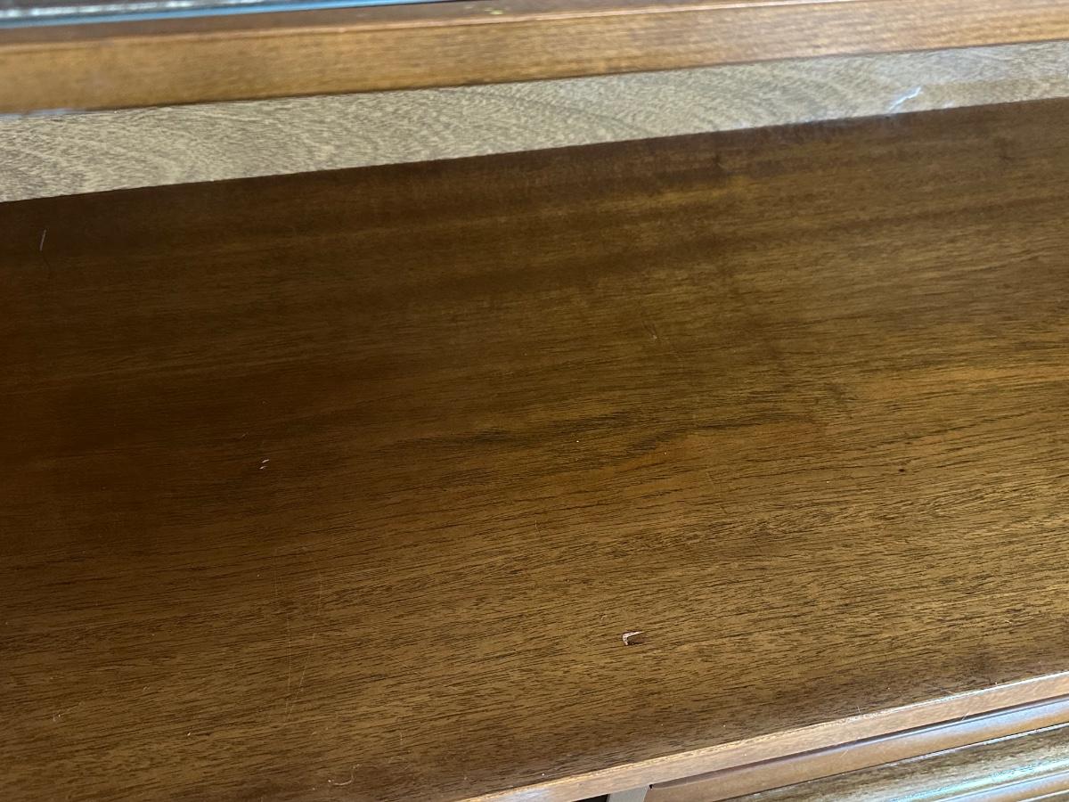 Very good condition with light wear consistent with age. Shows a small nick to the wood surface (see photos). The sliding glass doors currently do not glide smoothly and could use new track liners for easier movement and secure fit.