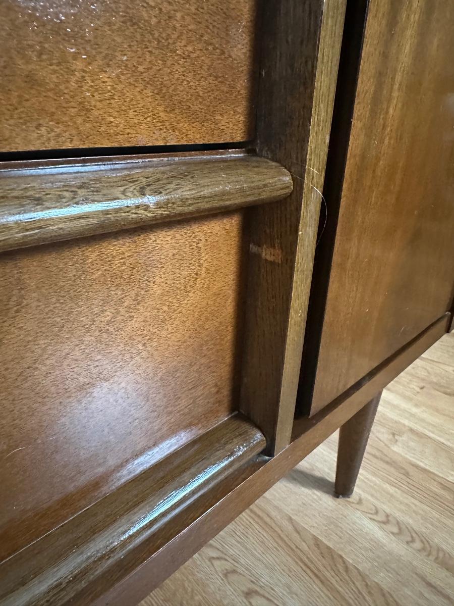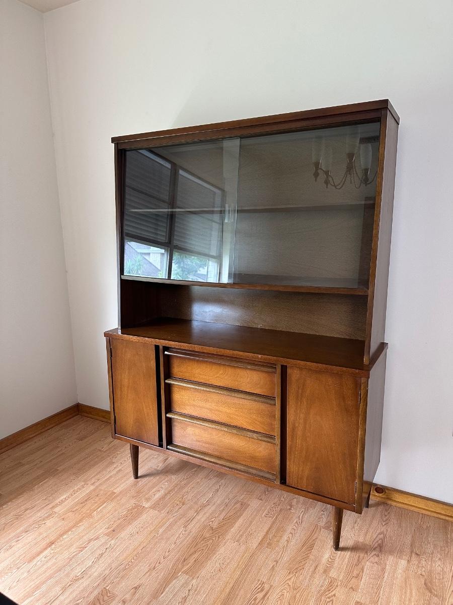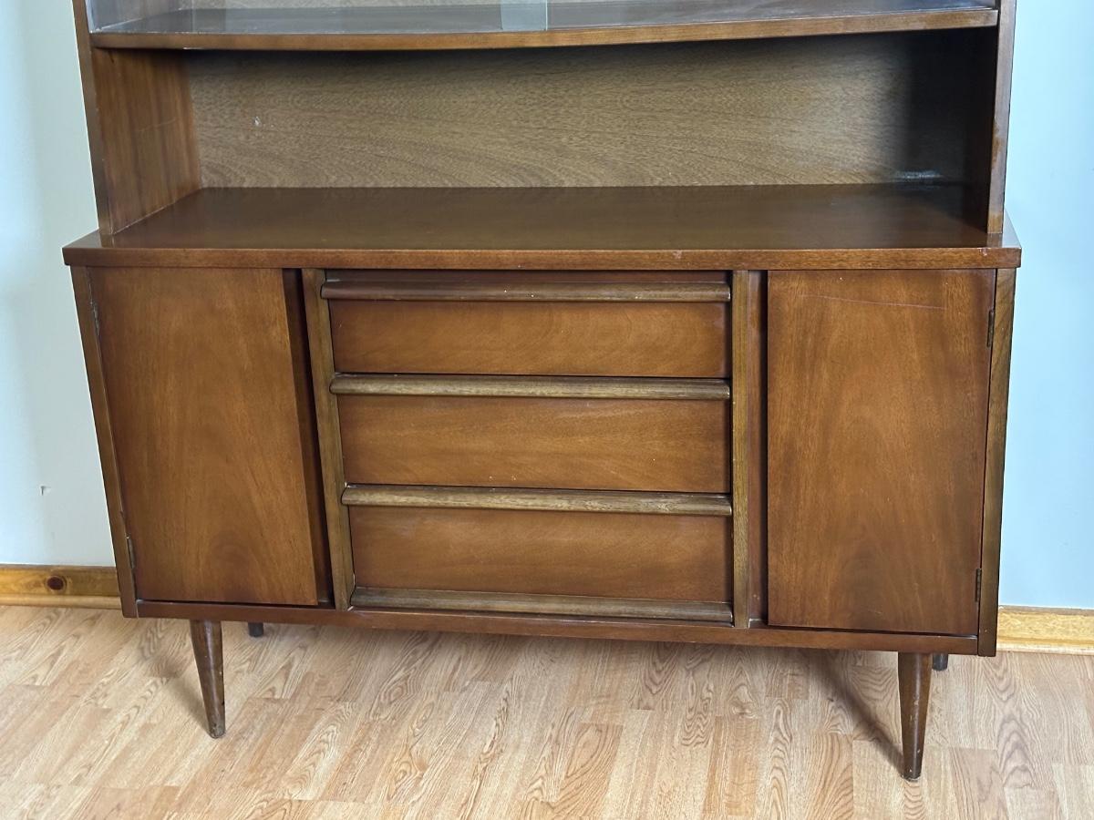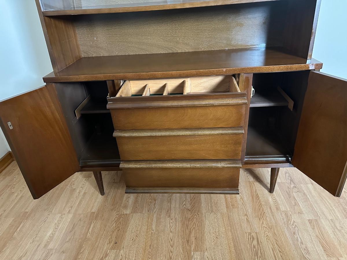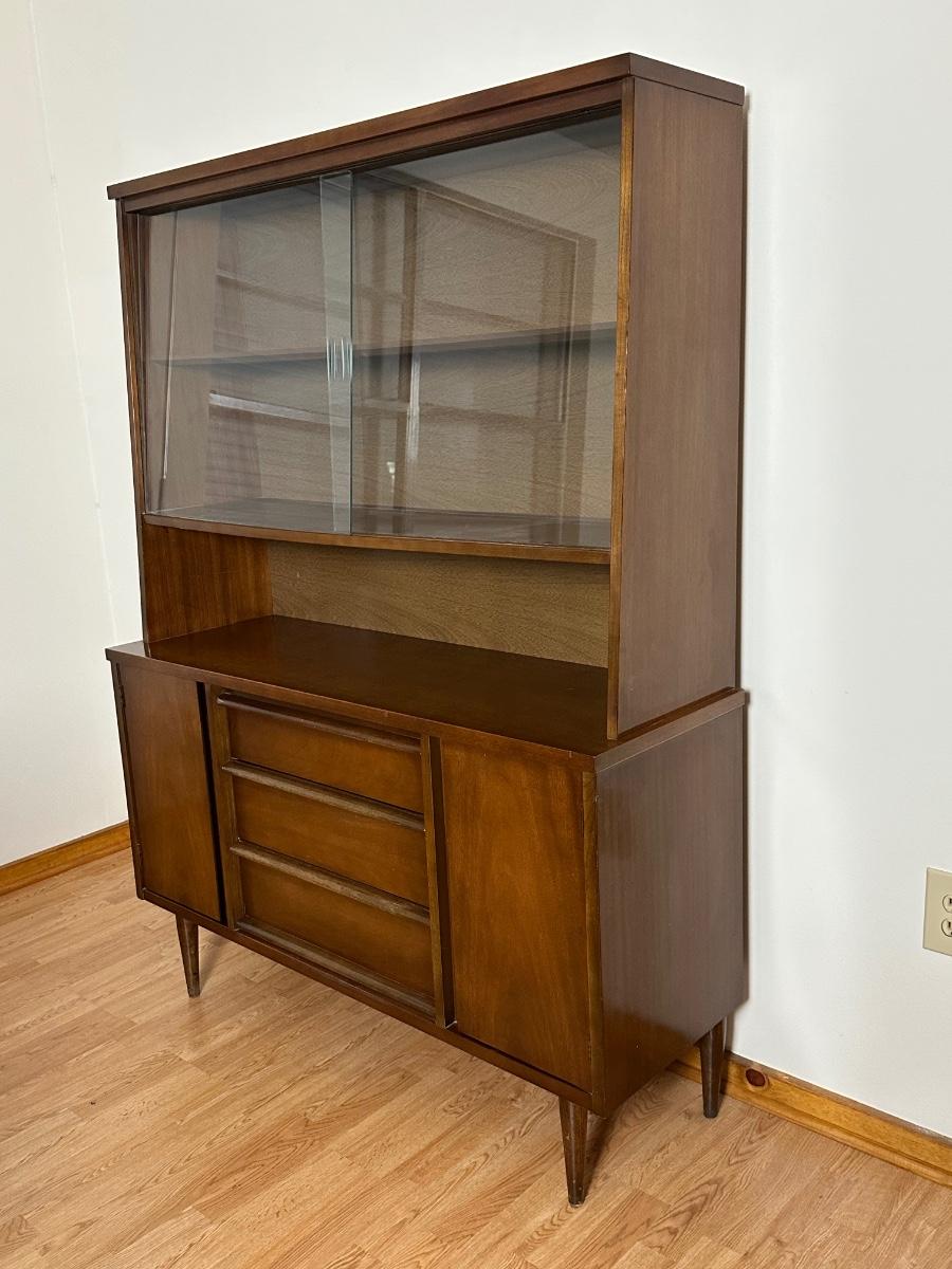Very good condition with light wear consistent with age. Shows a small nick to the wood surface (see photos). The sliding glass doors currently do not glide smoothly and could use new track liners for easier movement and secure fit.