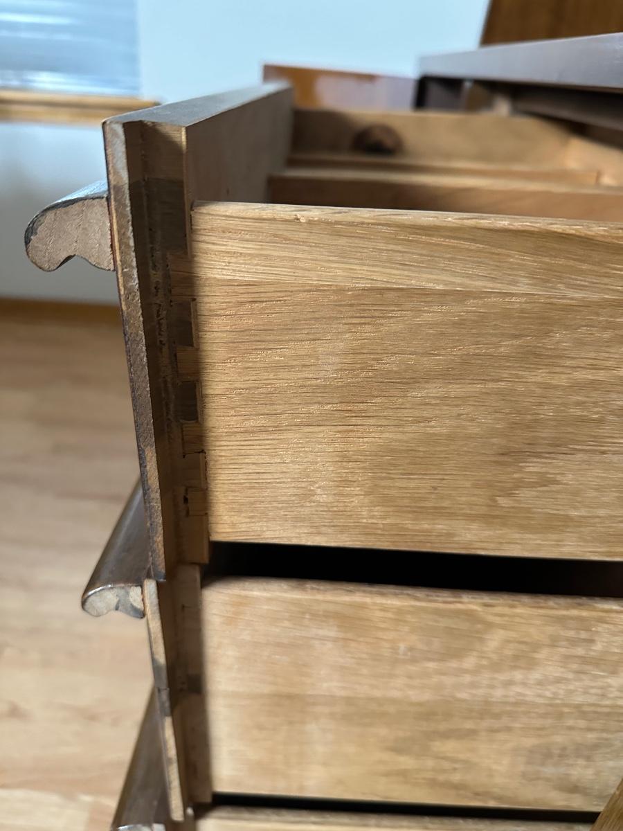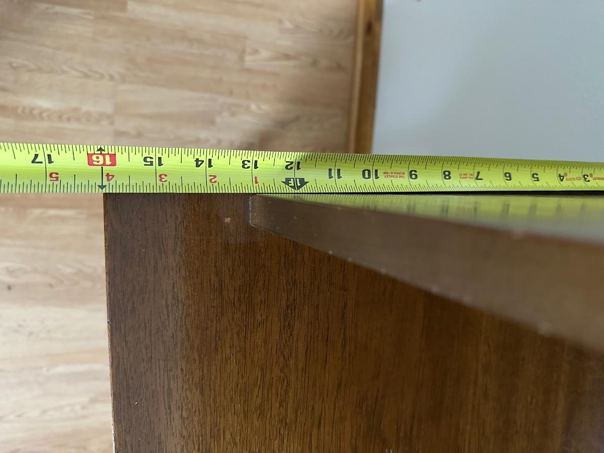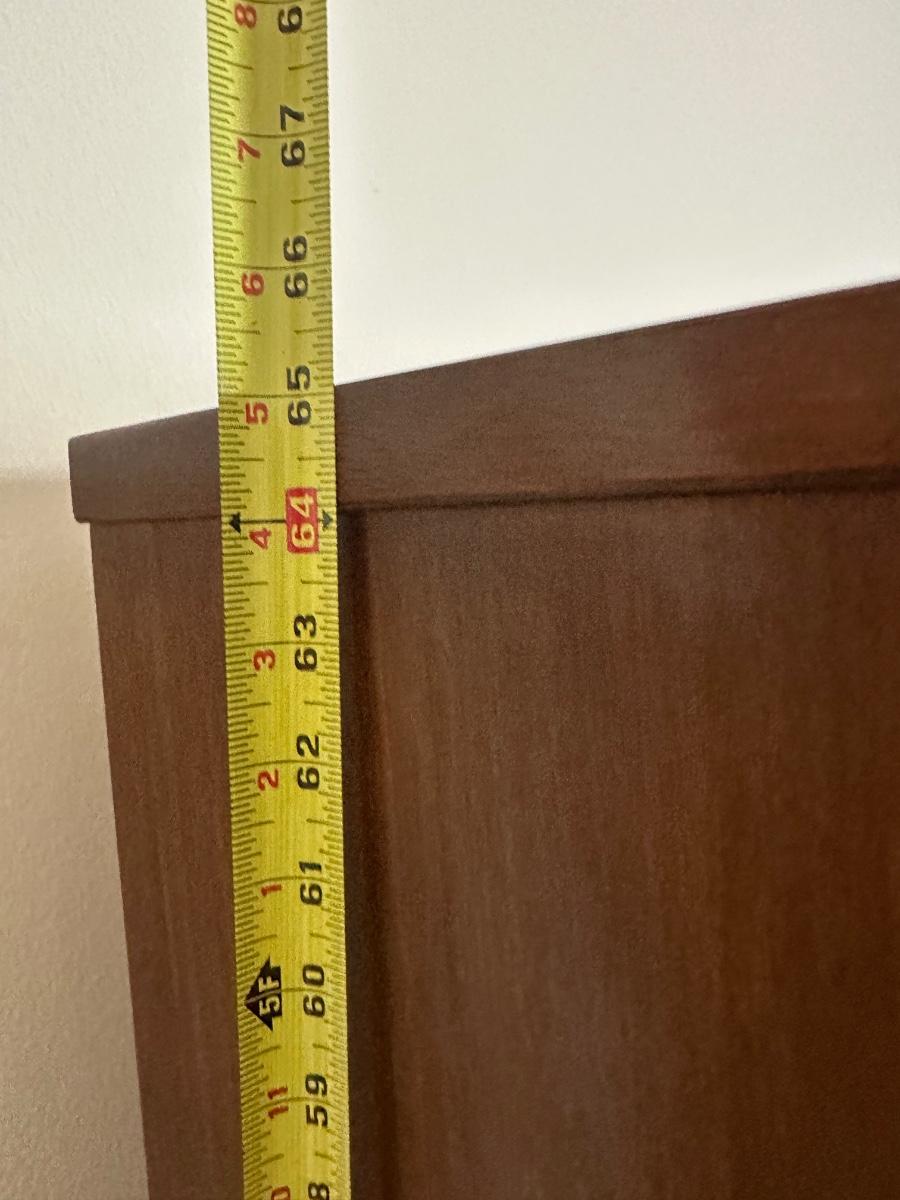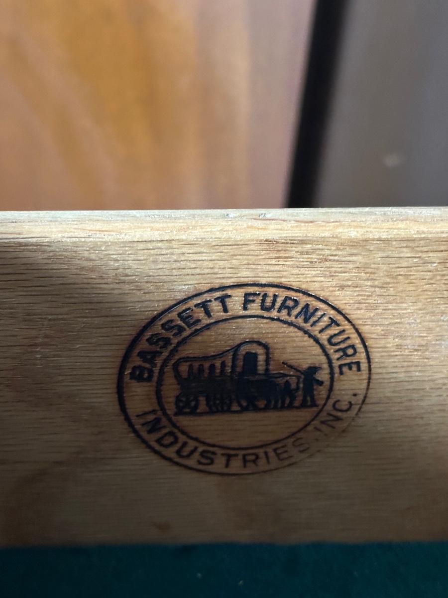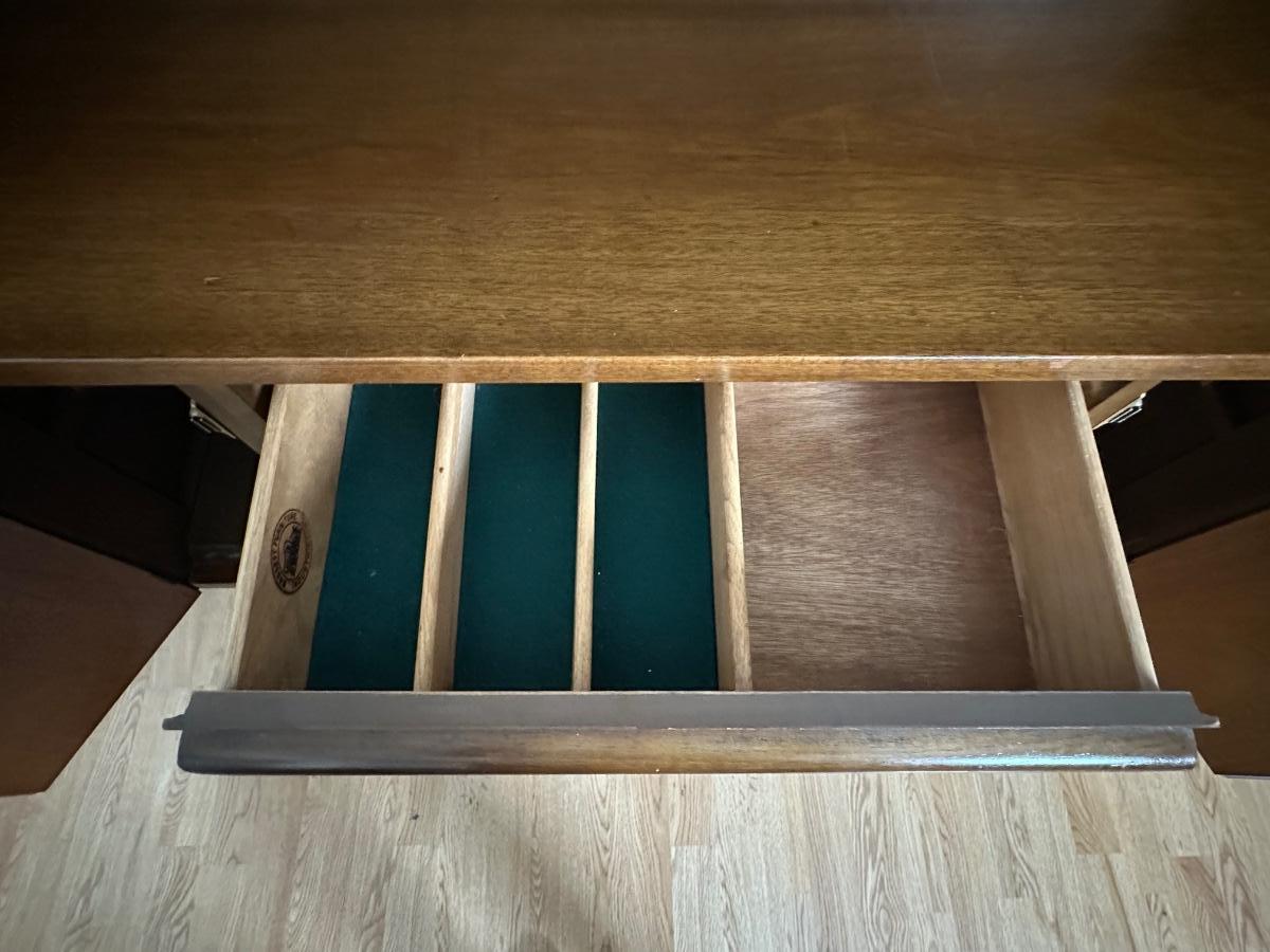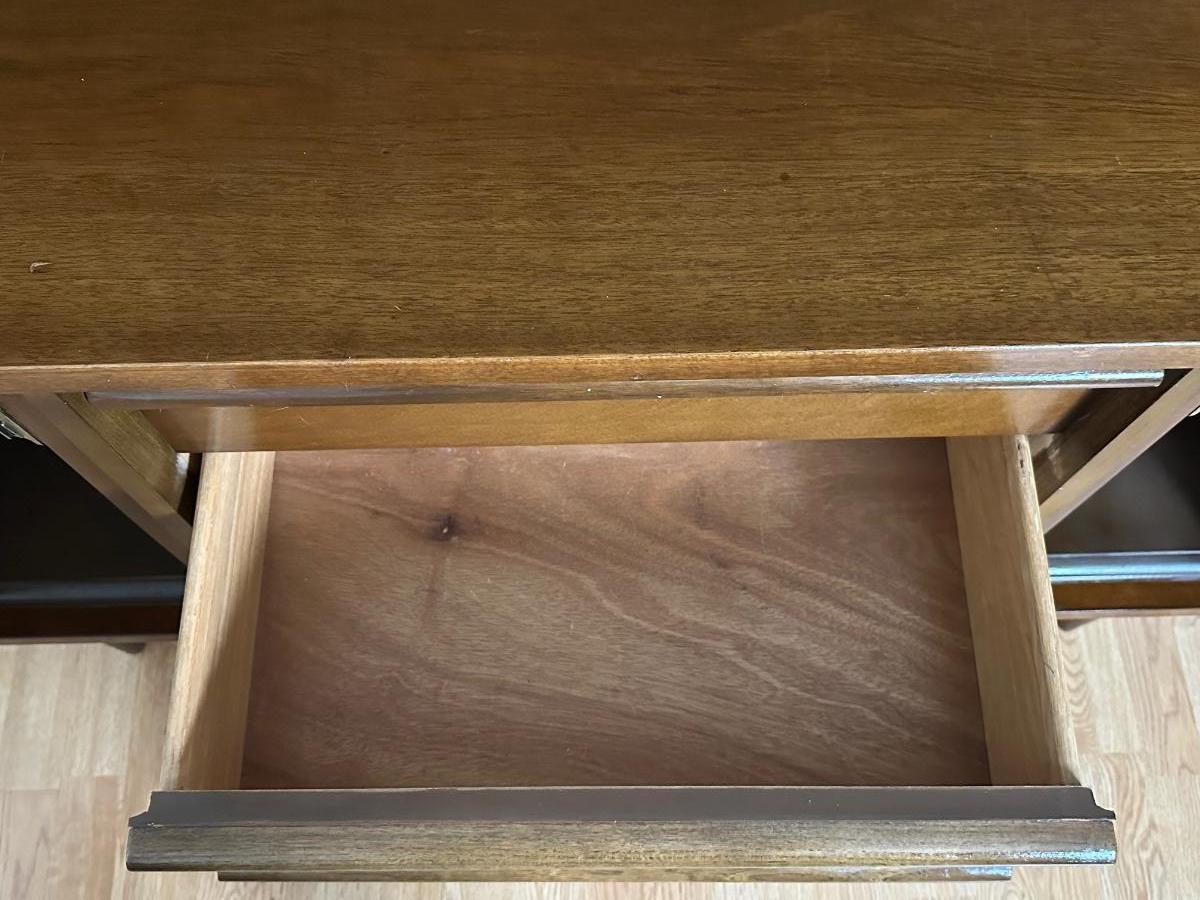 Very good condition with light wear consistent with age. Shows a small nick to the wood surface (see photos). The sliding glass doors currently do not glide smoothly and could use new track liners for easier movement and secure fit.