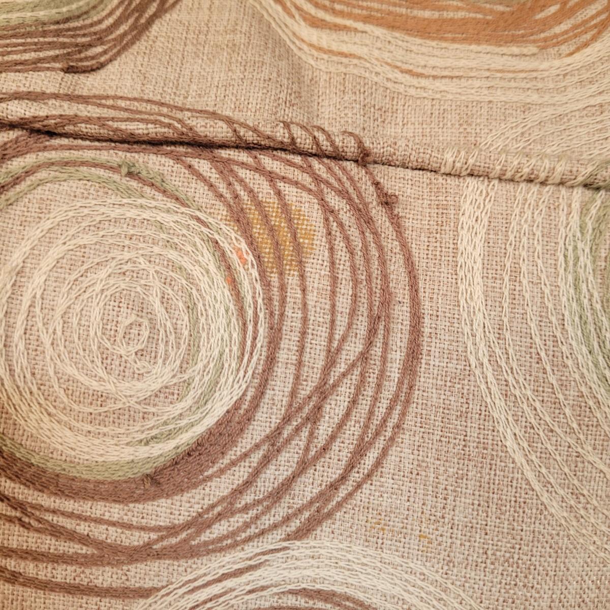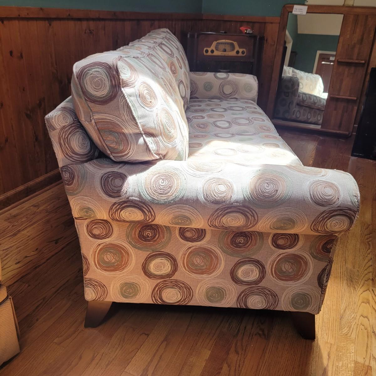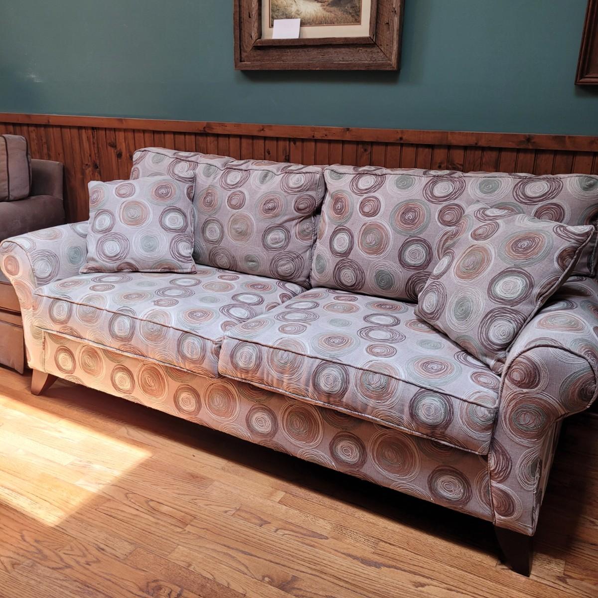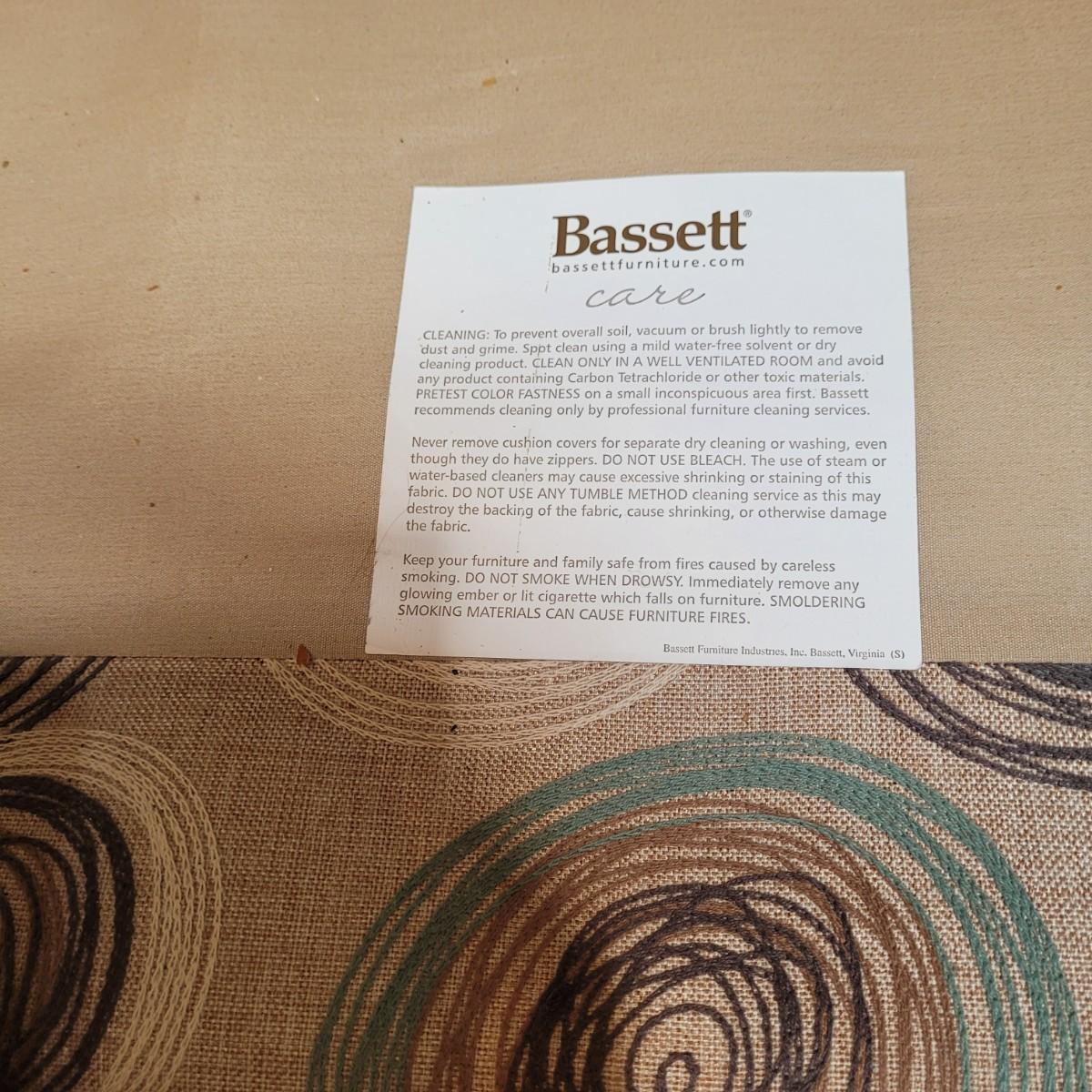 This sofa by Bassett Furniture features an array of stitched concentric circles in a whimsy style, in soft earth tones. Some stains and marks throughout (see photos). Measures approximately 84" x 35" x 39"H, with a seat depth of 26.5" and seat height of 20". Local pickup only. Winning bidder must bring assistance to help move and load this item due to its weight and size.
