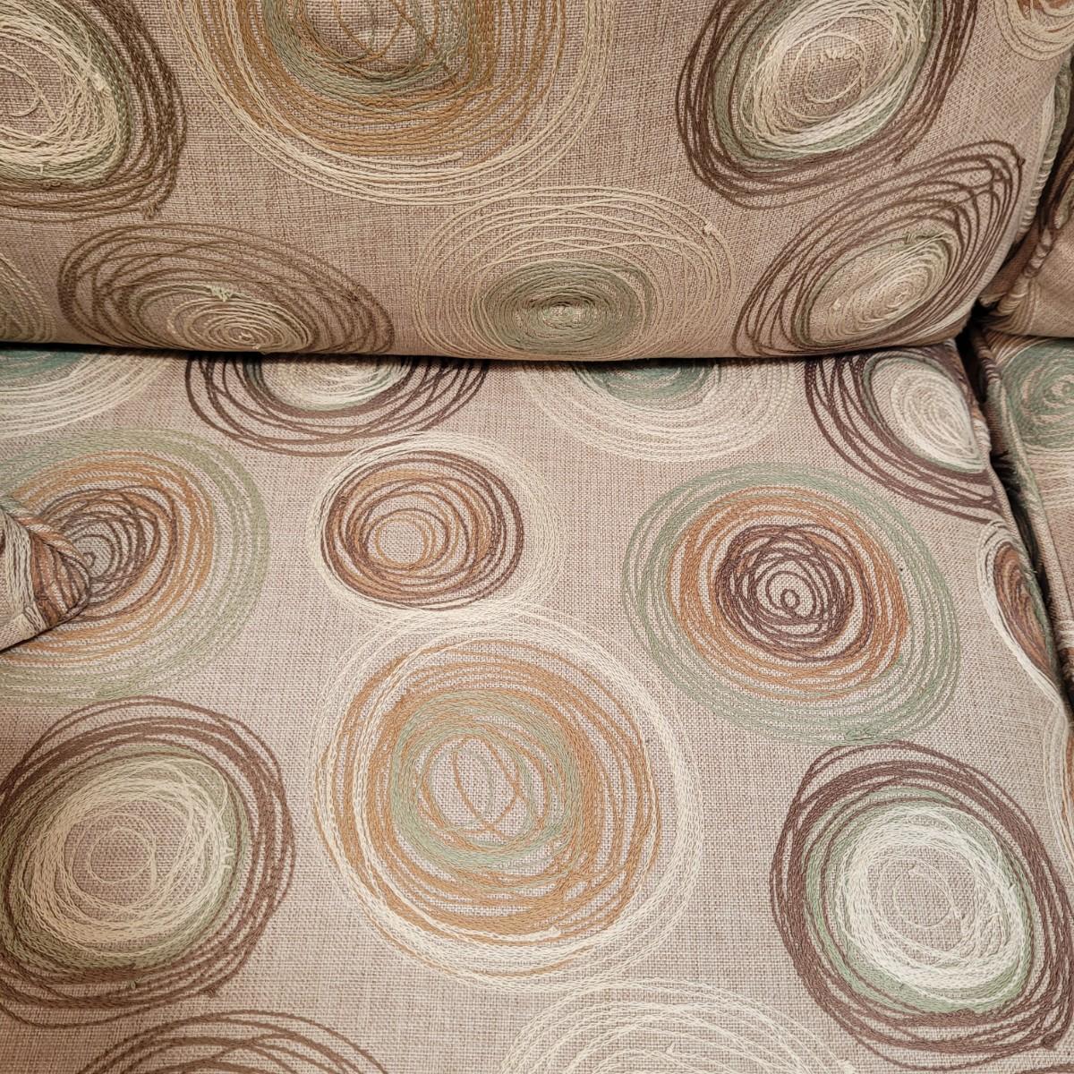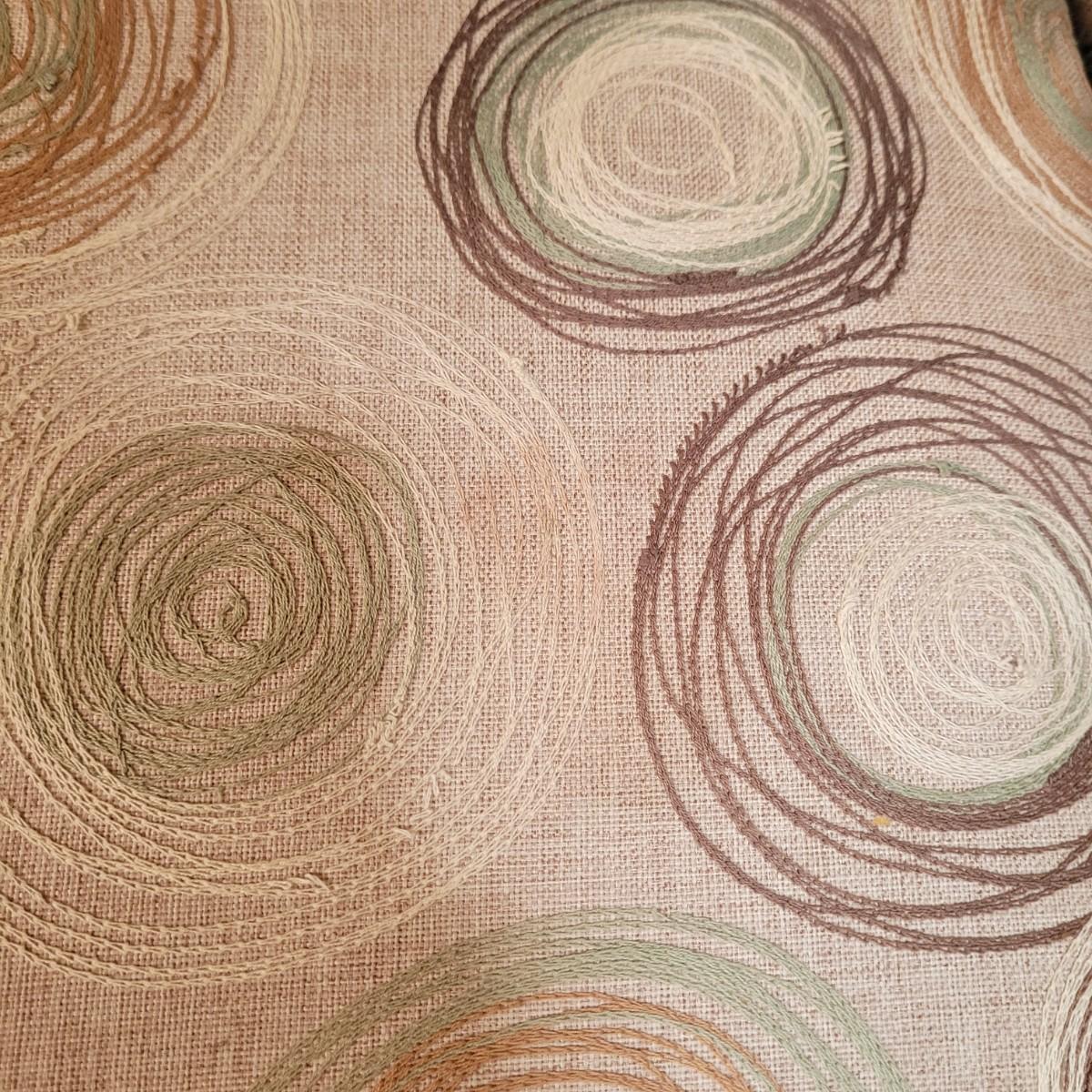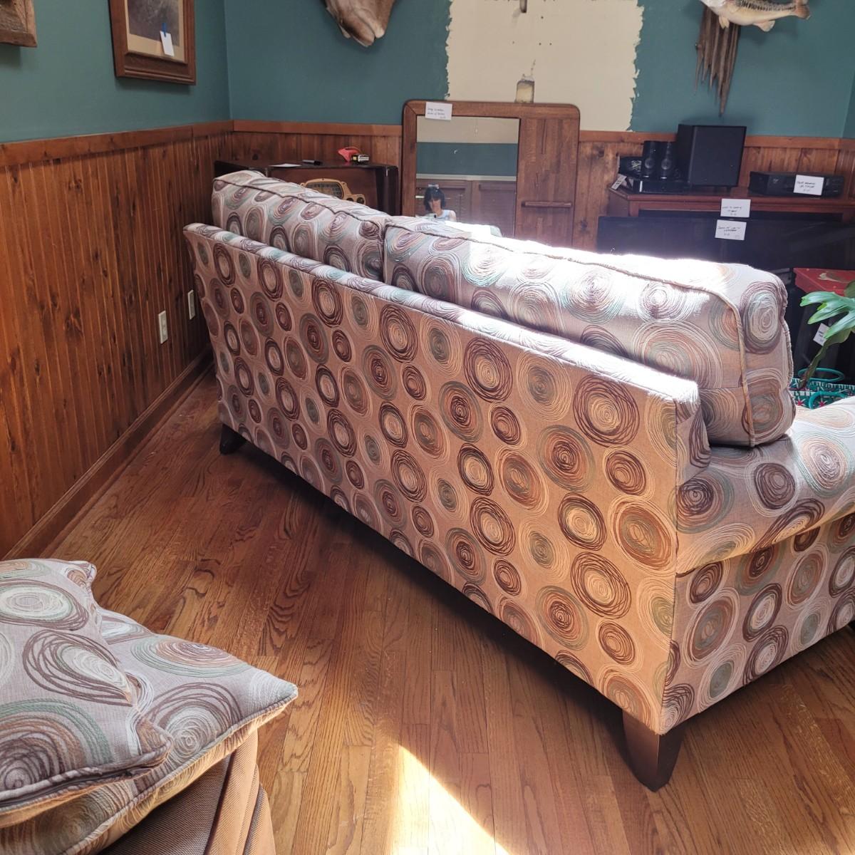 This sofa by Bassett Furniture features an array of stitched concentric circles in a whimsy style, in soft earth tones. Some stains and marks throughout (see photos). Measures approximately 84" x 35" x 39"H, with a seat depth of 26.5" and seat height of 20". Local pickup only. Winning bidder must bring assistance to help move and load this item due to its weight and size.
