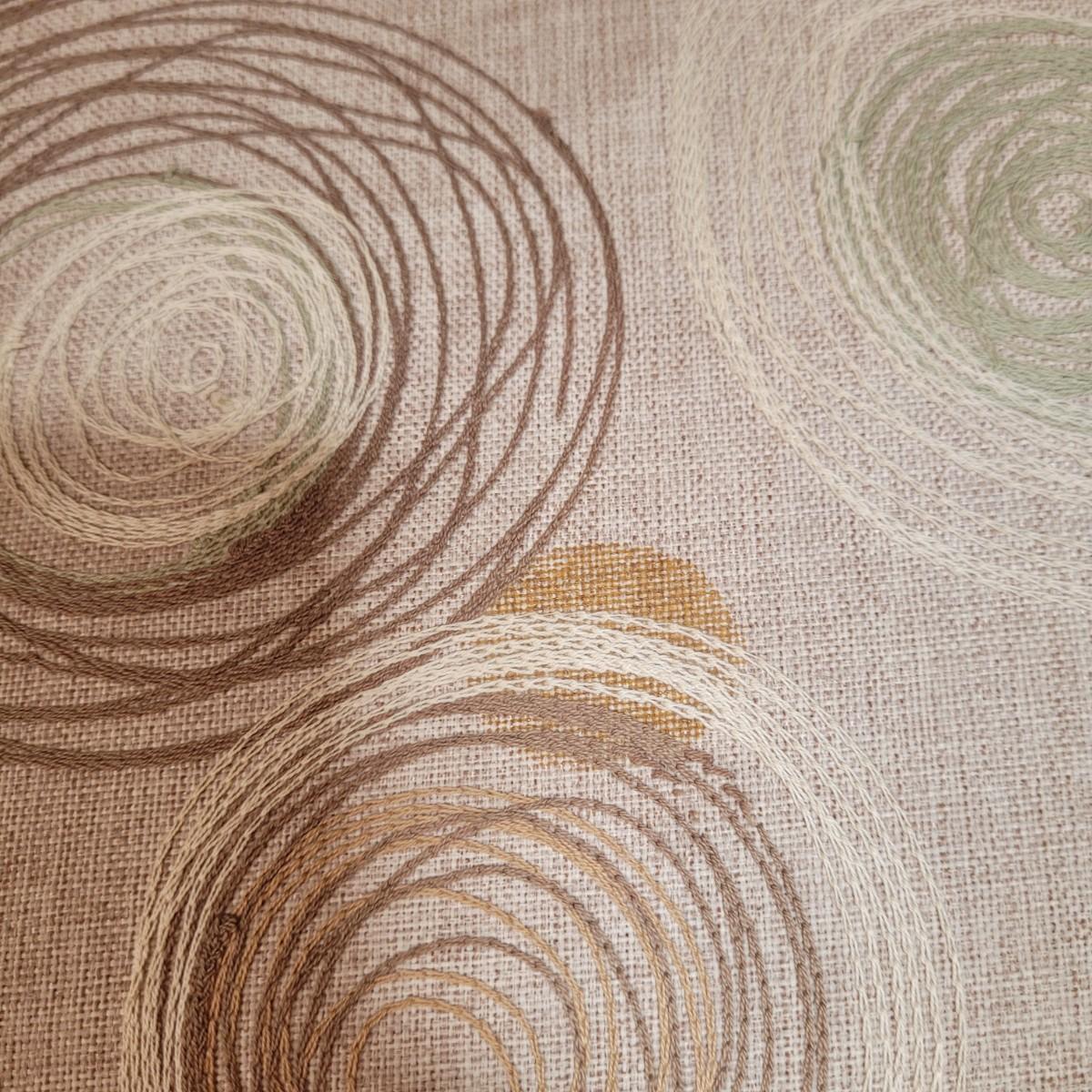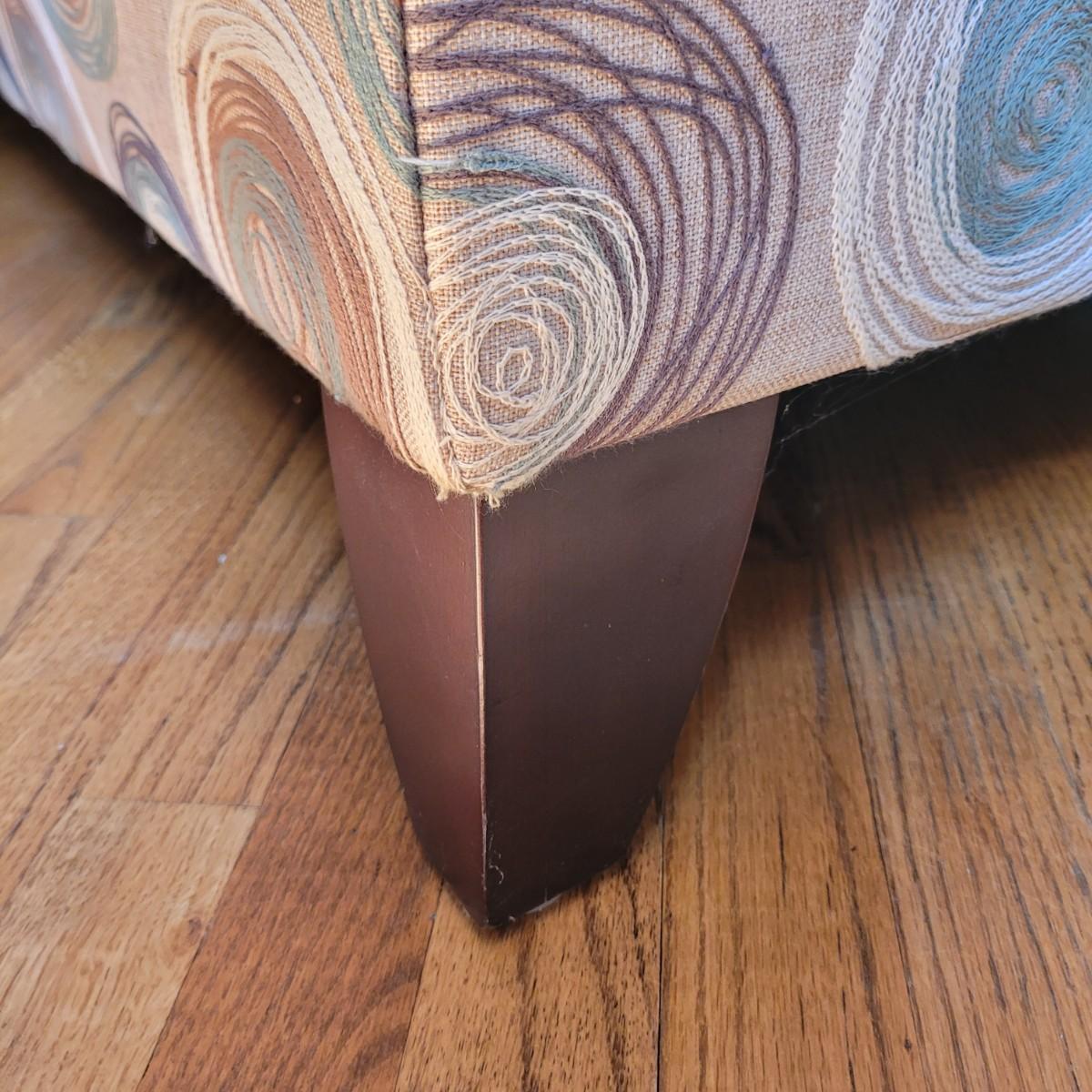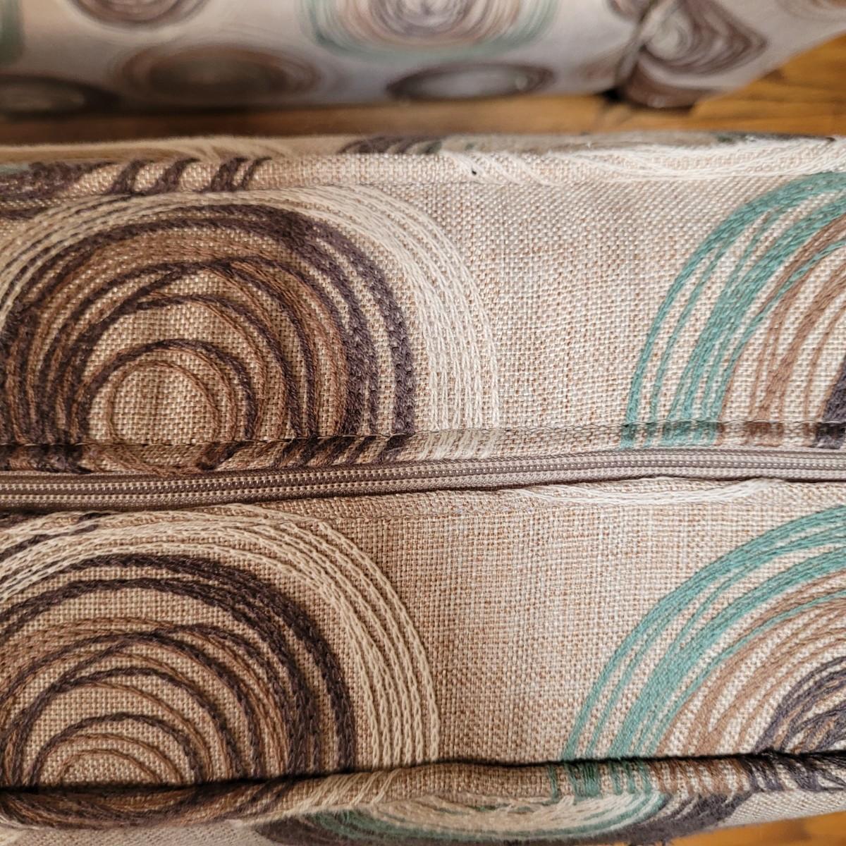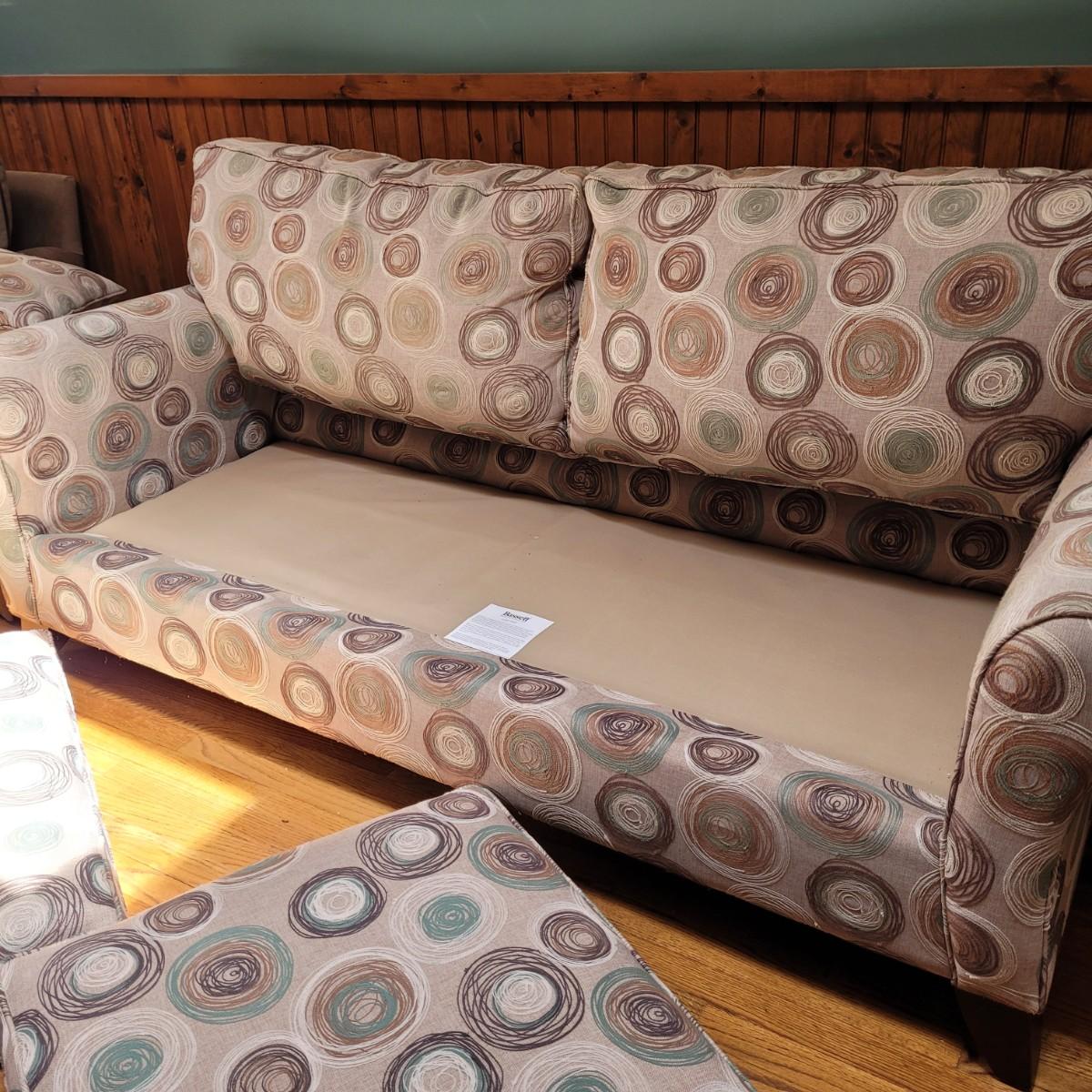 This sofa by Bassett Furniture features an array of stitched concentric circles in a whimsy style, in soft earth tones. Some stains and marks throughout (see photos). Measures approximately 84" x 35" x 39"H, with a seat depth of 26.5" and seat height of 20". Local pickup only. Winning bidder must bring assistance to help move and load this item due to its weight and size.