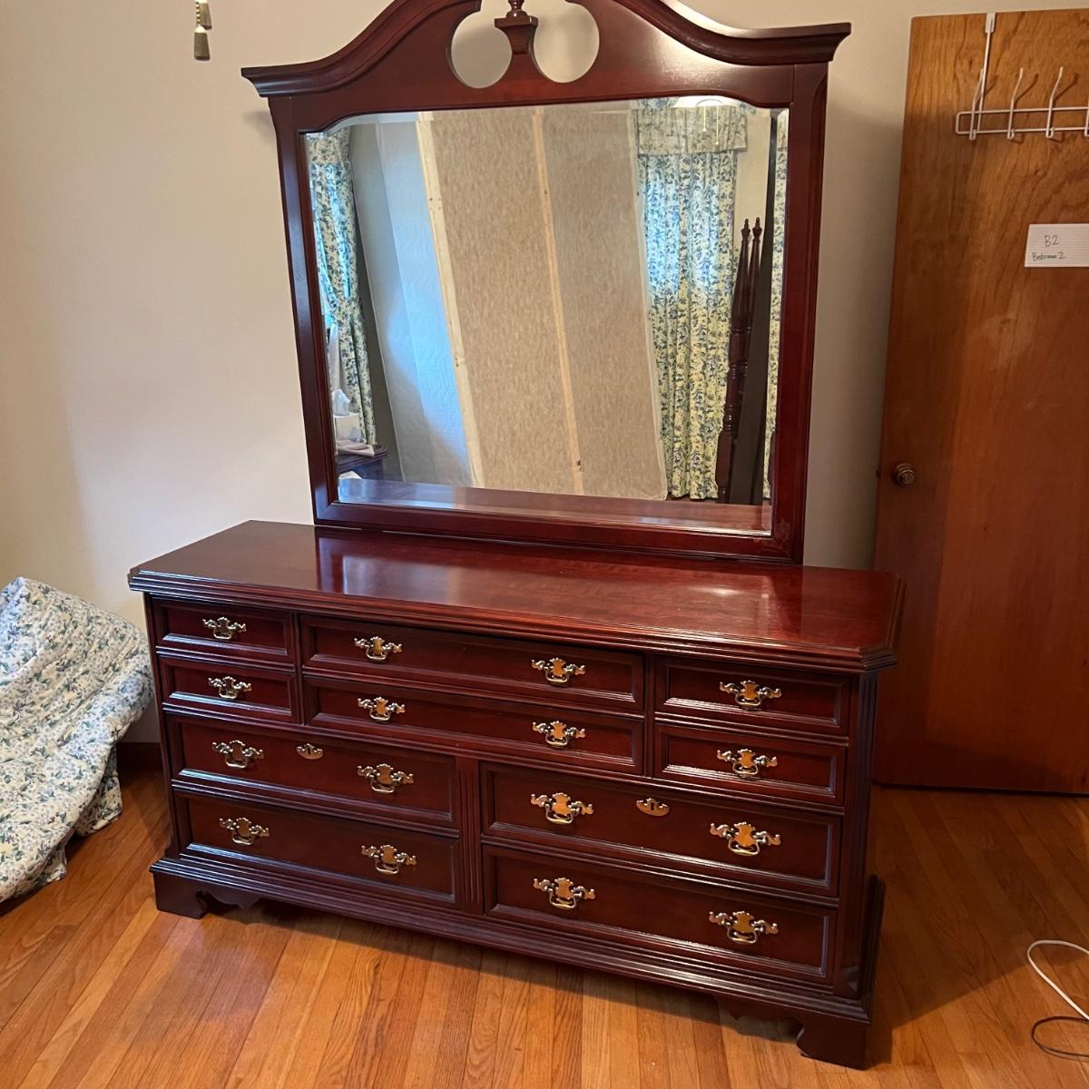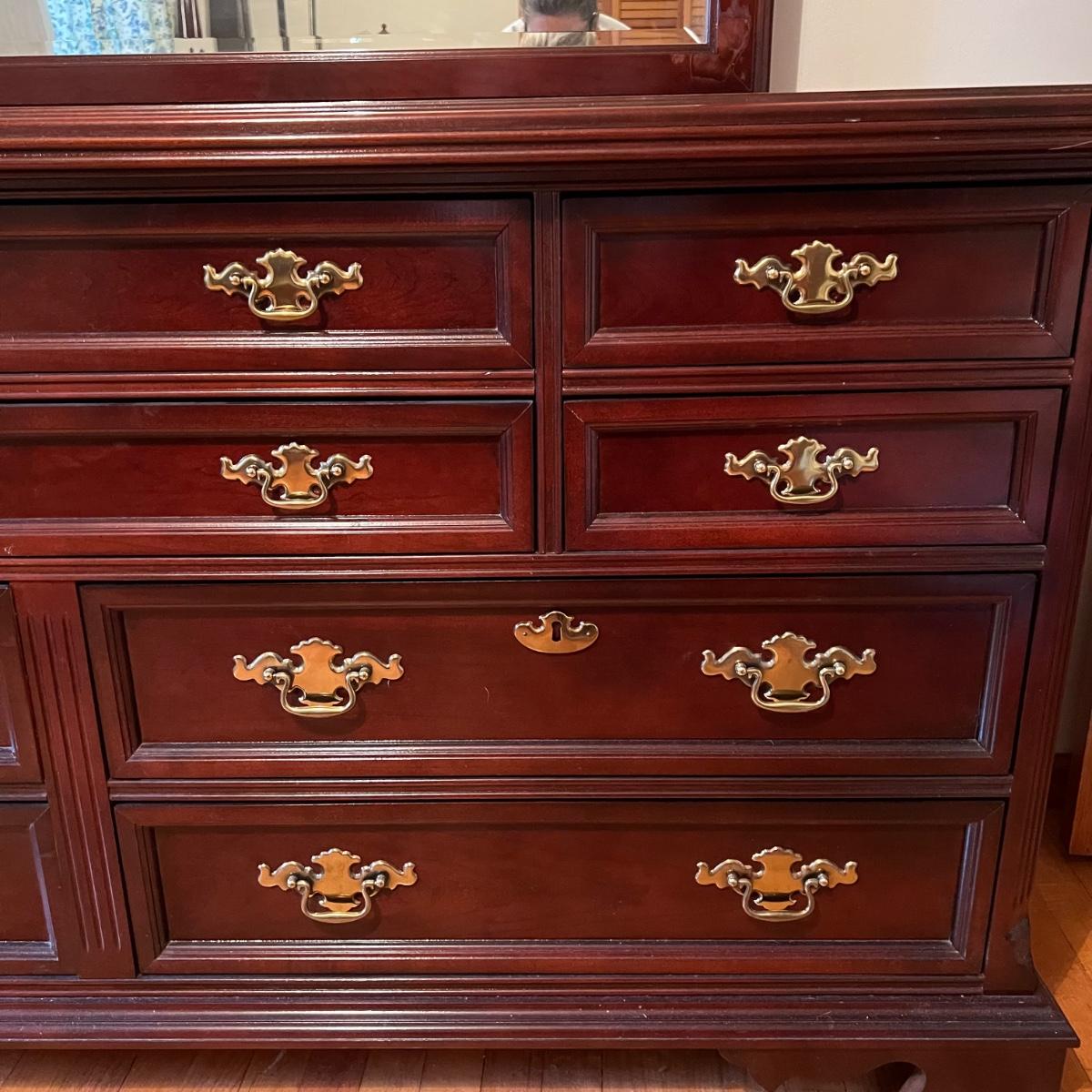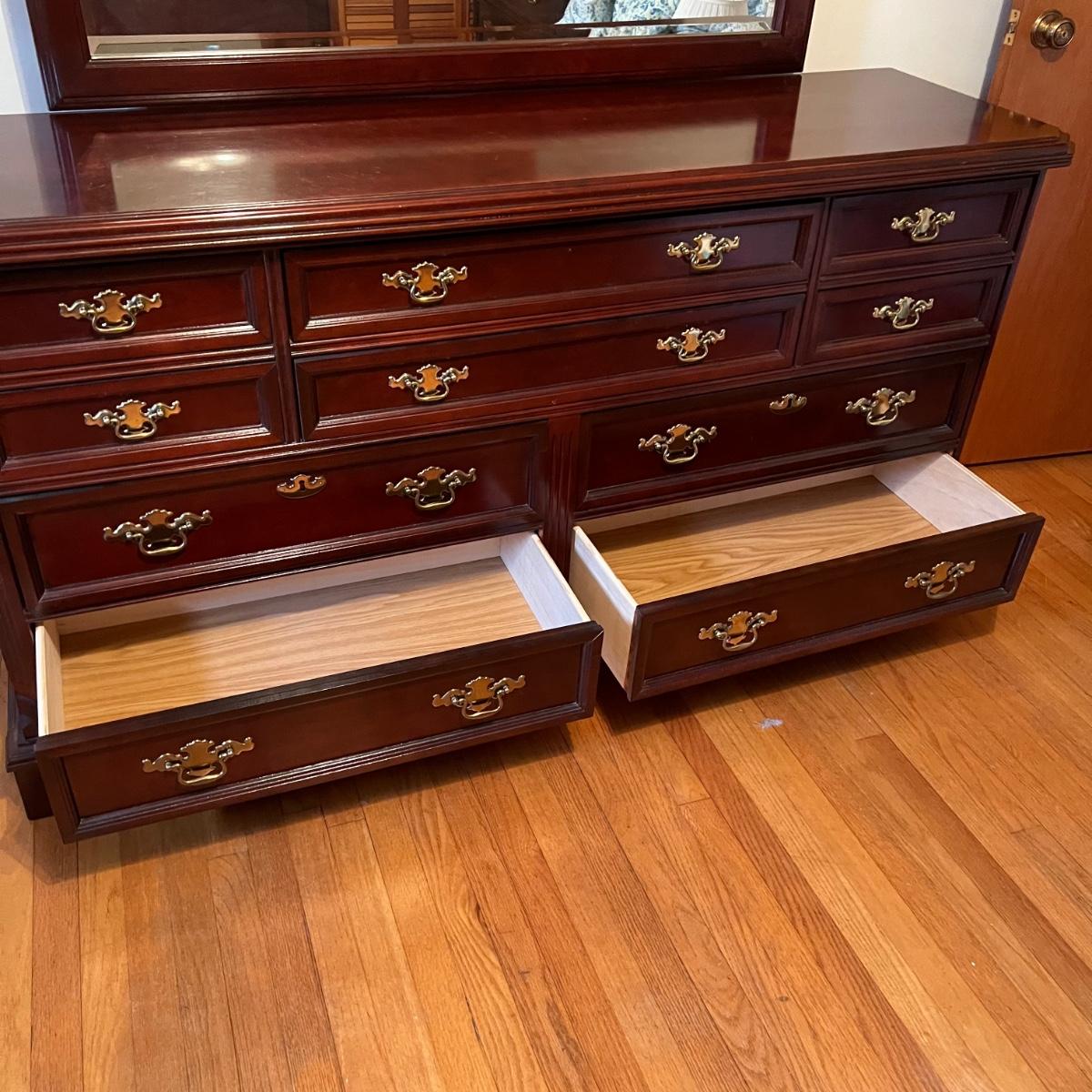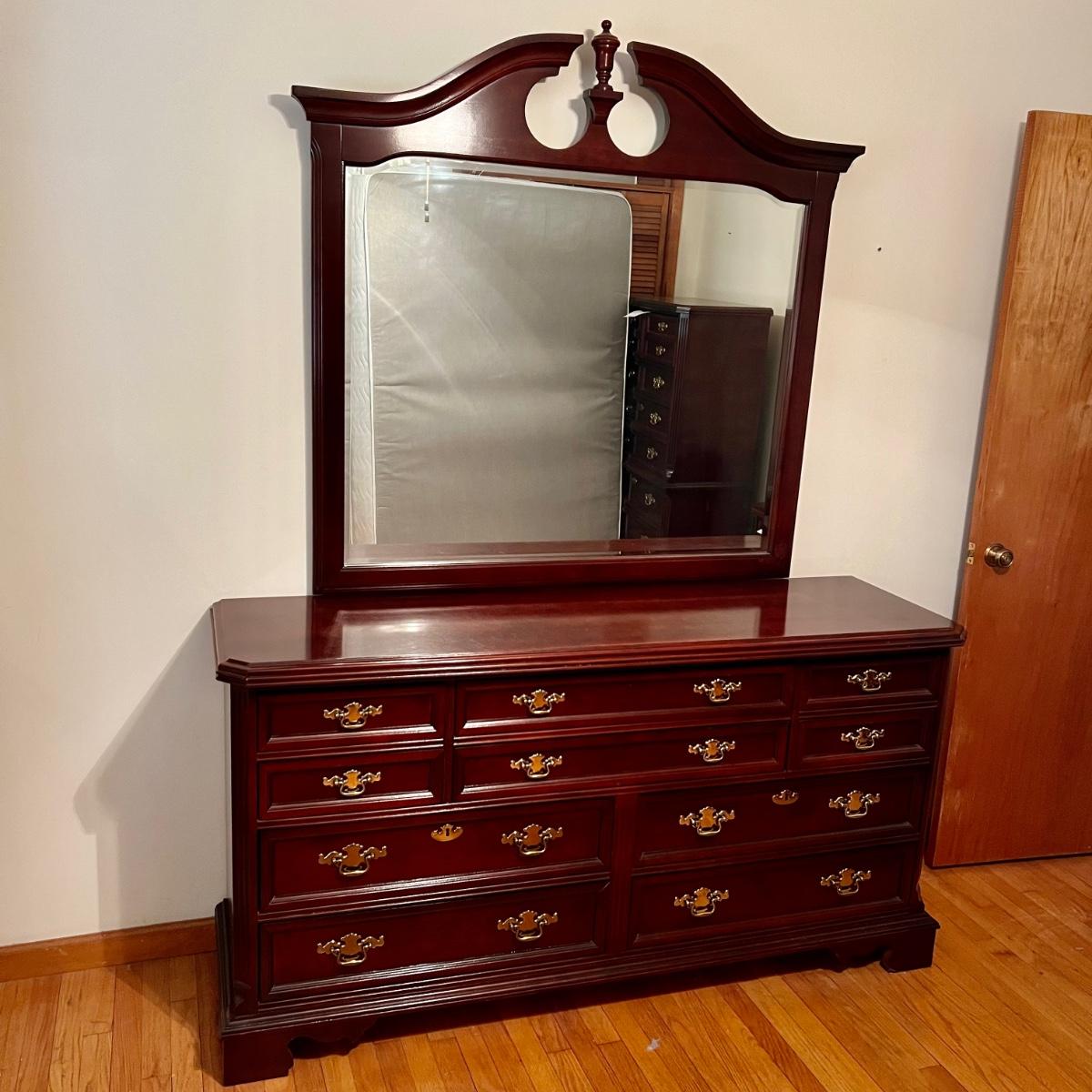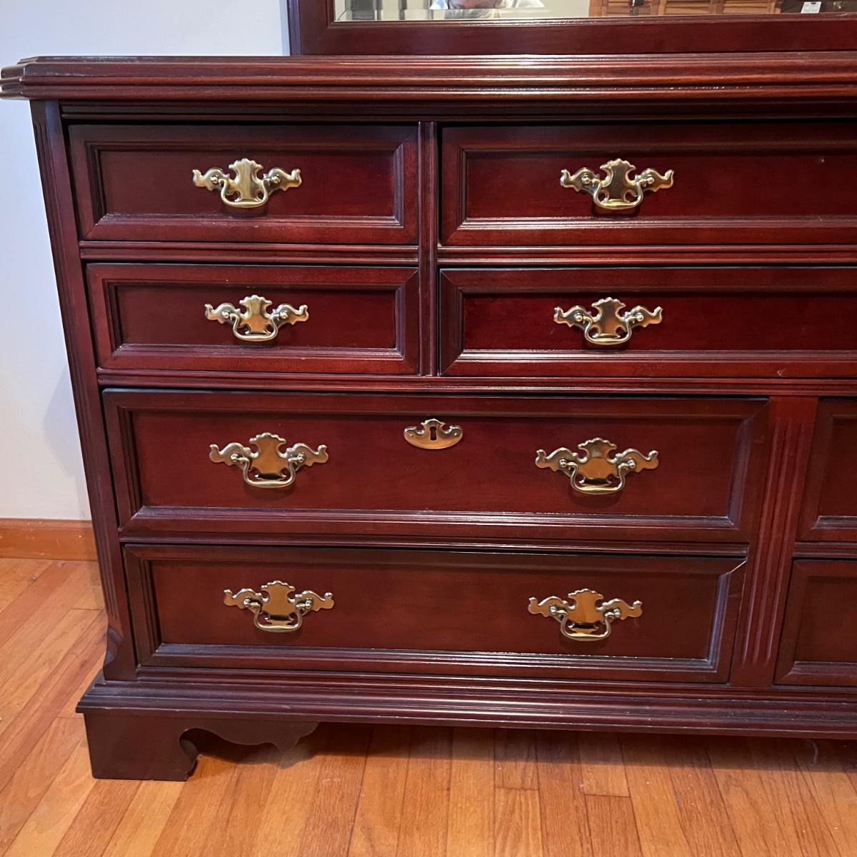Bassett mahogany stained solid wood ten-drawer dresser. Appears to be in very condition with no nicks or breaks in the stain other than the blemish as shown on the attached mirror in the photograph. This dresser measures 84” in total height including mirror, the dresser alone is 65.5” x 19” x 34". The mirror alone is 49” x 49.5”. Mirror can be detached but requires Phillips screwdriver. All hardware appears to be brass and the two ornamental key holes are non-functional. Dovetail drawer joints as shown.