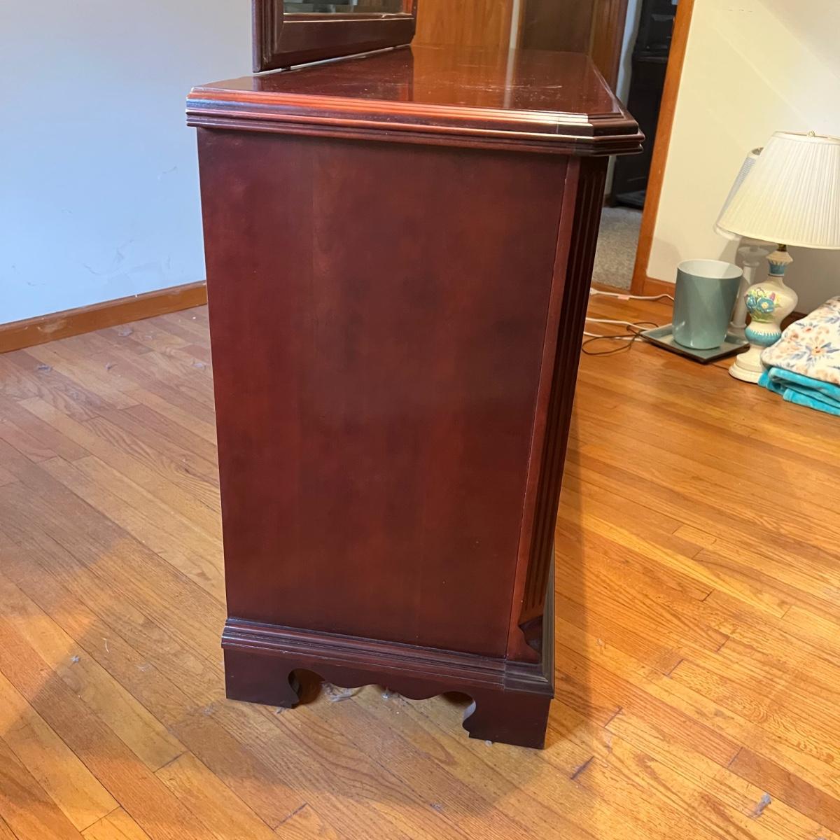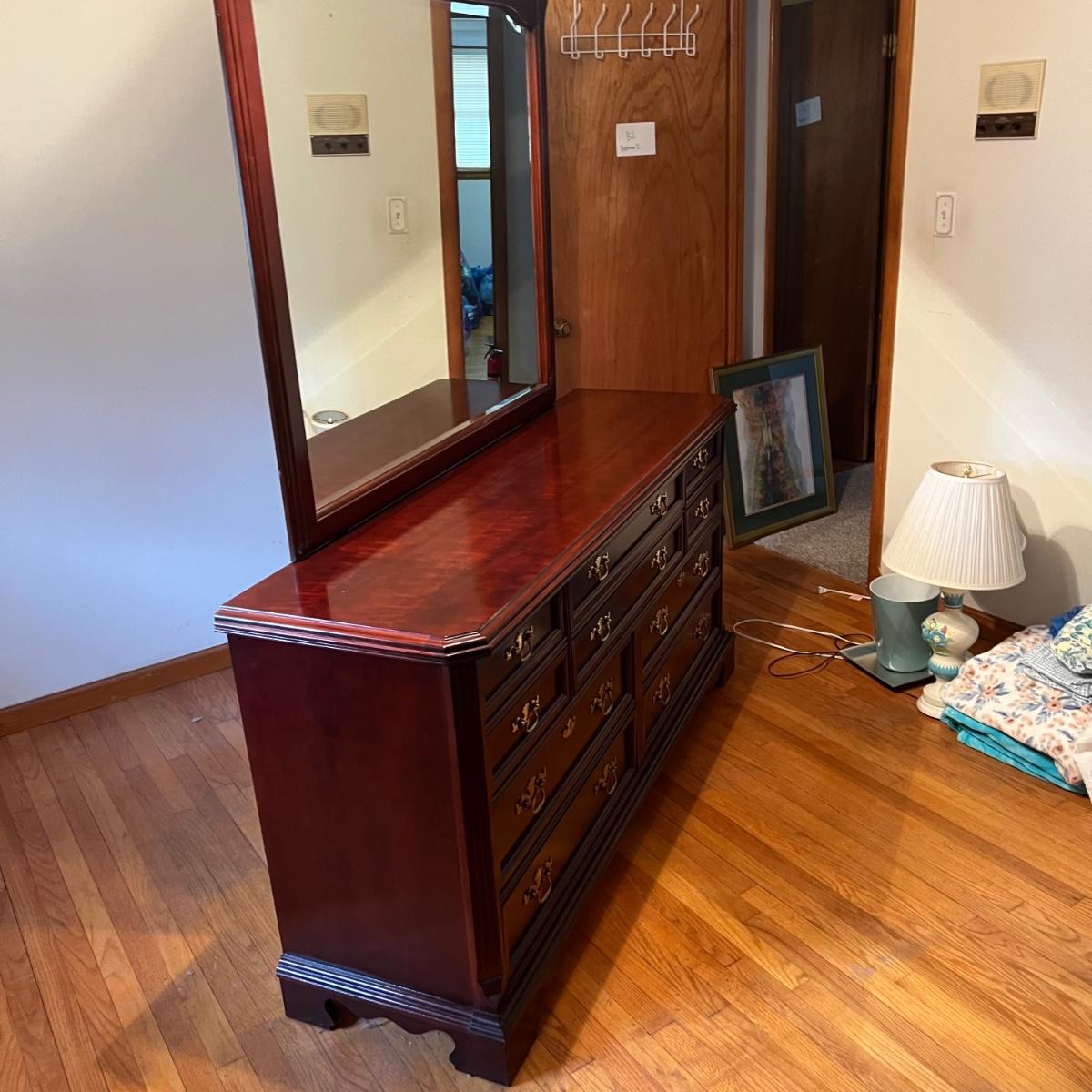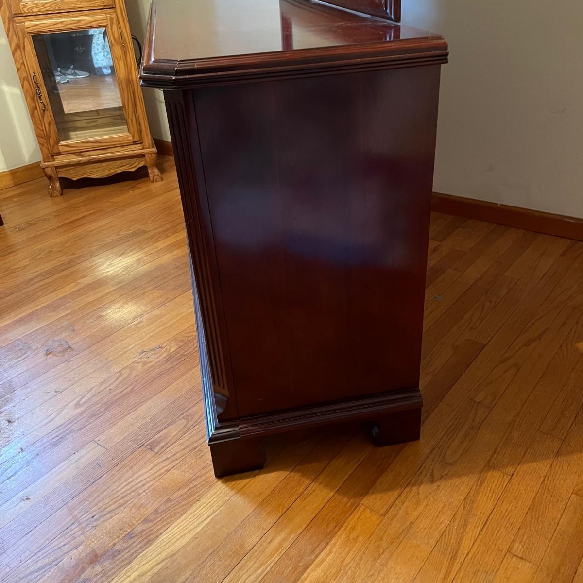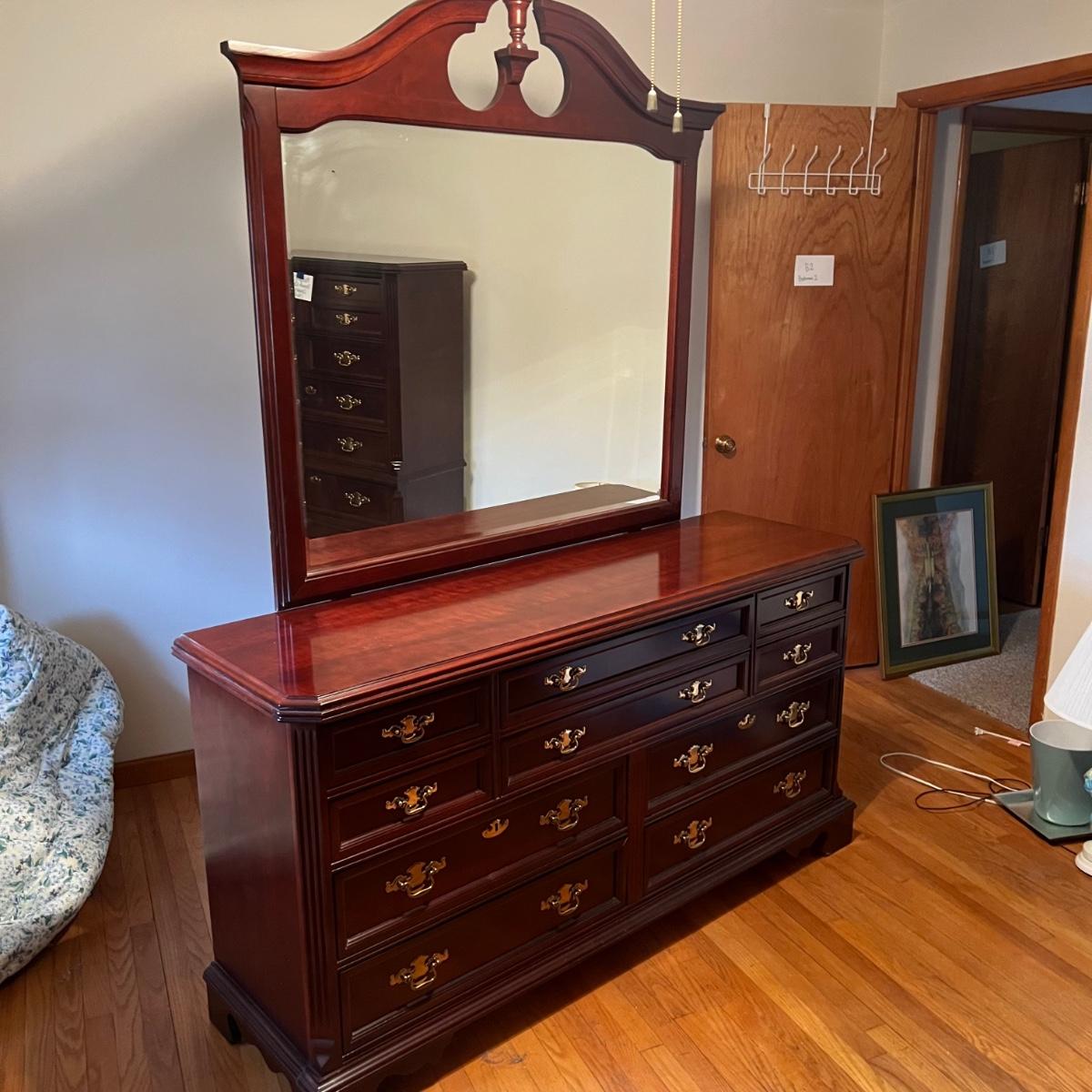 Bassett mahogany stained solid wood ten-drawer dresser. Appears to be in very condition with no nicks or breaks in the stain other than the blemish as shown on the attached mirror in the photograph. This dresser measures 84” in total height including mirror, the dresser alone is 65.5” x 19” x 34". The mirror alone is 49” x 49.5”. Mirror can be detached but requires Phillips screwdriver. All hardware appears to be brass and the two ornamental key holes are non-functional. Dovetail drawer joints as shown.
