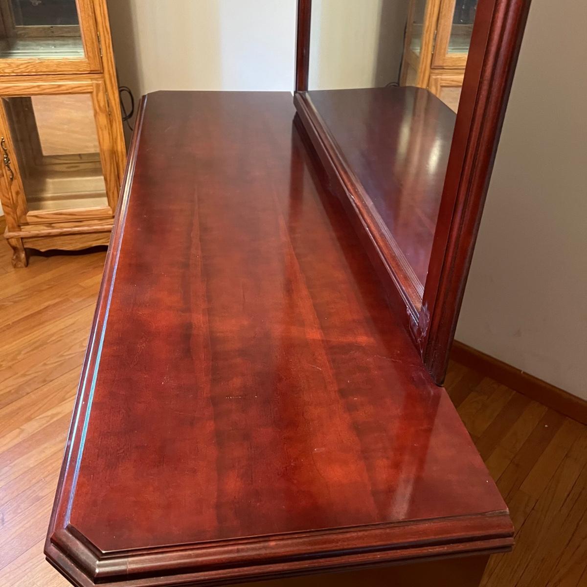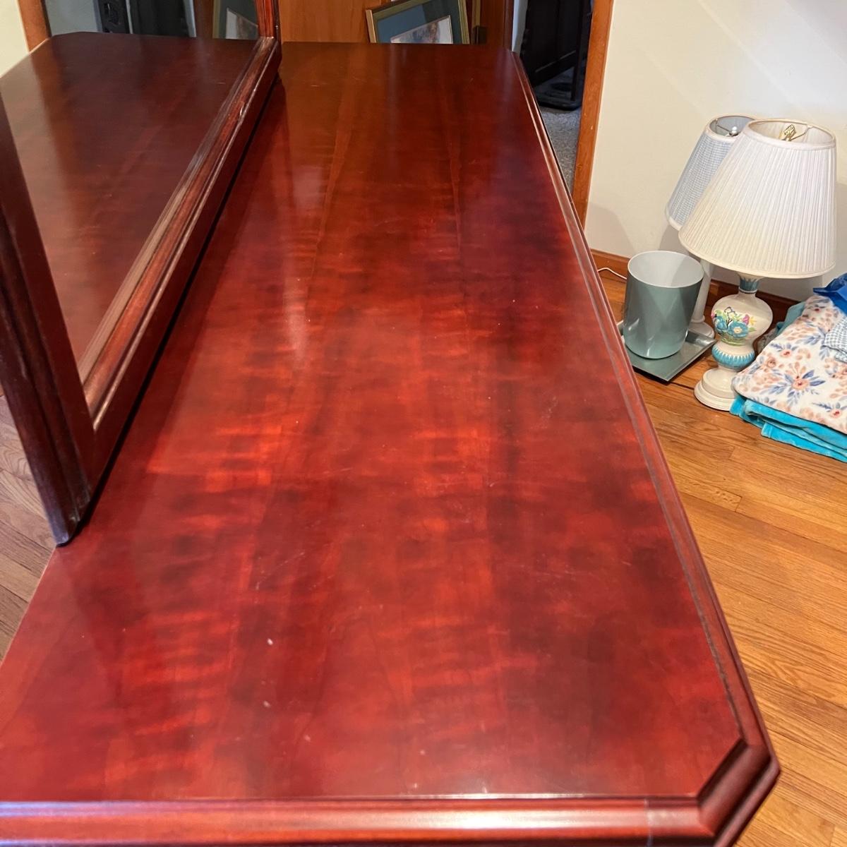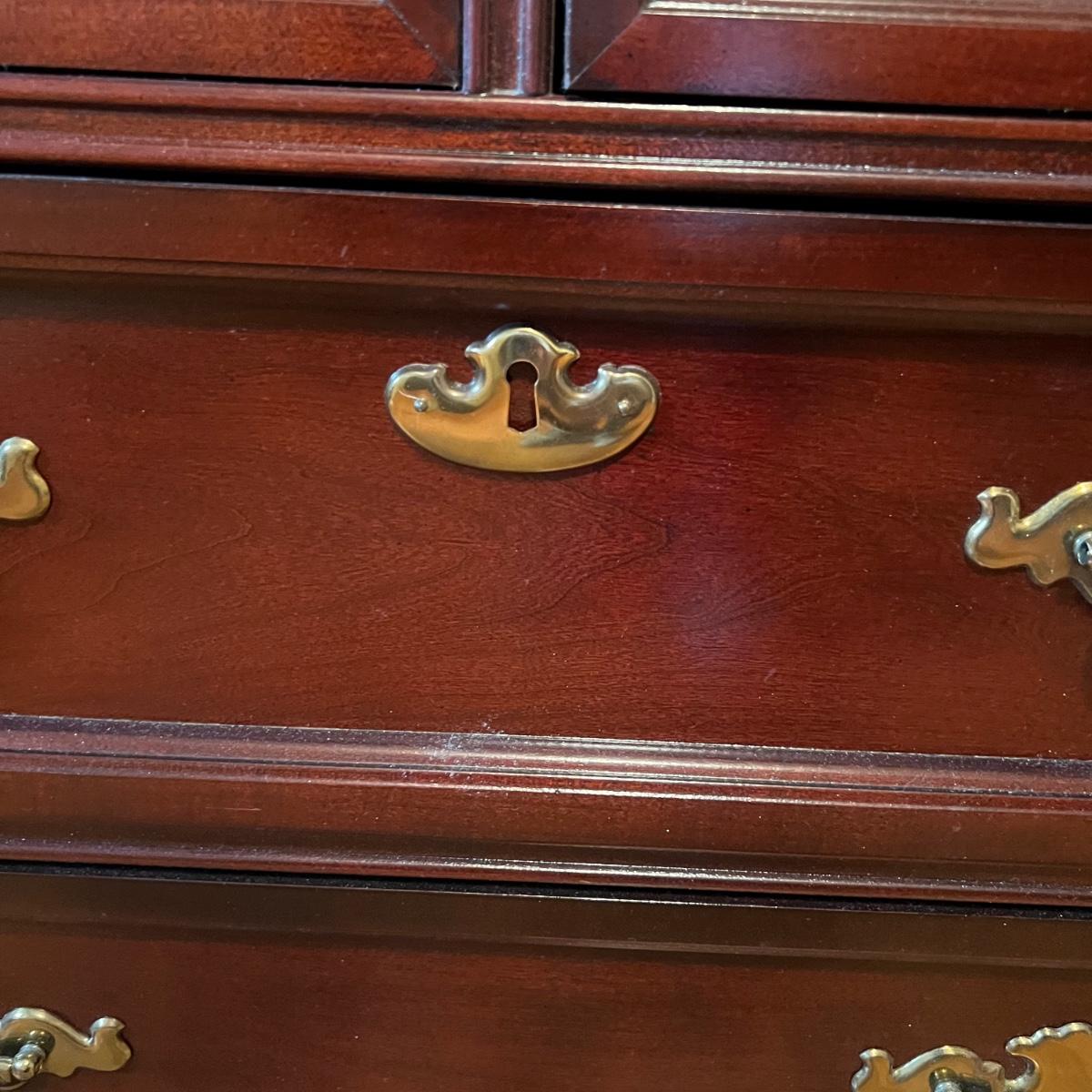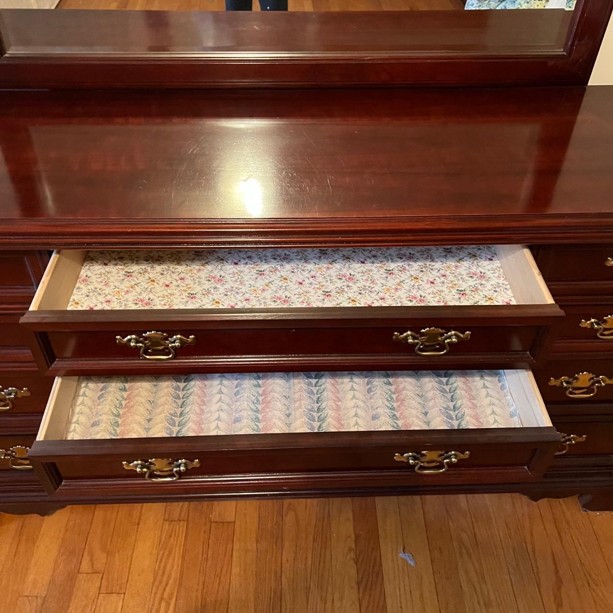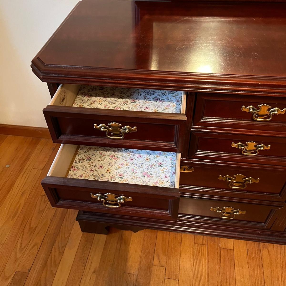 Bassett mahogany stained solid wood ten-drawer dresser. Appears to be in very condition with no nicks or breaks in the stain other than the blemish as shown on the attached mirror in the photograph. This dresser measures 84” in total height including mirror, the dresser alone is 65.5” x 19” x 34". The mirror alone is 49” x 49.5”. Mirror can be detached but requires Phillips screwdriver. All hardware appears to be brass and the two ornamental key holes are non-functional. Dovetail drawer joints as shown.