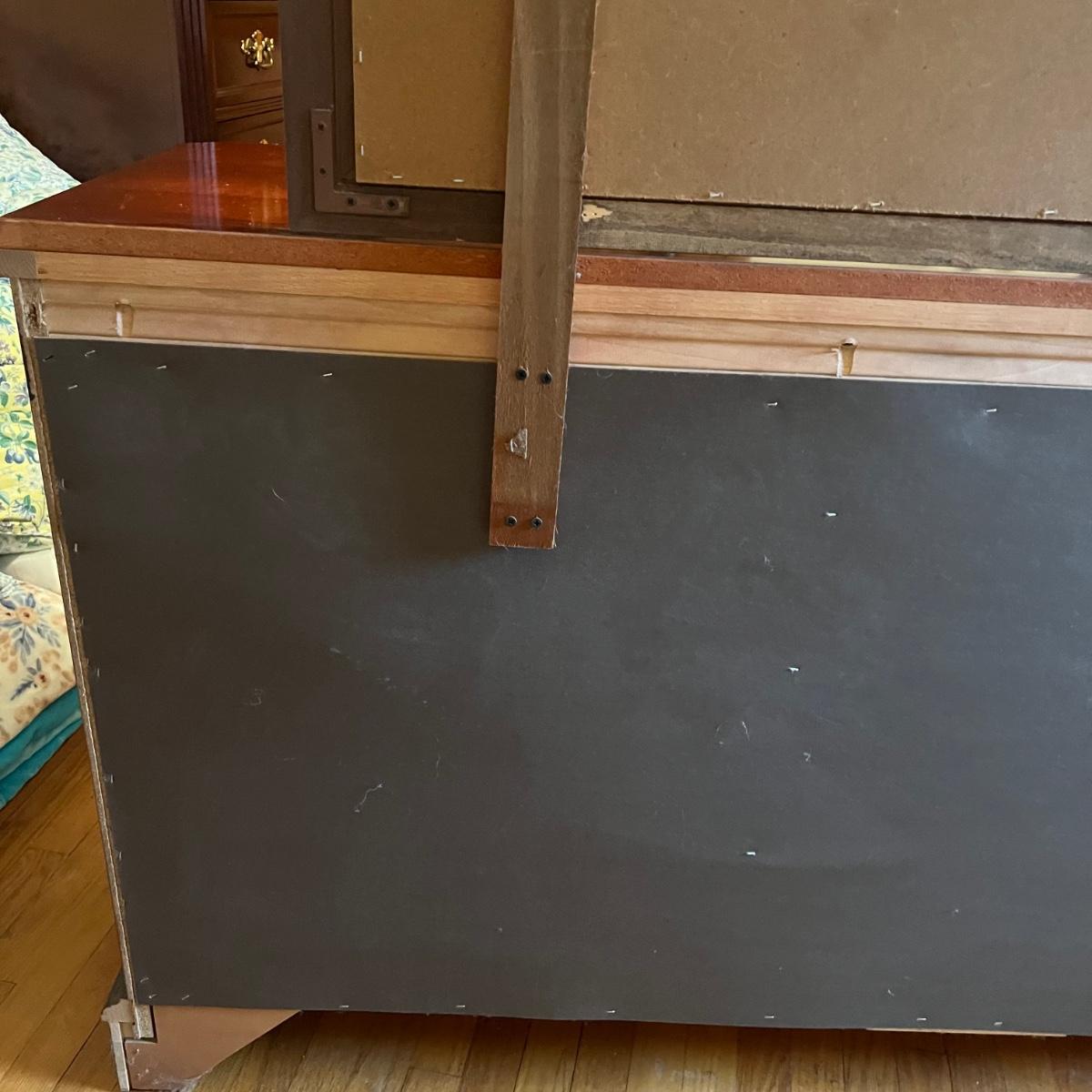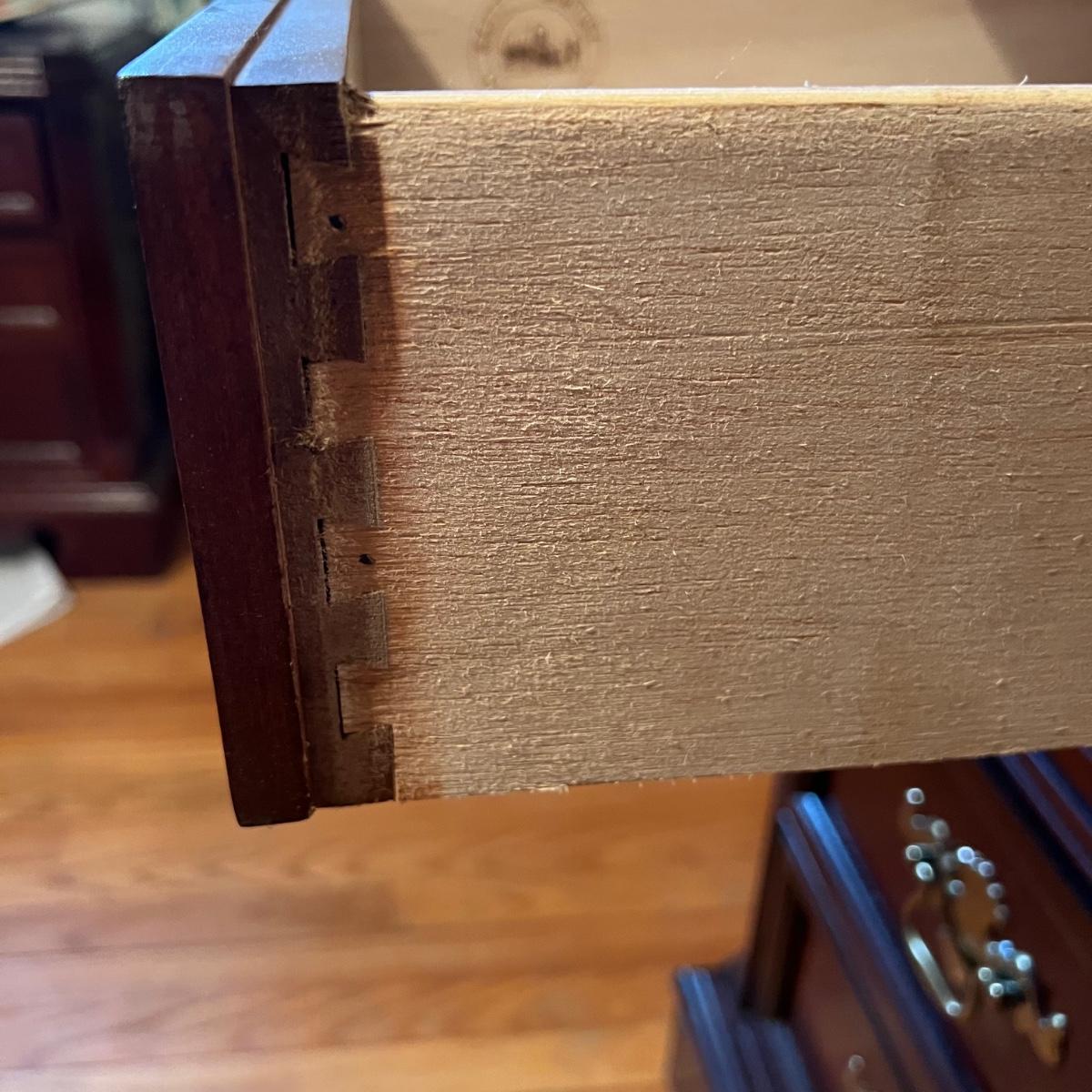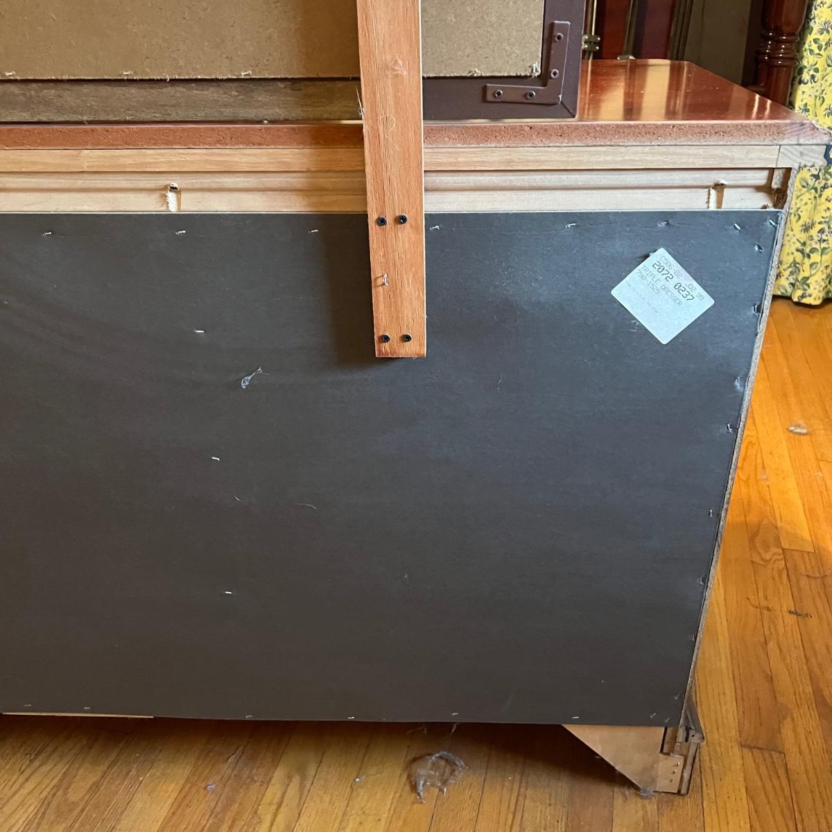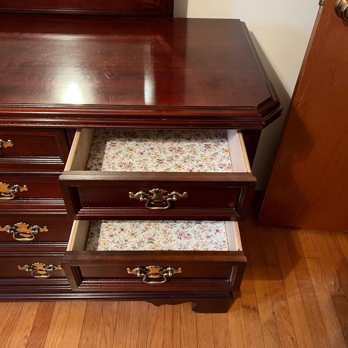 Bassett mahogany stained solid wood ten-drawer dresser. Appears to be in very condition with no nicks or breaks in the stain other than the blemish as shown on the attached mirror in the photograph. This dresser measures 84” in total height including mirror, the dresser alone is 65.5” x 19” x 34". The mirror alone is 49” x 49.5”. Mirror can be detached but requires Phillips screwdriver. All hardware appears to be brass and the two ornamental key holes are non-functional. Dovetail drawer joints as shown.