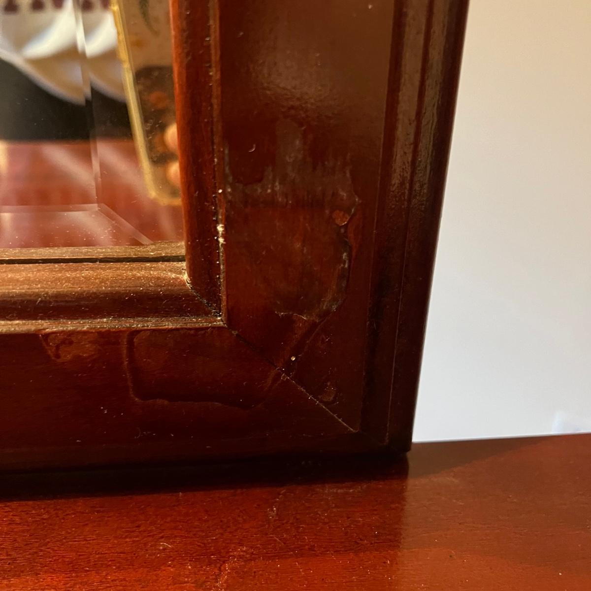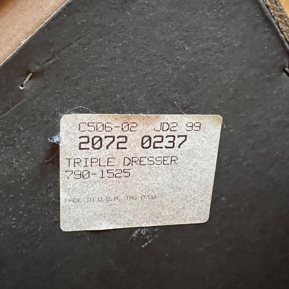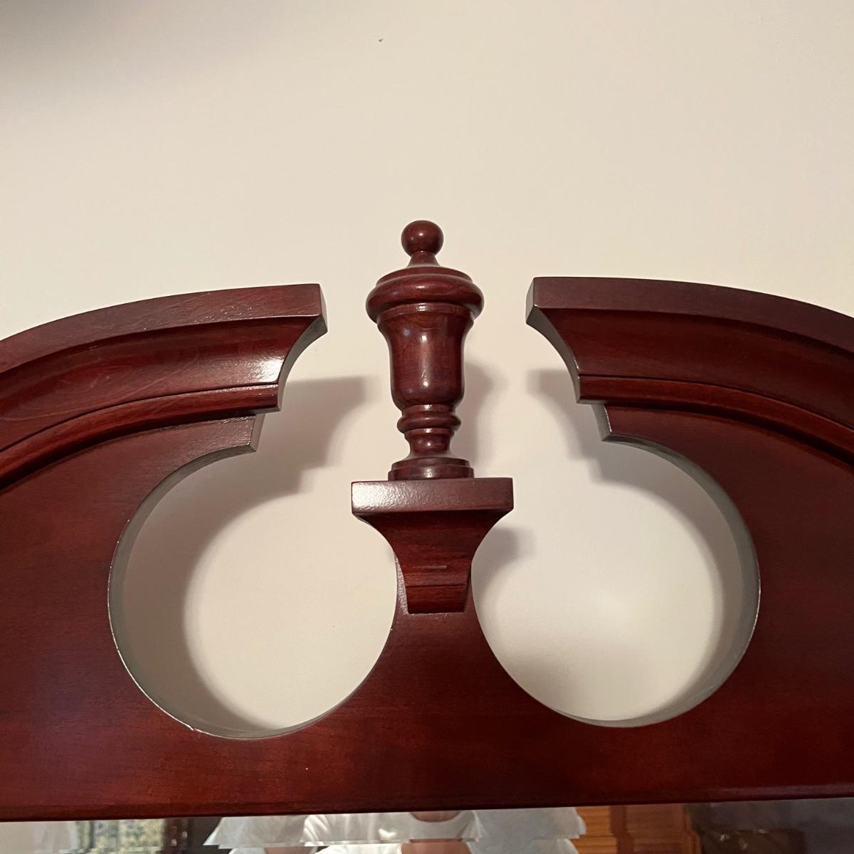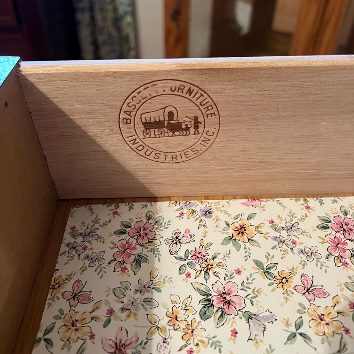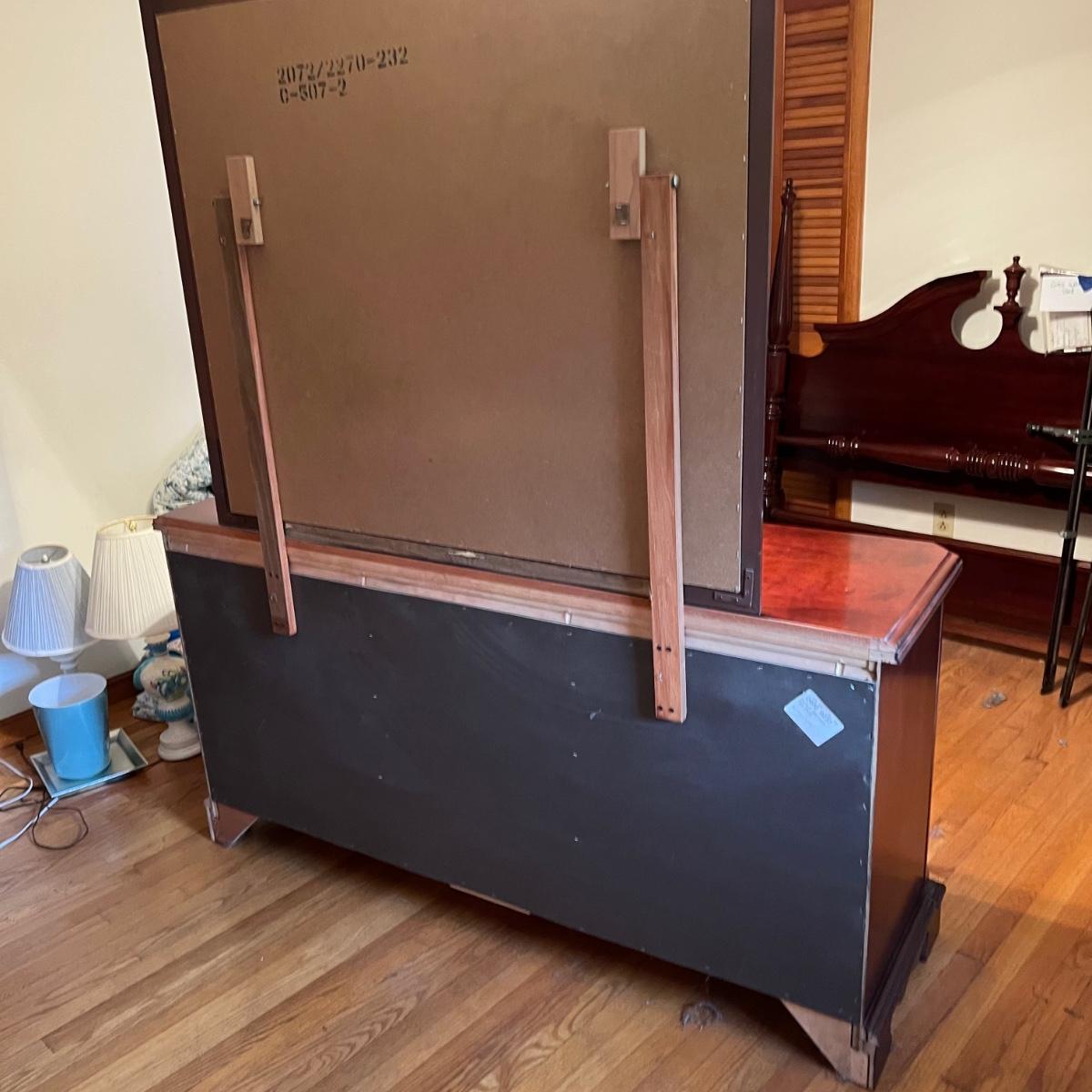 Bassett mahogany stained solid wood ten-drawer dresser. Appears to be in very condition with no nicks or breaks in the stain other than the blemish as shown on the attached mirror in the photograph. This dresser measures 84” in total height including mirror, the dresser alone is 65.5” x 19” x 34". The mirror alone is 49” x 49.5”. Mirror can be detached but requires Phillips screwdriver. All hardware appears to be brass and the two ornamental key holes are non-functional. Dovetail drawer joints as shown.