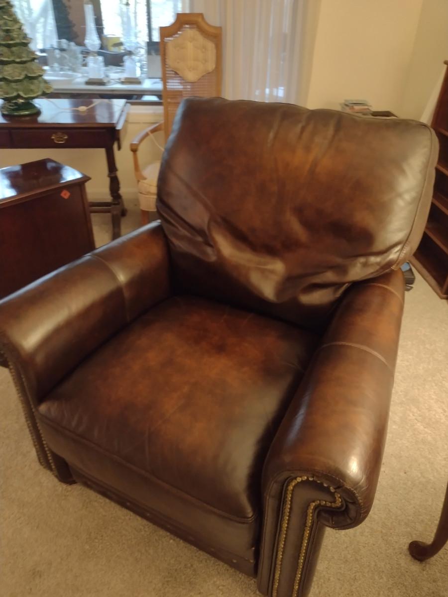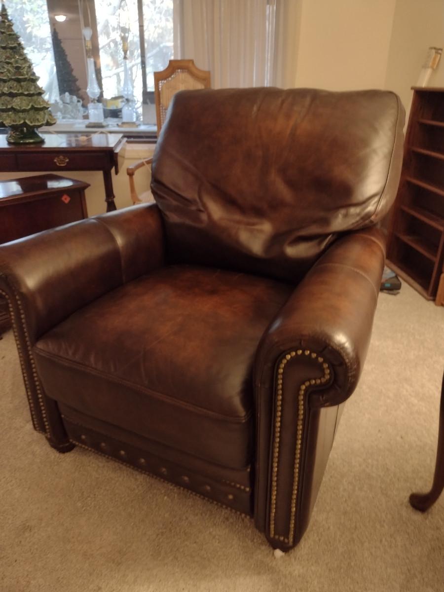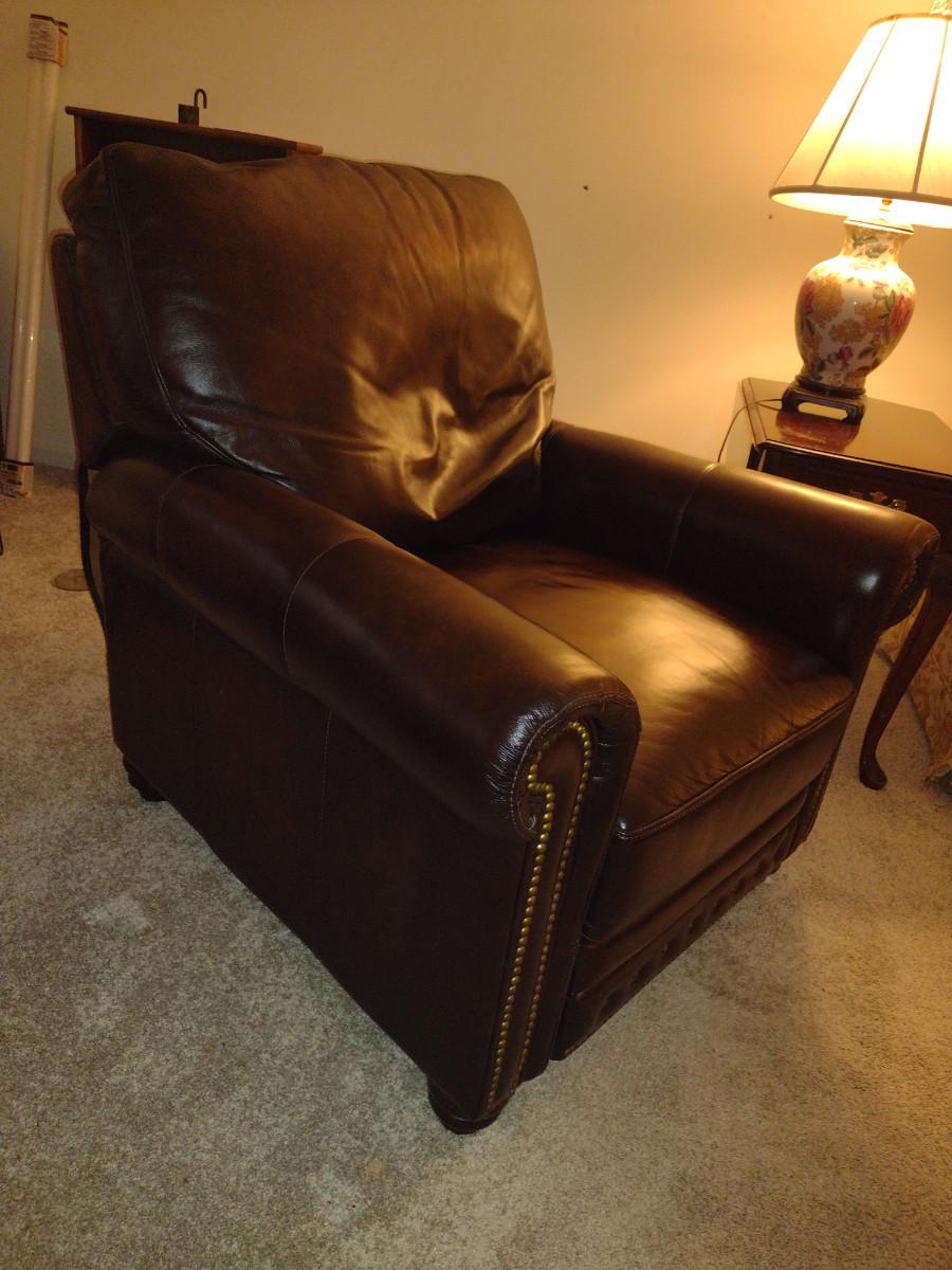 Bassett Pushback Reclining Chair with Brass Tack Accents. Upholstery appears to be leather.