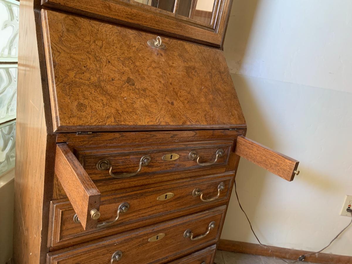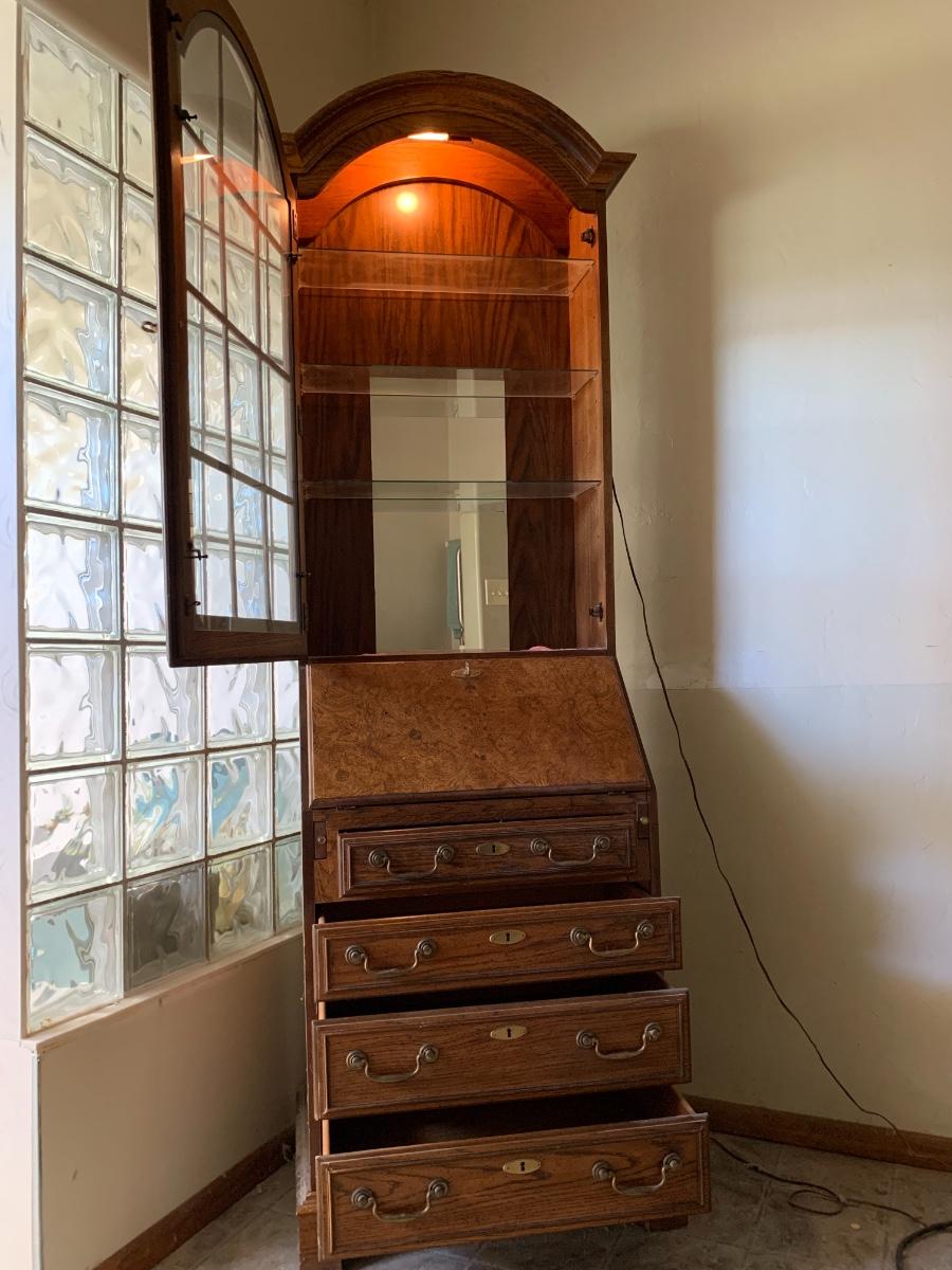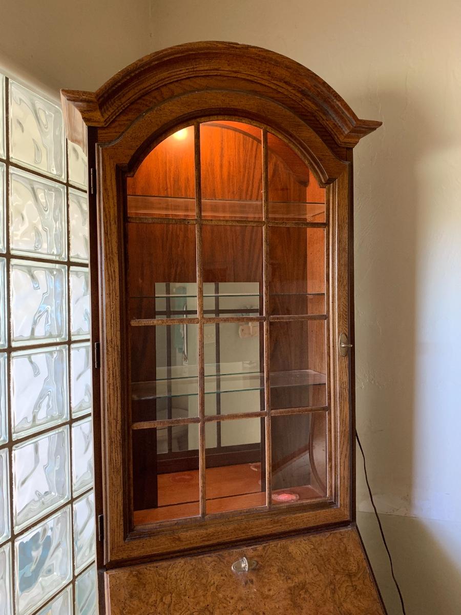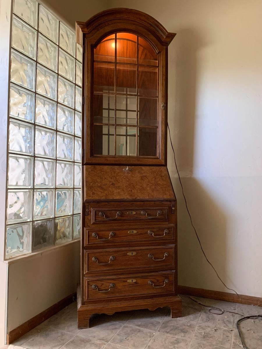 Bassett Secretary Desk with a bonnet top. Has four drawers, the desk and upper glass cabinet with three shelves. Has one built in light. In good condition with the exception of candle wax stuck on one of the shelves and minor warping to glass door front. (82 inches at its tallest point, 24 inches in width, 16 inches in depth)