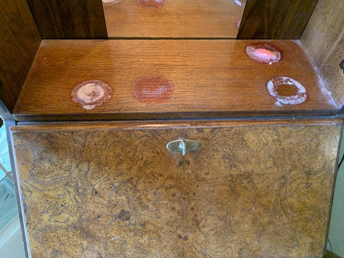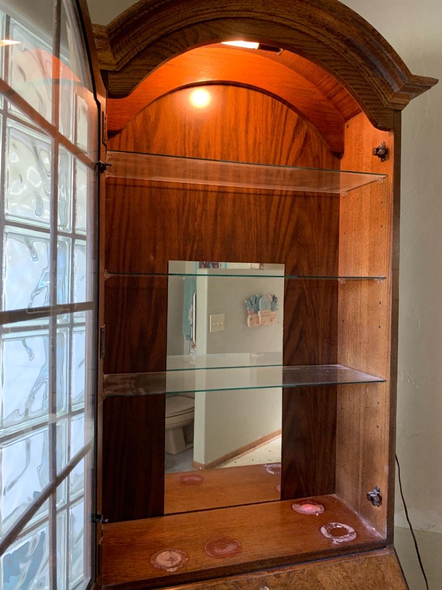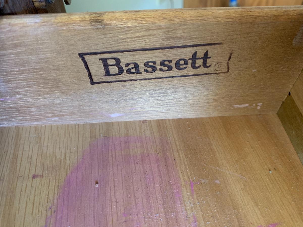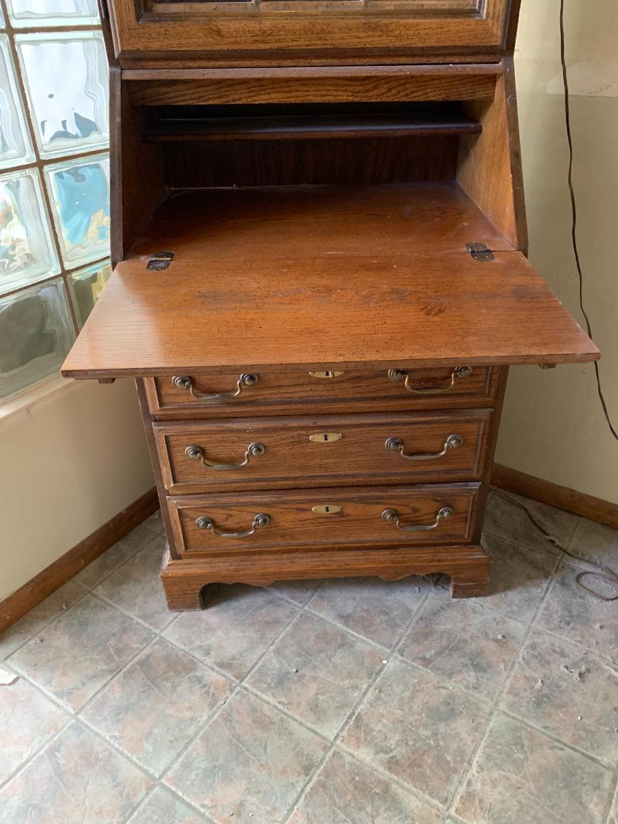 Bassett Secretary Desk with a bonnet top. Has four drawers, the desk and upper glass cabinet with three shelves. Has one built in light. In good condition with the exception of candle wax stuck on one of the shelves and minor warping to glass door front. (82 inches at its tallest point, 24 inches in width, 16 inches in depth)