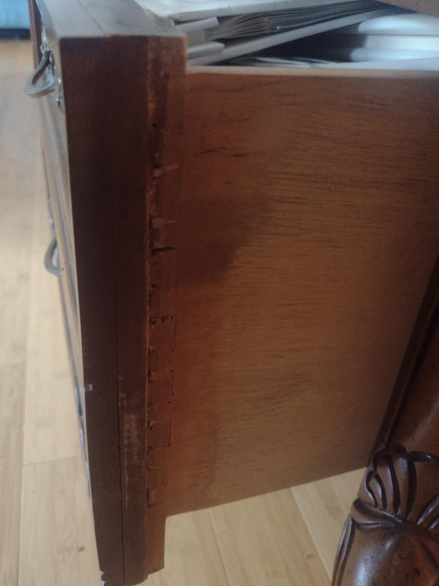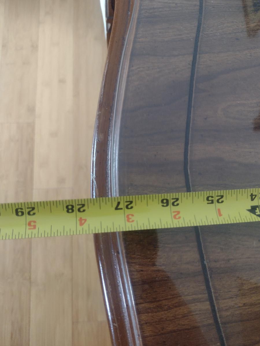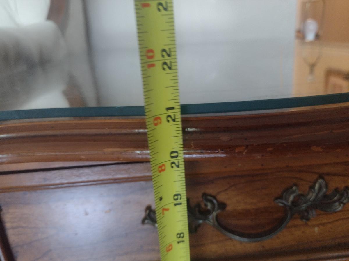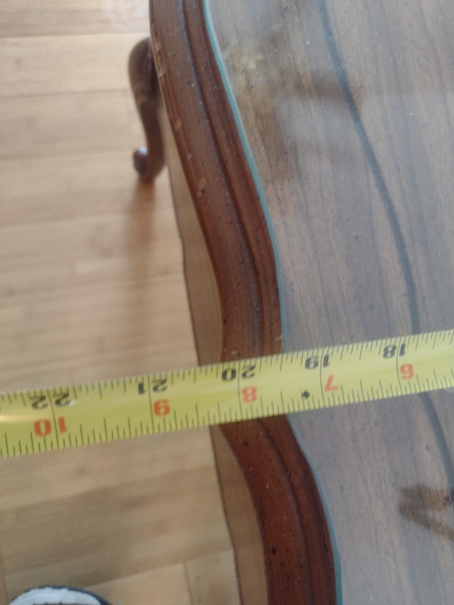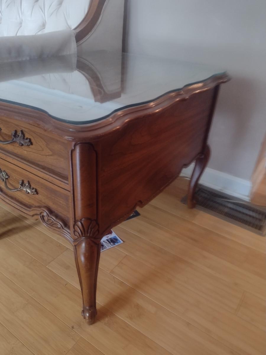 Bassett Wood Finish Side Table with Storage Drawer and Glass Top (Choice A). Item measures approx 20" wide, 27 3/4" deep, 21" tall. Please see all pictures for condition of finish.