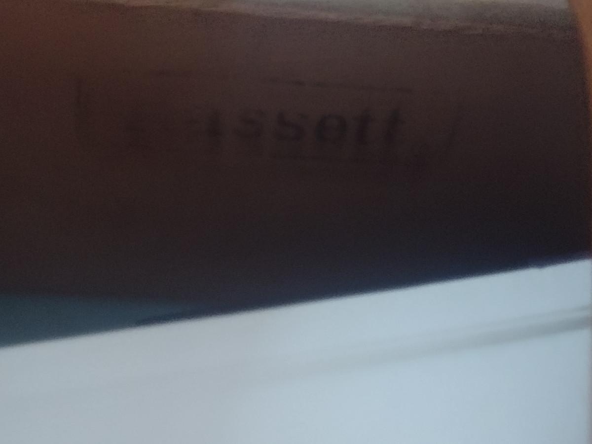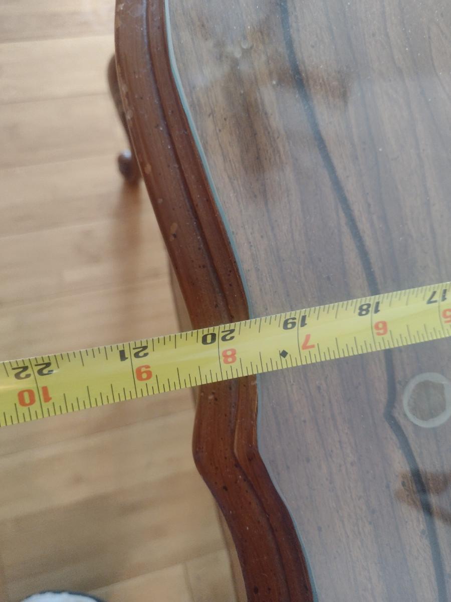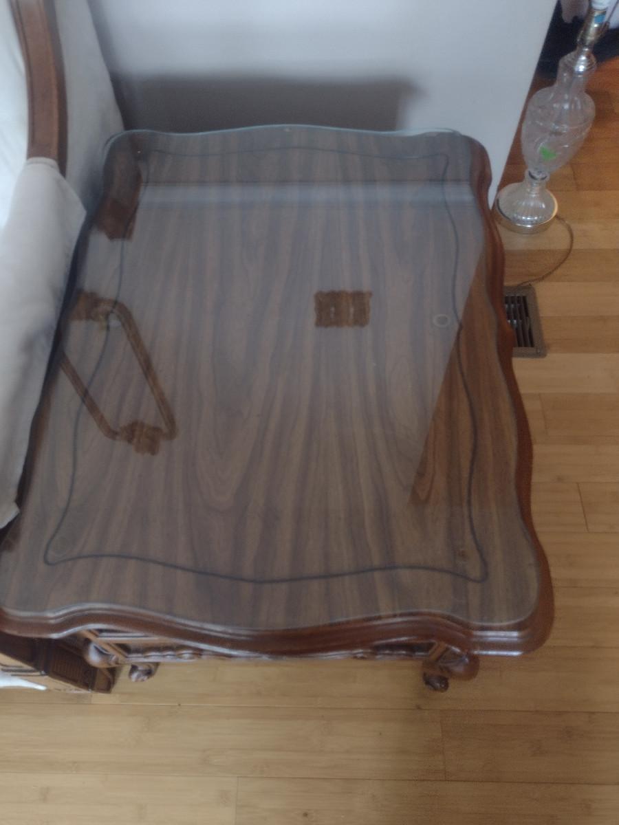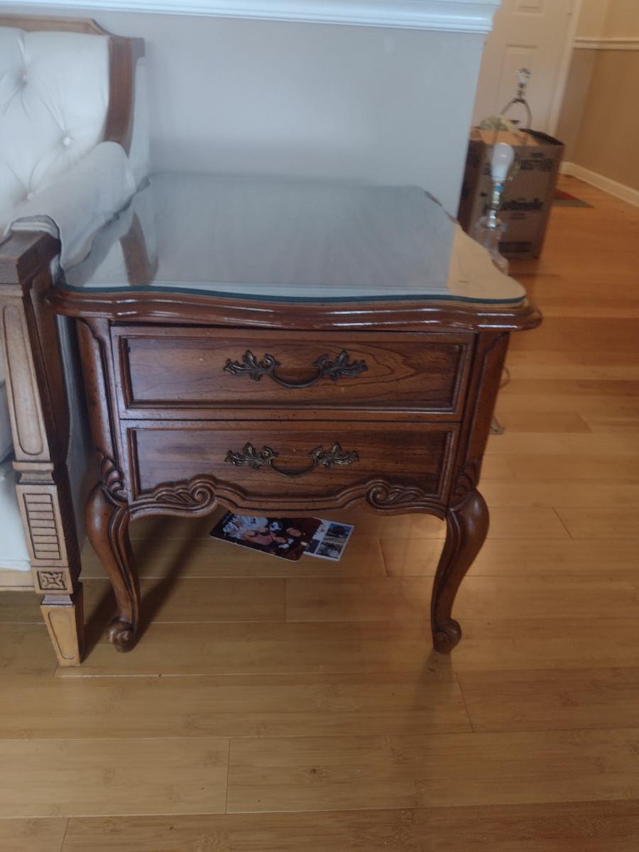 Bassett Wood Finish Side Table with Storage Drawer and Glass Top (Choice B). Item measures approx 20" wide, 27 3/4" deep, 21" tall. Please see all pictures for condition of finish.