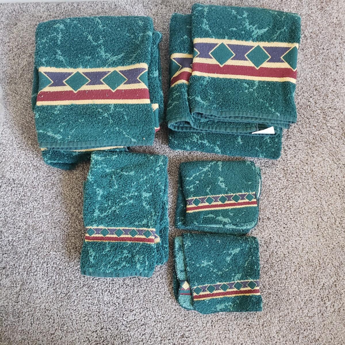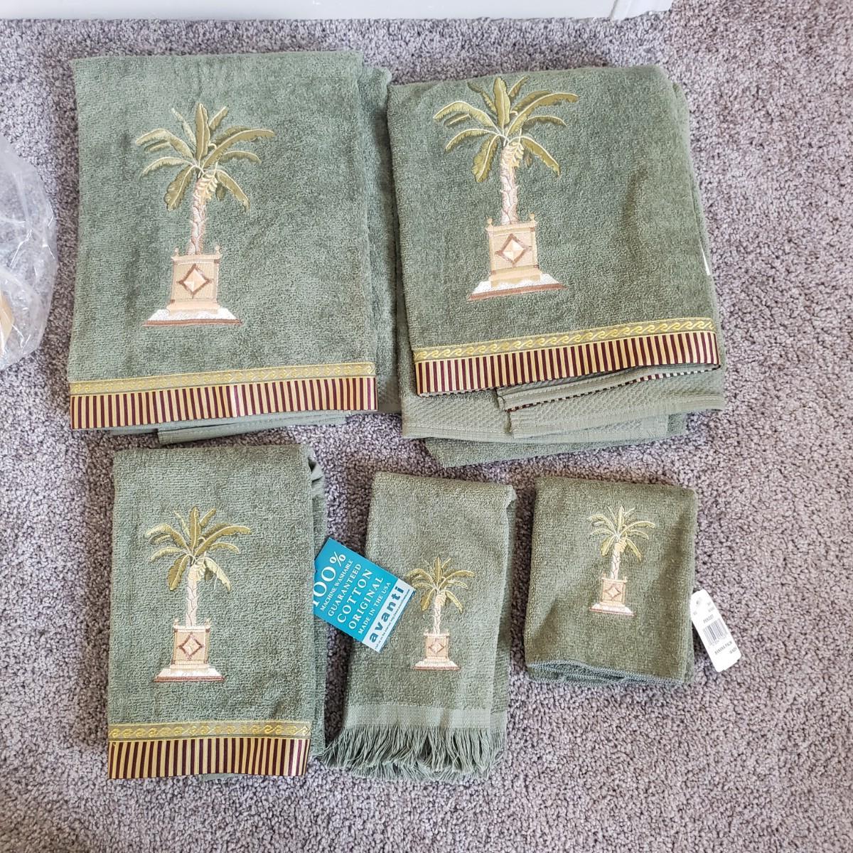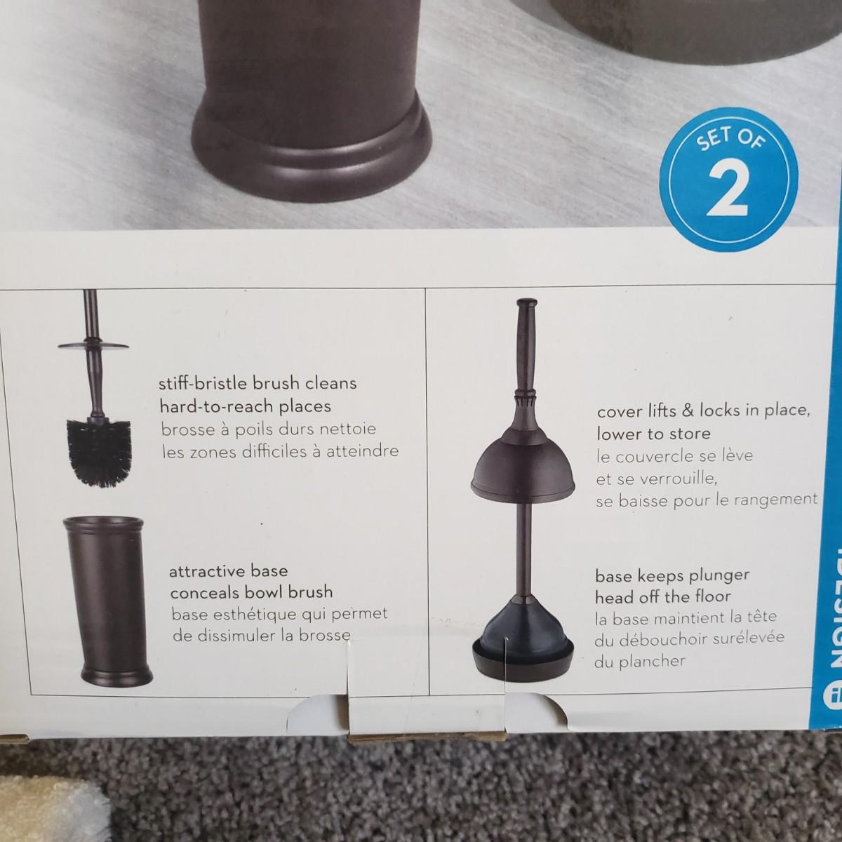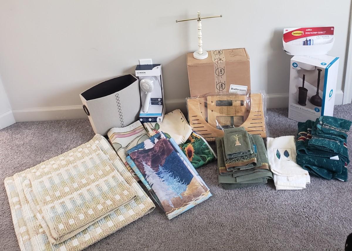 This is a large bathroom accessory lot. There are NIB items: Moen shower head, a bamboo squatty potty, iDesign plunger/brush set, and a Command shower caddy. There are towel sets, cotton rugs, the largest rug measures 48" x 27". The tweed trash can with faux leather bottom measures 14" x 17" x 13"H. The vintage hand towel rack with a marble base measures 4" x 11" x 12"H. There is a rusting spot on some metal rings between the plastic pieces. Also included is a black metal toilet roll holder (measures 8” x 5” x 14”H) and a matching set of Wamsutta ceramic bathroom accessories; bin has two hairline cracks, it measures 9”D x 10”H.