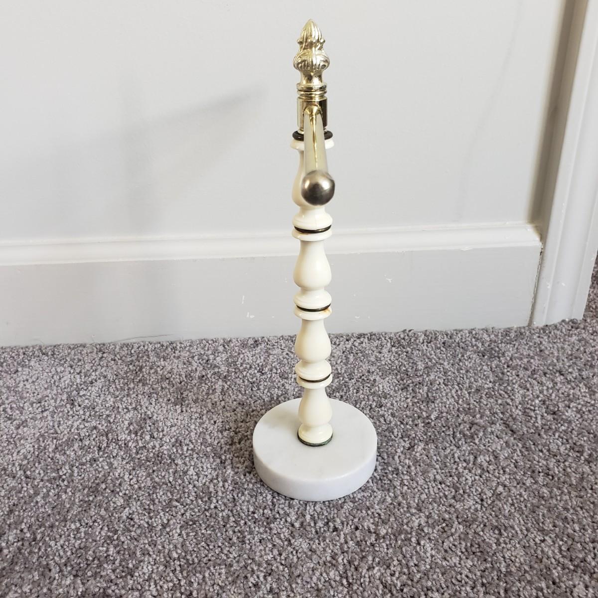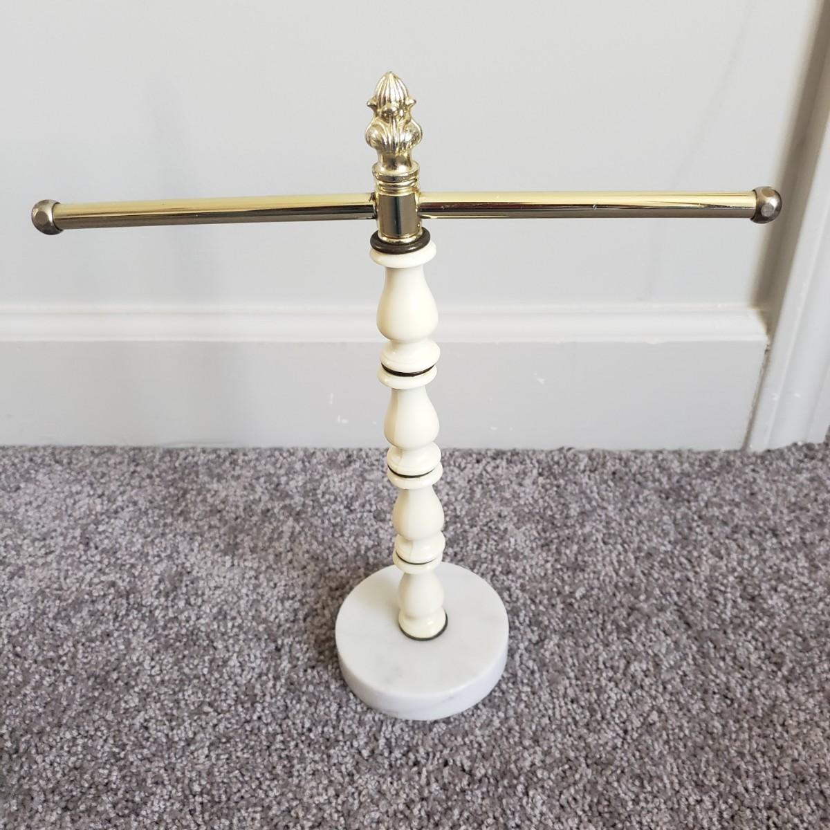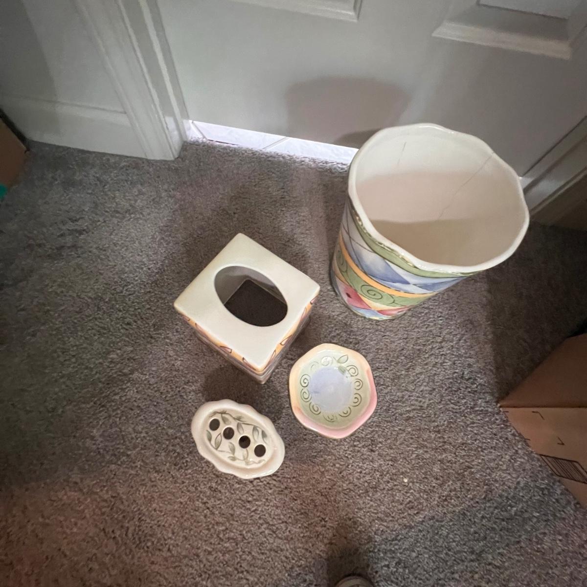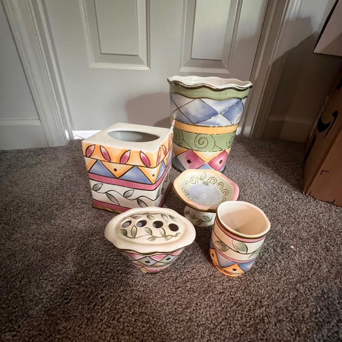 This is a large bathroom accessory lot. There are NIB items: Moen shower head, a bamboo squatty potty, iDesign plunger/brush set, and a Command shower caddy. There are towel sets, cotton rugs, the largest rug measures 48" x 27". The tweed trash can with faux leather bottom measures 14" x 17" x 13"H. The vintage hand towel rack with a marble base measures 4" x 11" x 12"H. There is a rusting spot on some metal rings between the plastic pieces. Also included is a black metal toilet roll holder (measures 8” x 5” x 14”H) and a matching set of Wamsutta ceramic bathroom accessories; bin has two hairline cracks, it measures 9”D x 10”H.
