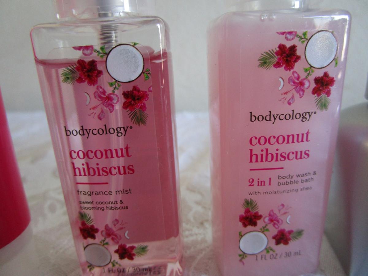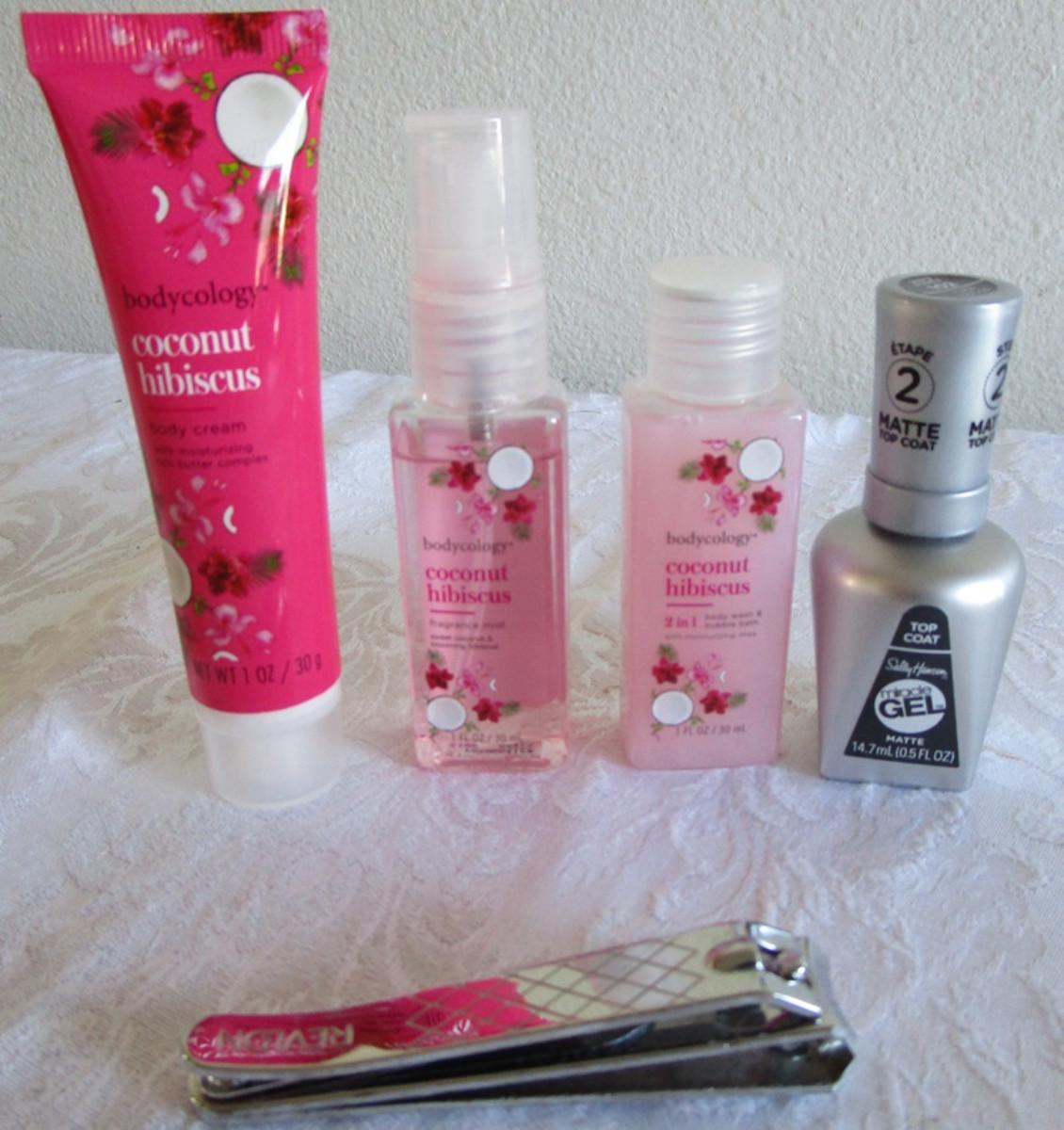 Bodycology Coconut Hibiscus mist & body wash & body cream, silver nail polish, nail clippers