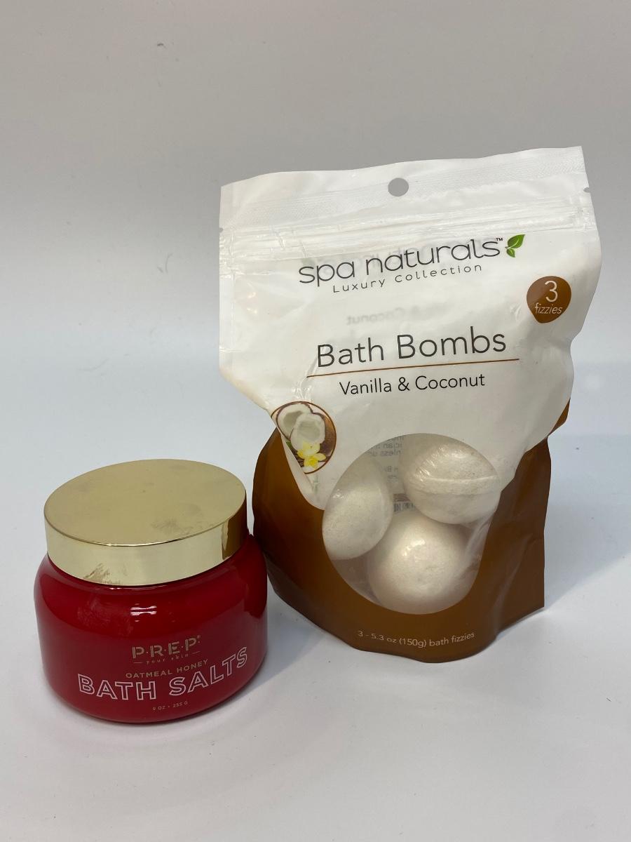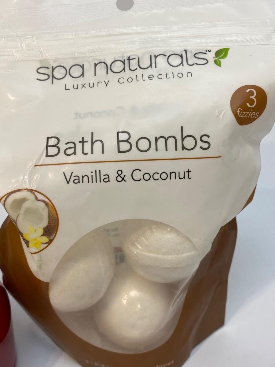 Vanilla coconut bath bombs, unopened set of 3 and a small jar of Prep Bath Salts. The bath salts are not sealed and do not have an inner seal, not sure if they were actually used, the container is full.