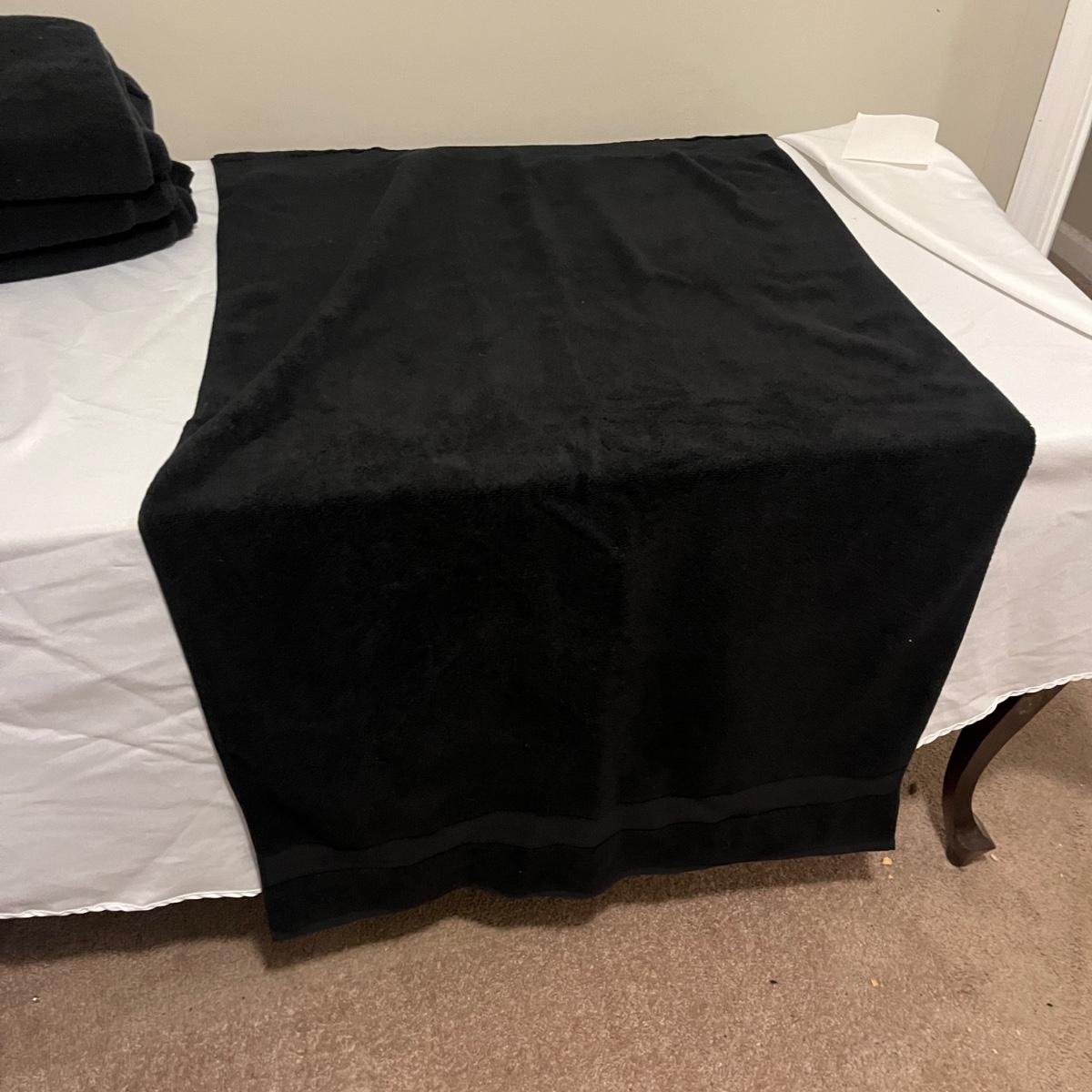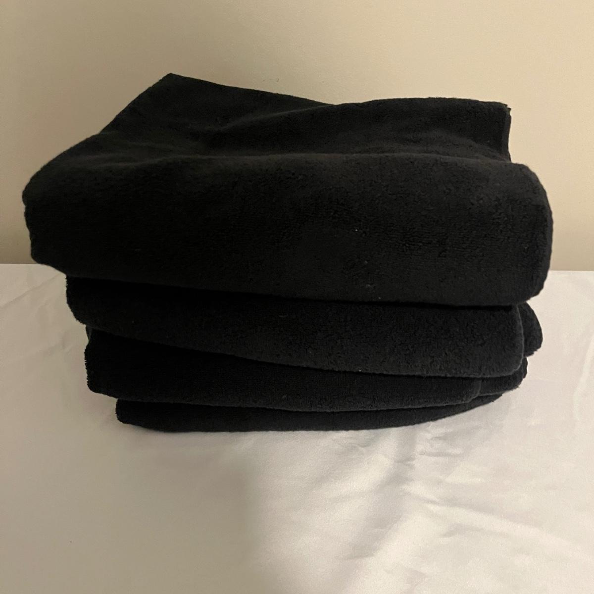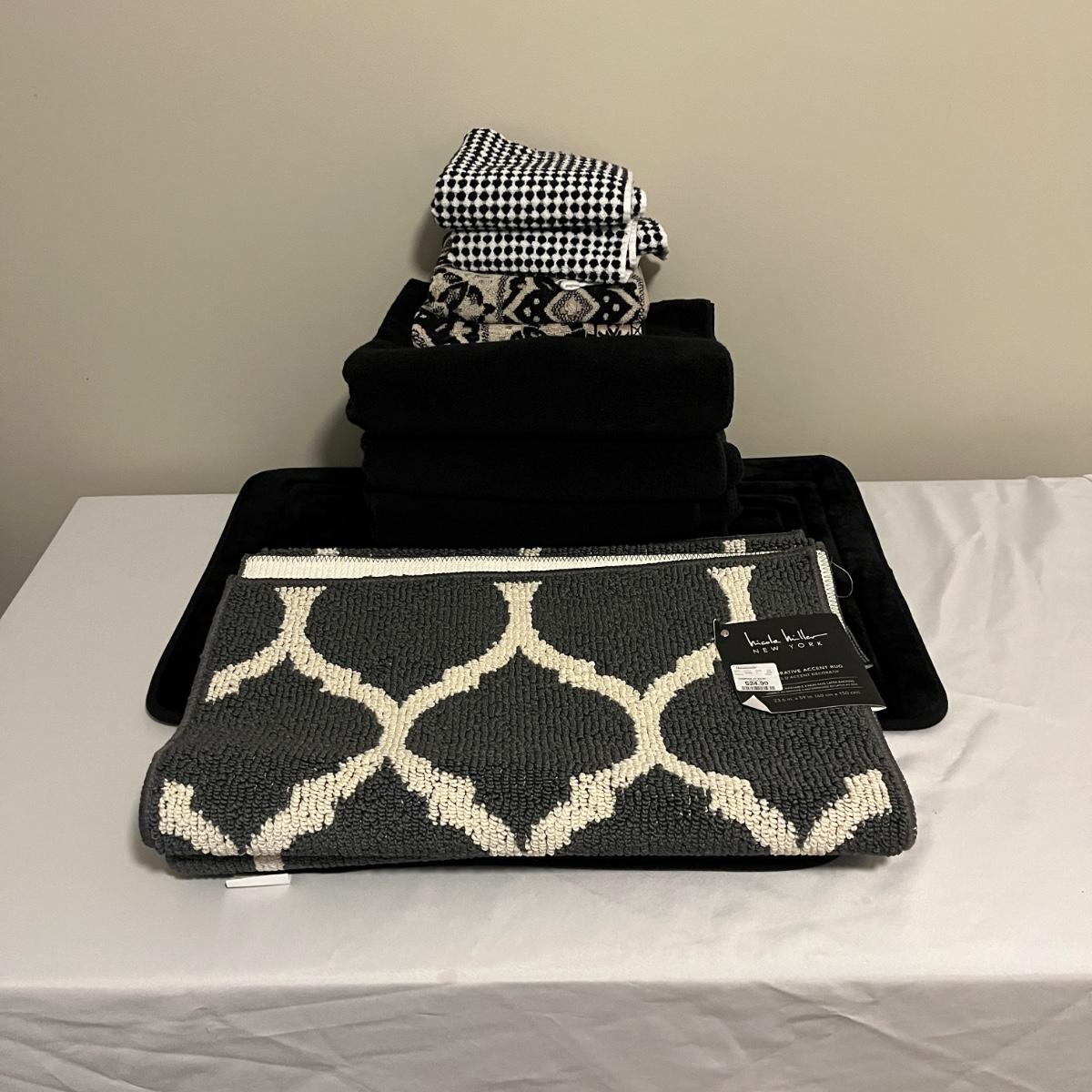 Lot includes four black bath towels that measure 30” x 54”, four hand towels, two bath mats and two matching accent rugs.