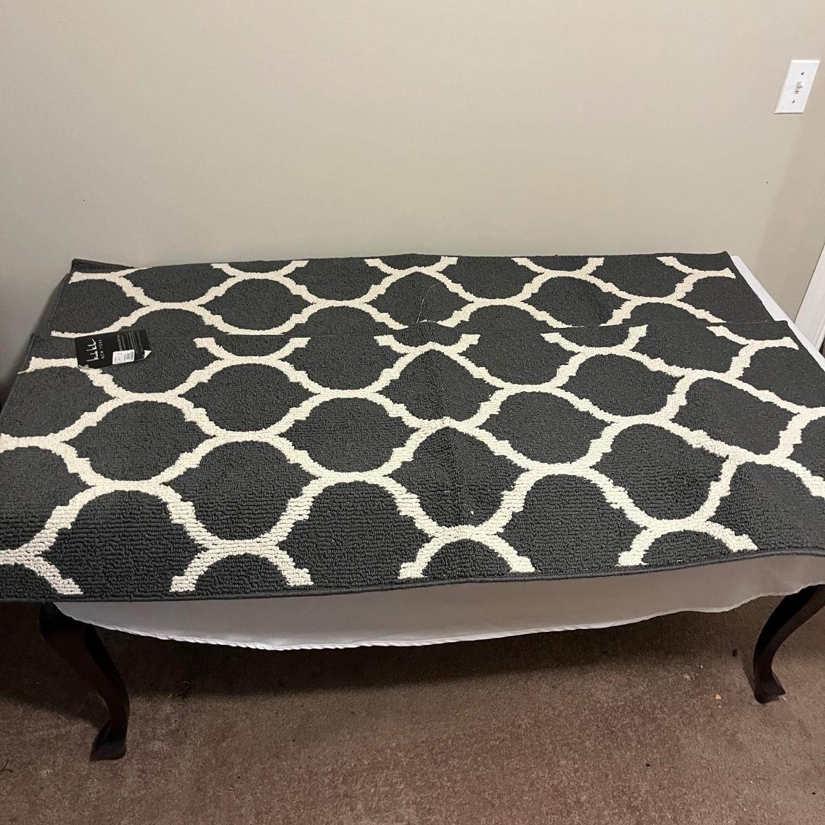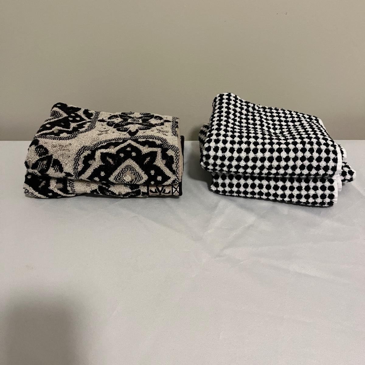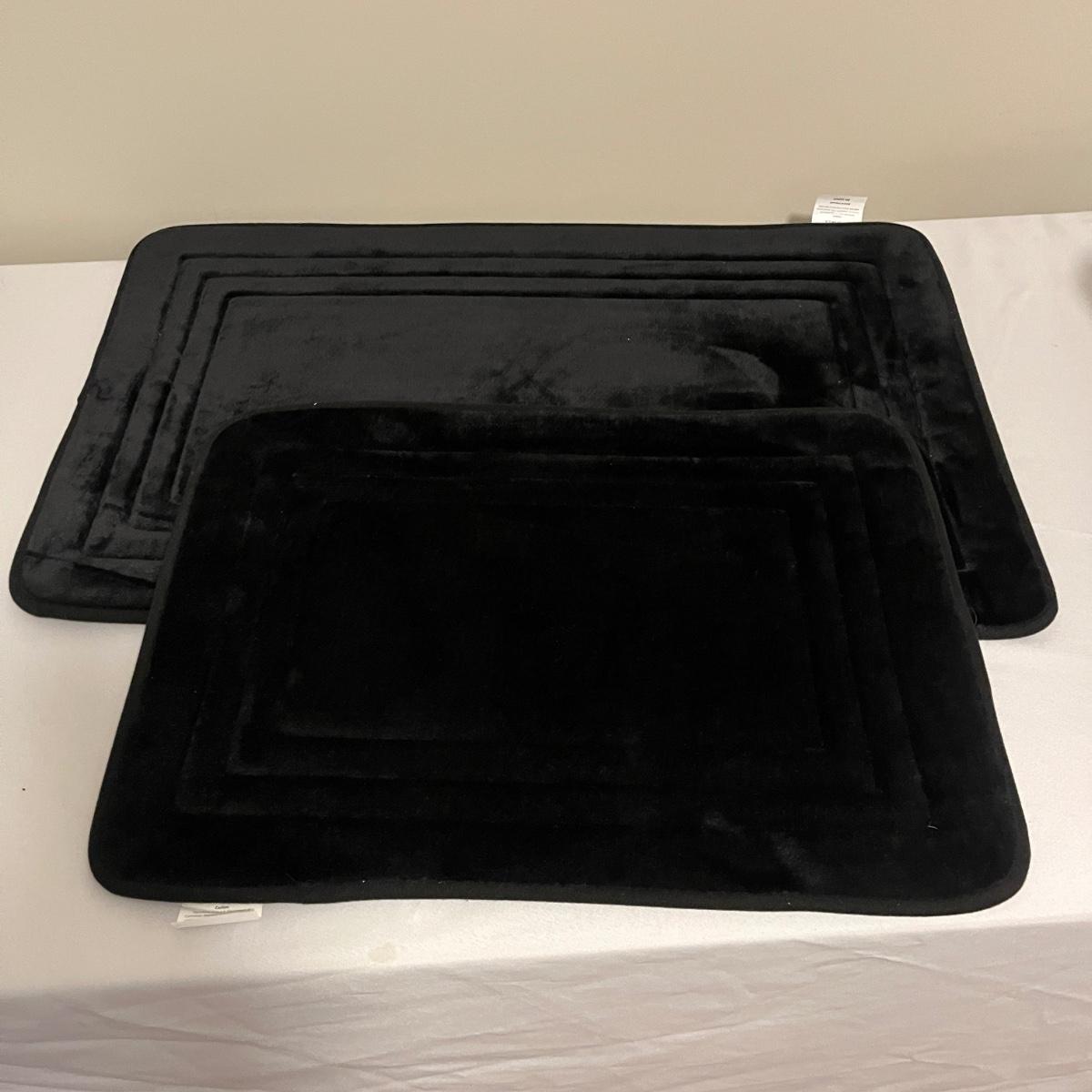 Lot includes four black bath towels that measure 30” x 54”, four hand towels, two bath mats and two matching accent rugs.