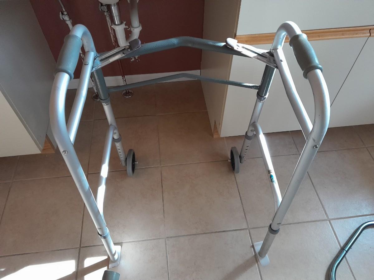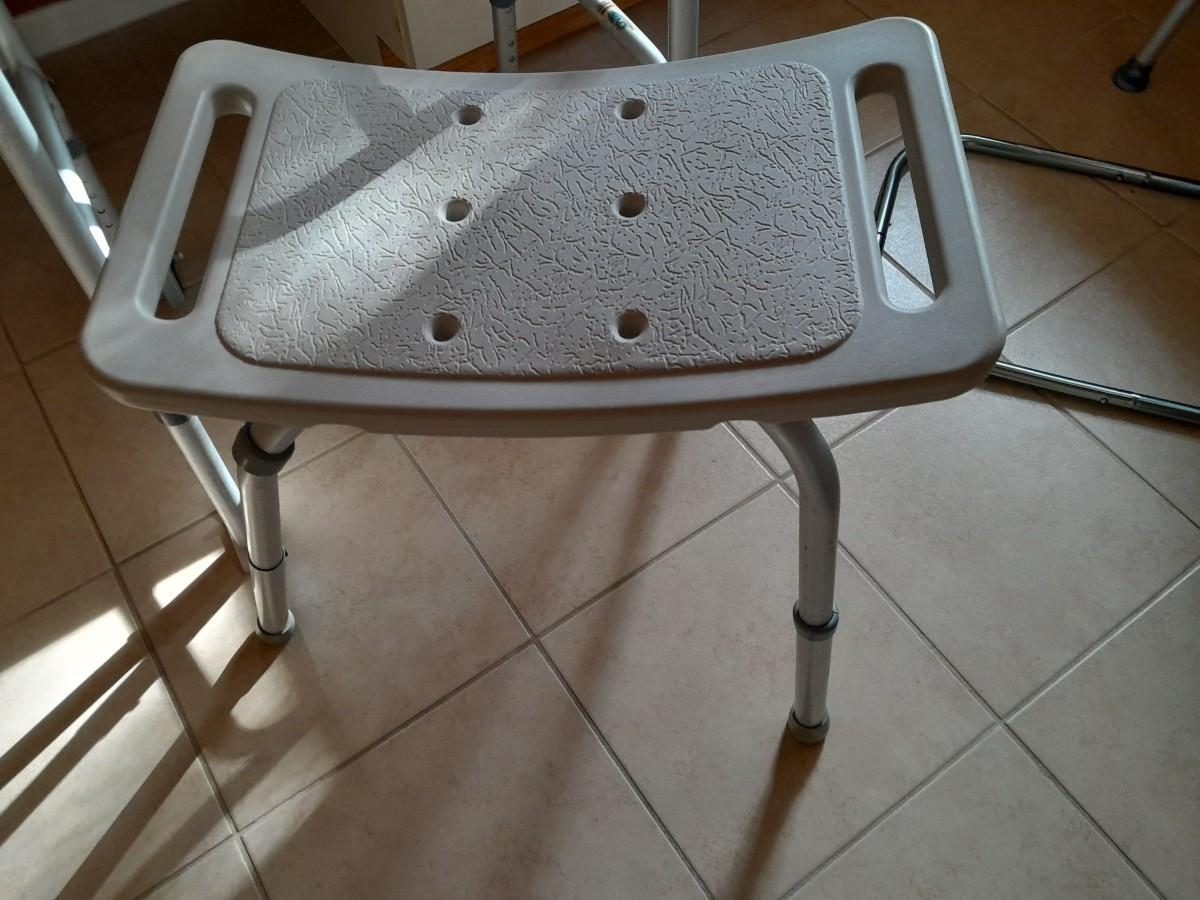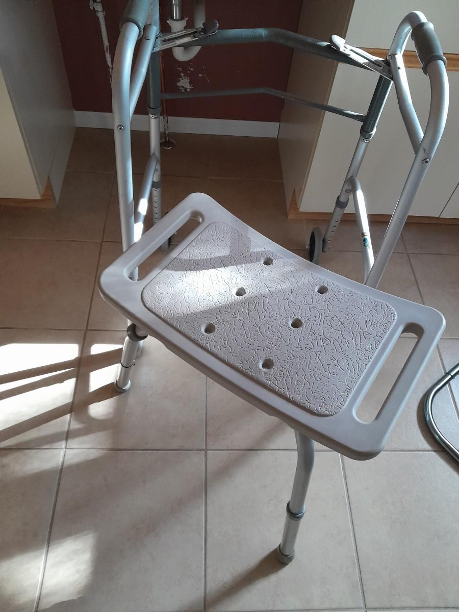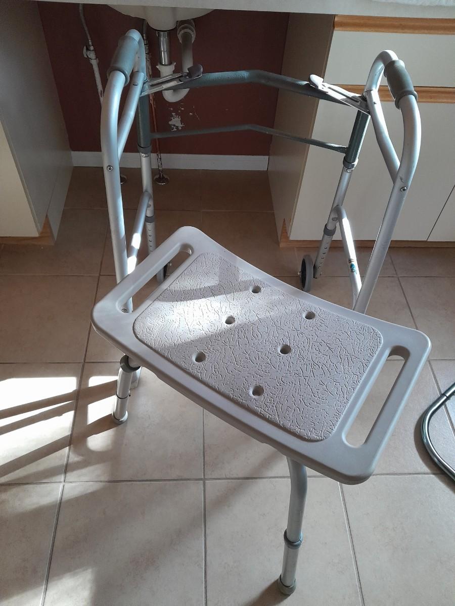 BATH SEAT WITH ADJUSTABLE LEGS (needs some tightening), AND A WALKER