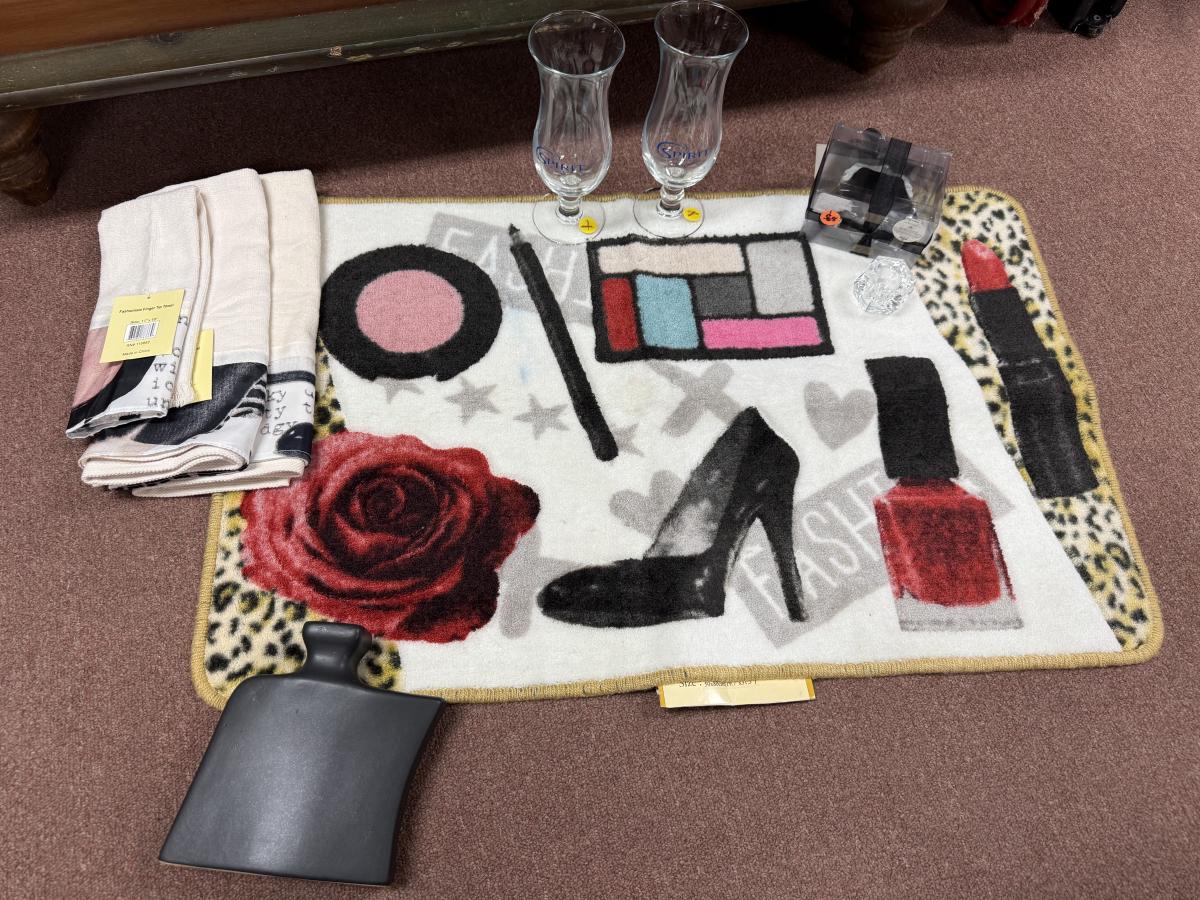 Bath rug w/matching hand towels, vase, candle, candle holder, 2 stemware