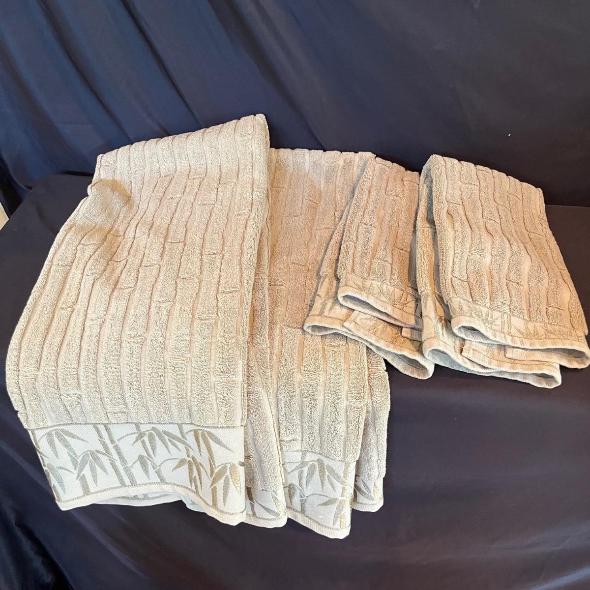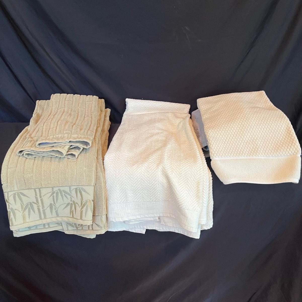 Lot includes two Premium Collection bath towels and hand towels, two Biltmore bath towels and two Kaufman bath towels and bath mat. Largest towel measures 54” x 30”.