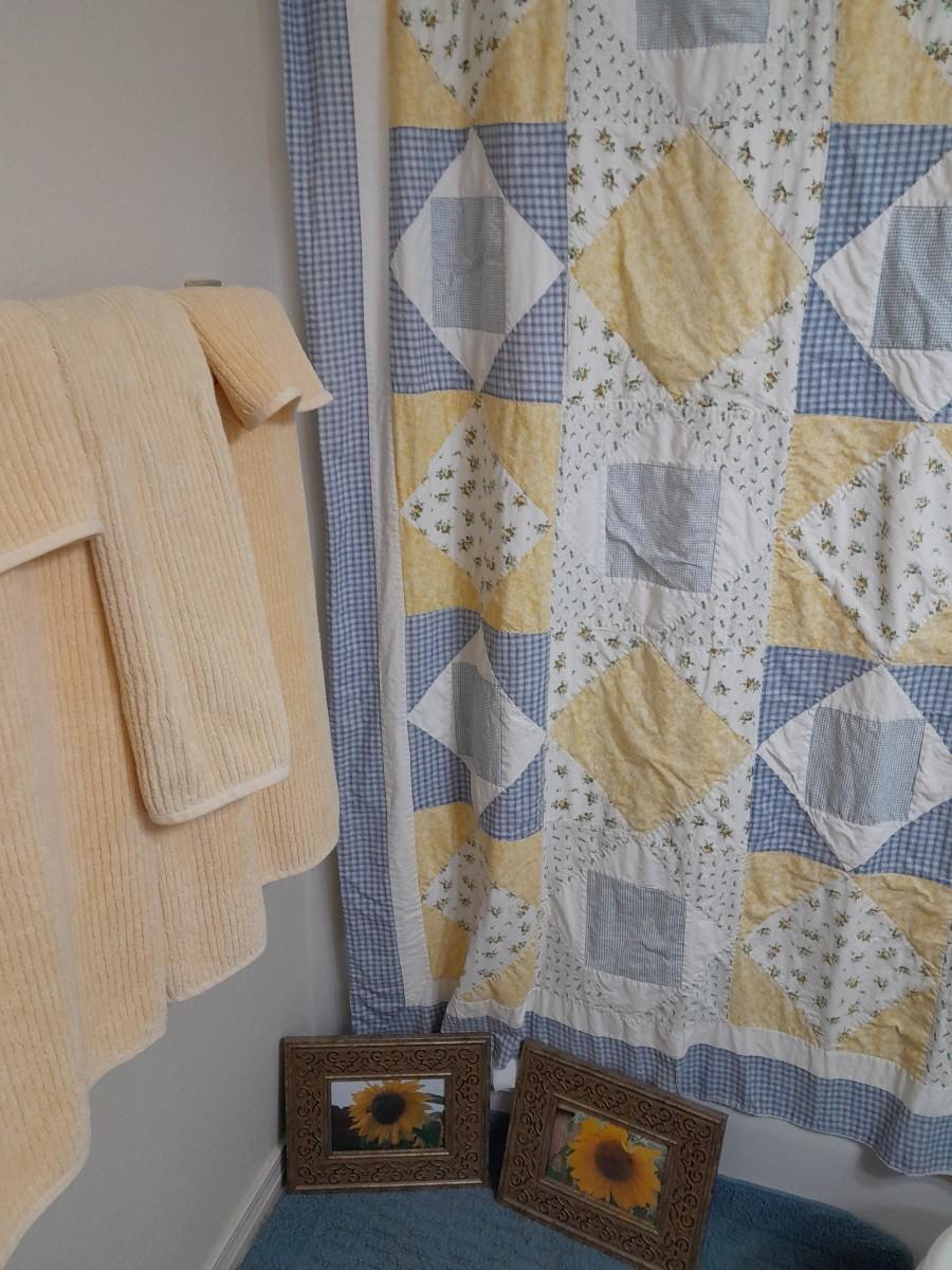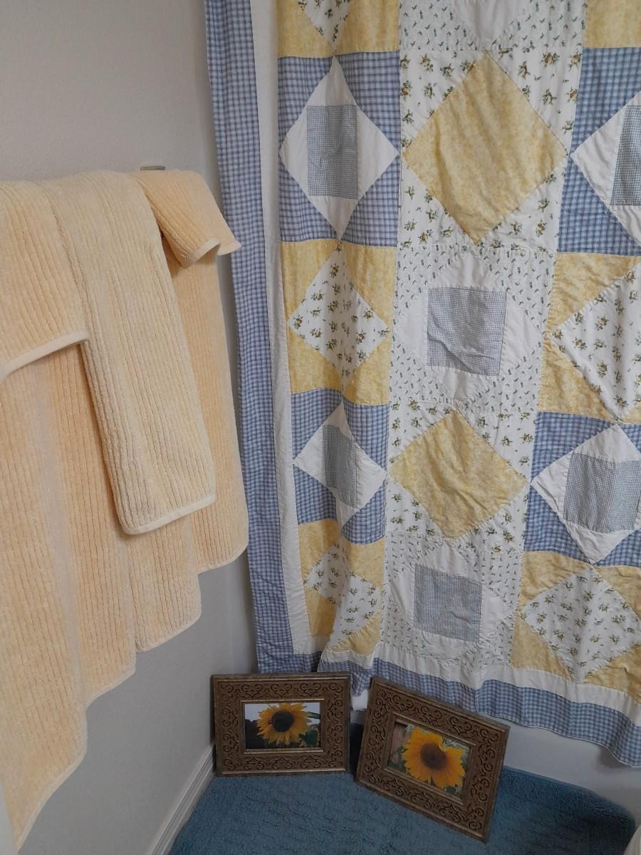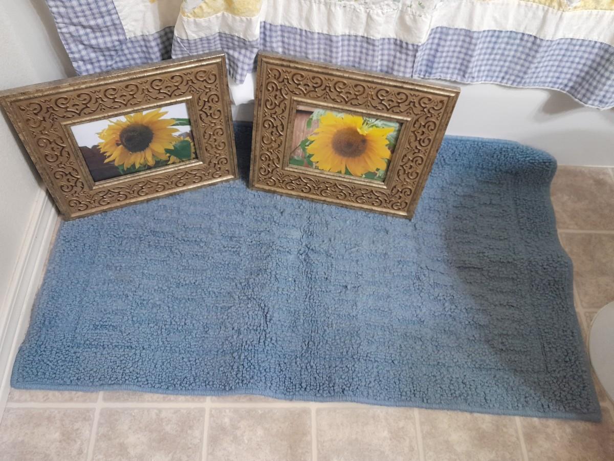 BATH TOWELS, SHOWER CURTAIN, RUG, AND FRAMED PICTURE