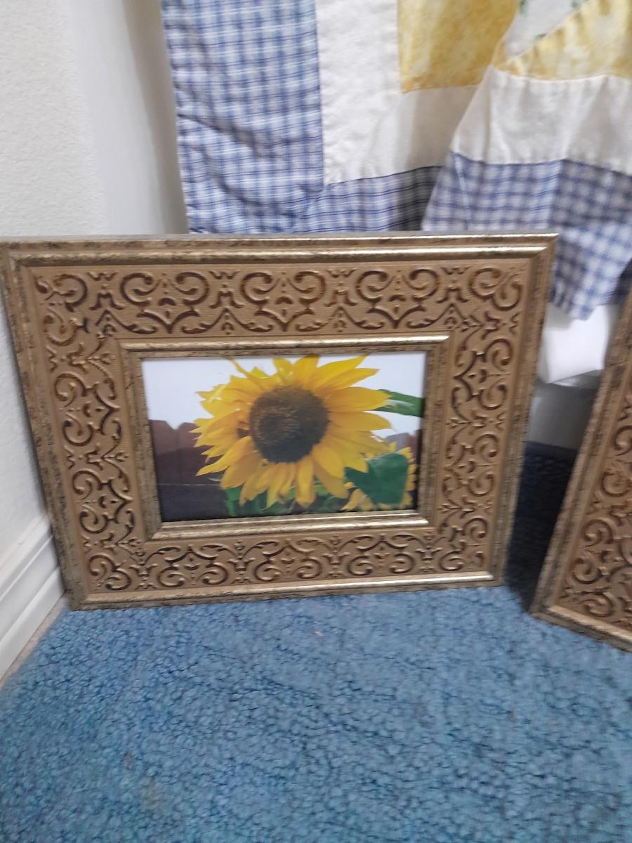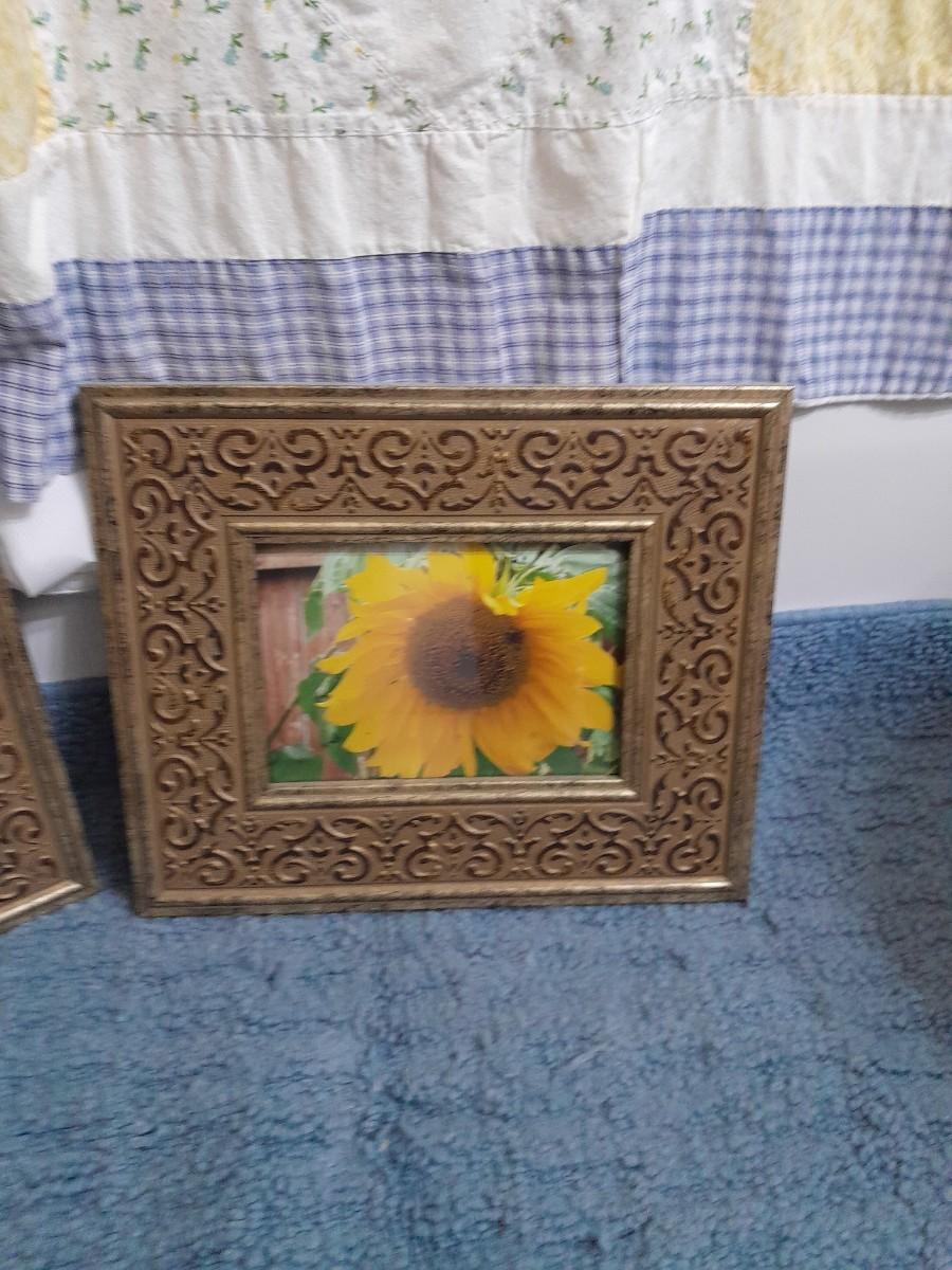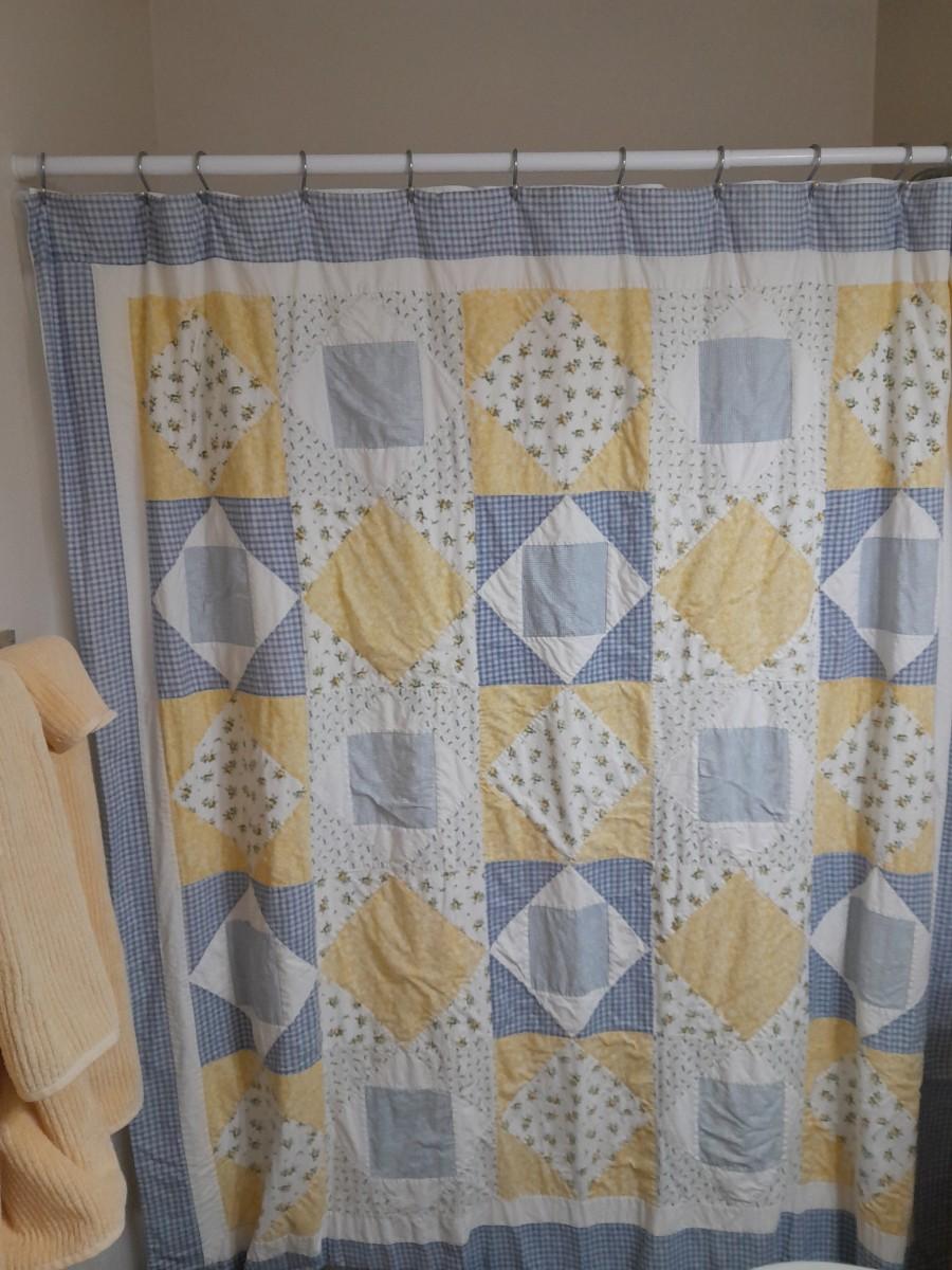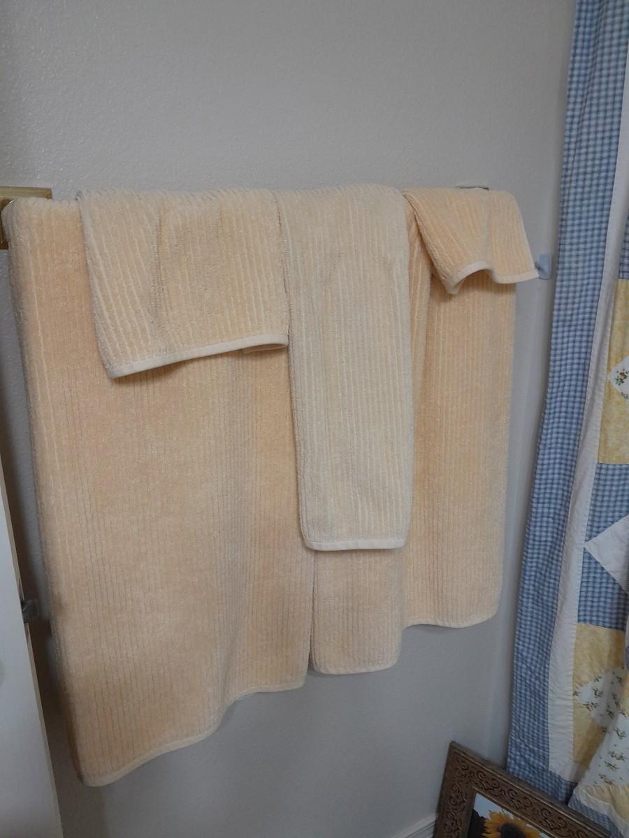 BATH TOWELS, SHOWER CURTAIN, RUG, AND FRAMED PICTURE