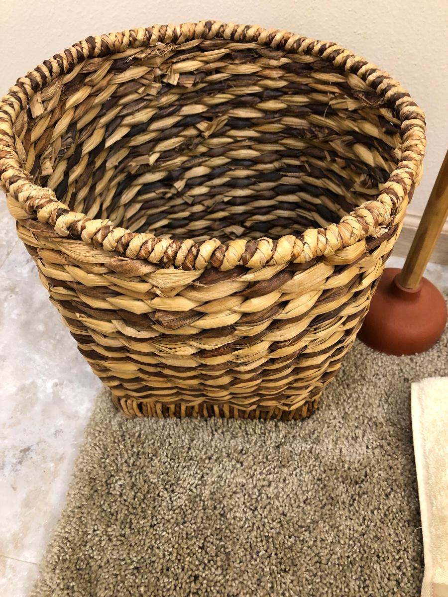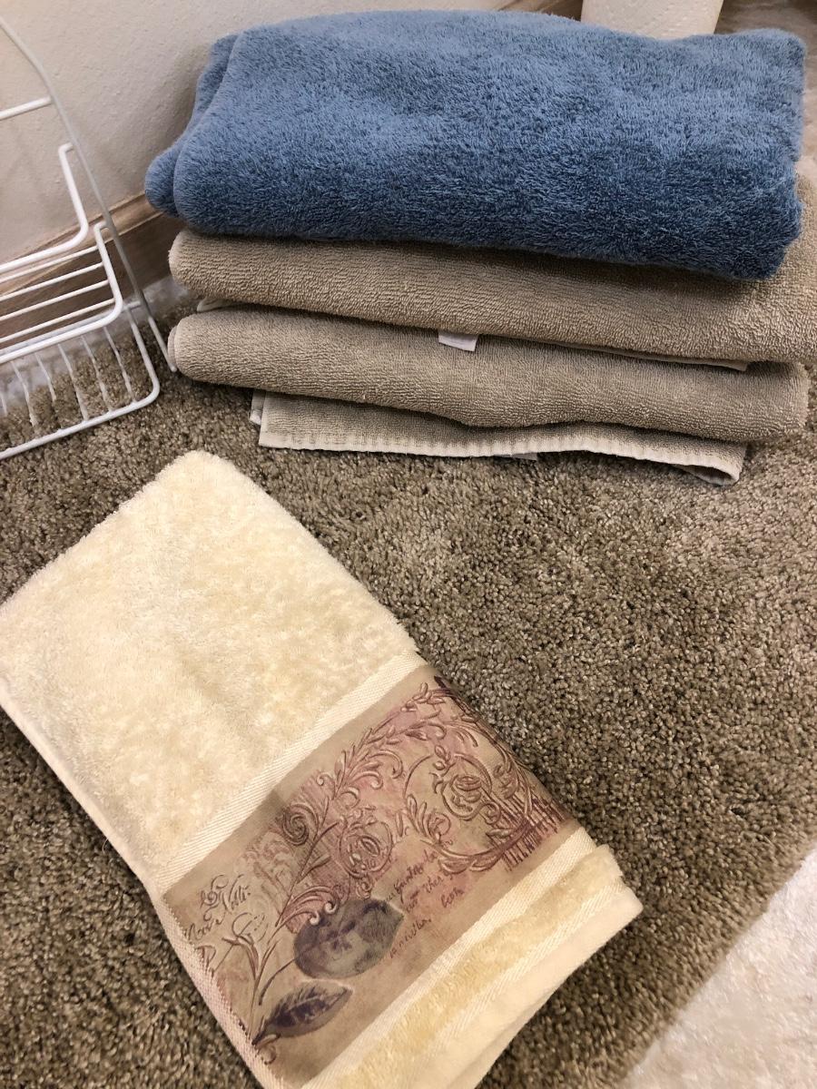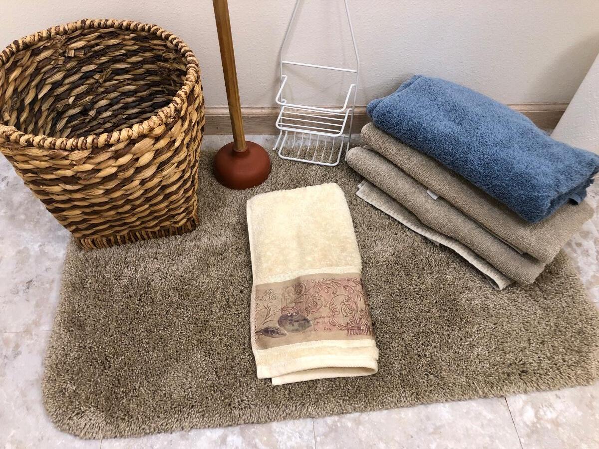 Bath8- Rug, towels, wastebasket, plunger, shower caddy