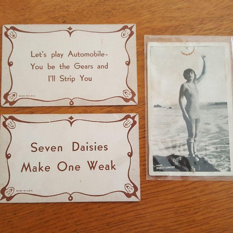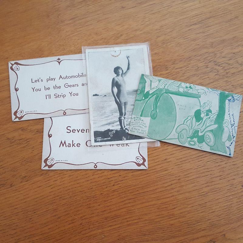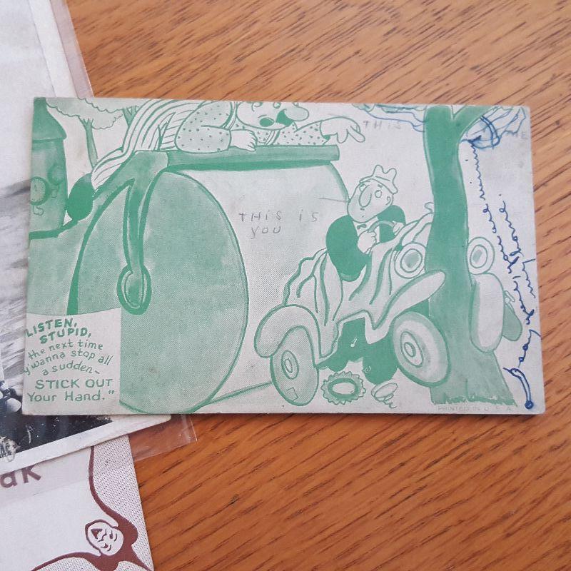 This auction lot is for a collection of 4 non-postal cards showing a Bathing Beauty, 2 Wise Crack cards and a humorous card showing a steamroller encountering a small car right into a tree. Folks used these to post of business bulletin boards way back before thoughts could be shared on Facebook, et al. History here!