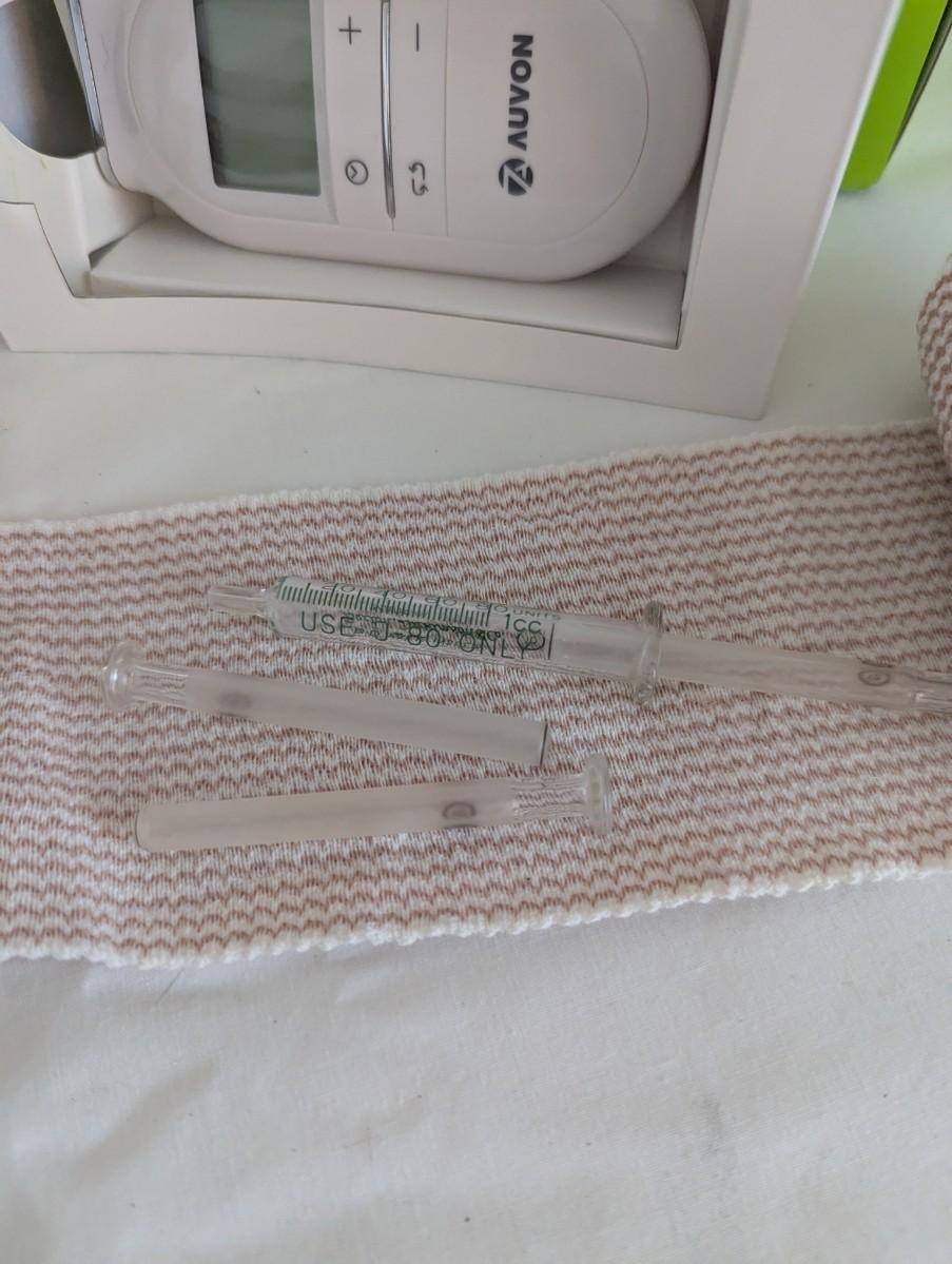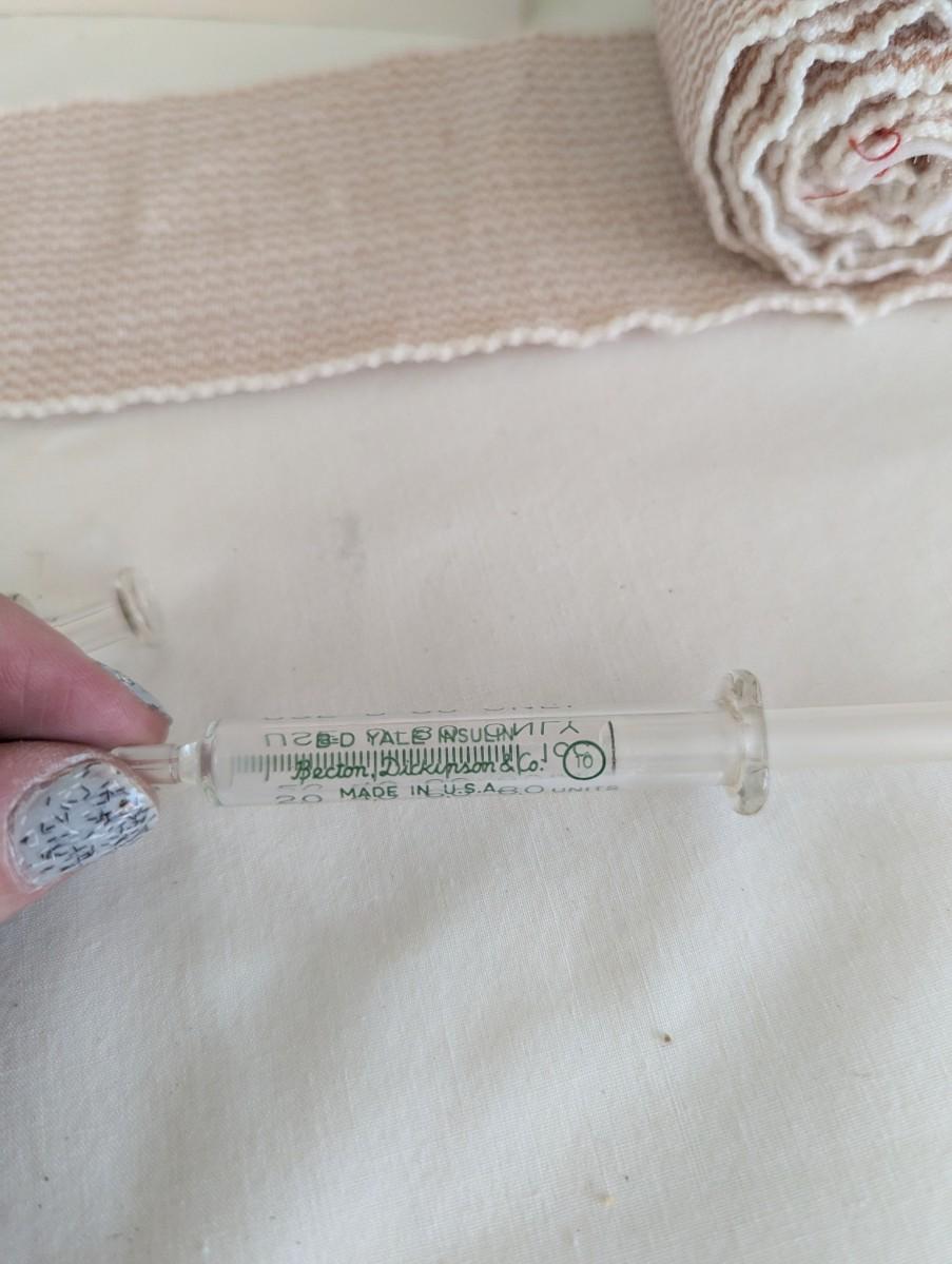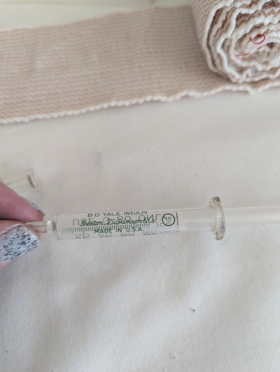 Tense unit, ace bandages, vintage vasoline (jar). Old glass syringes.