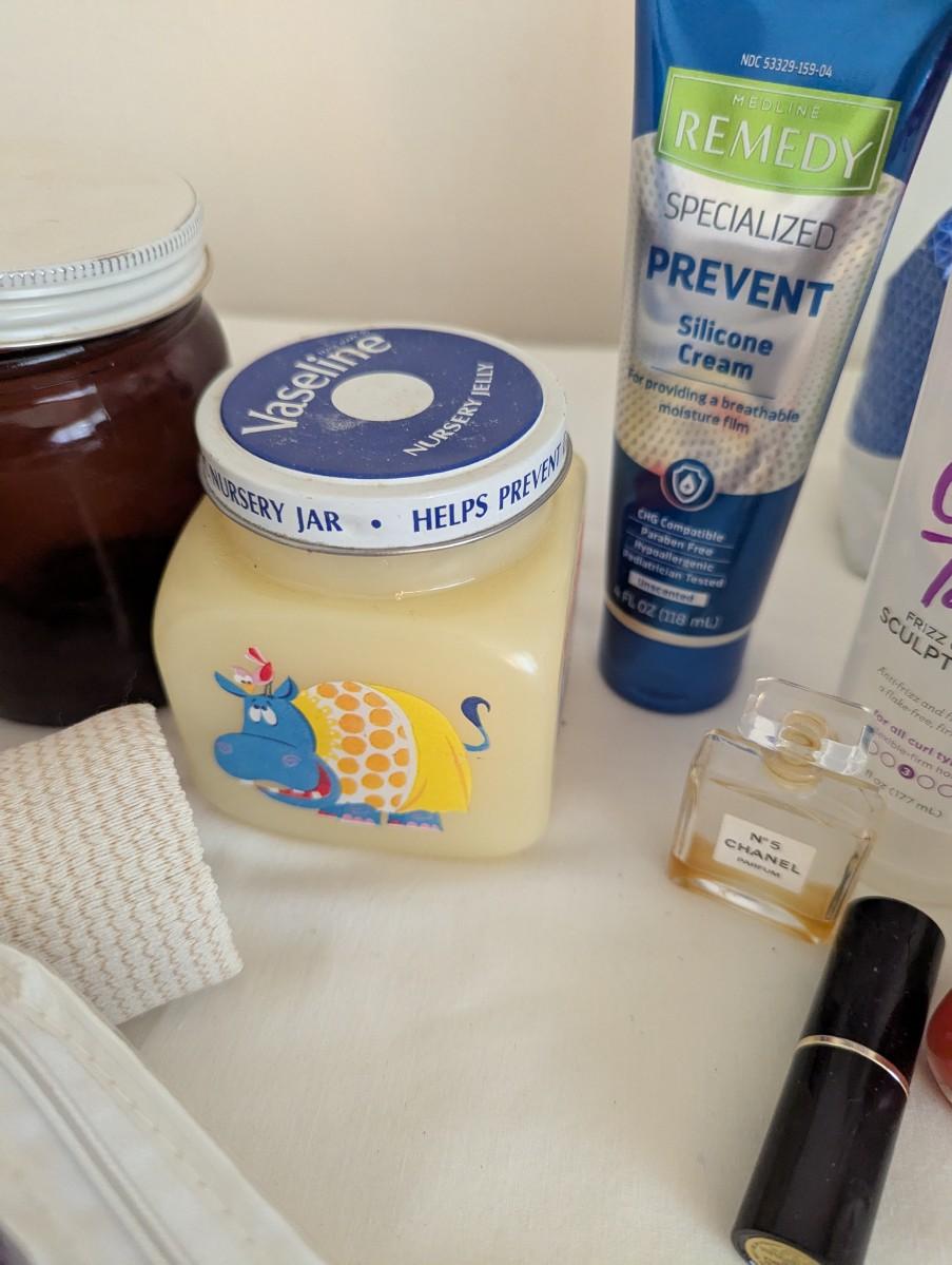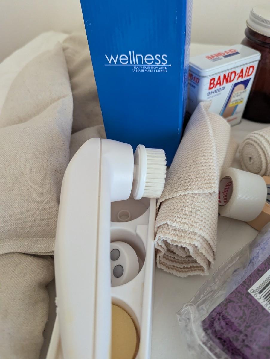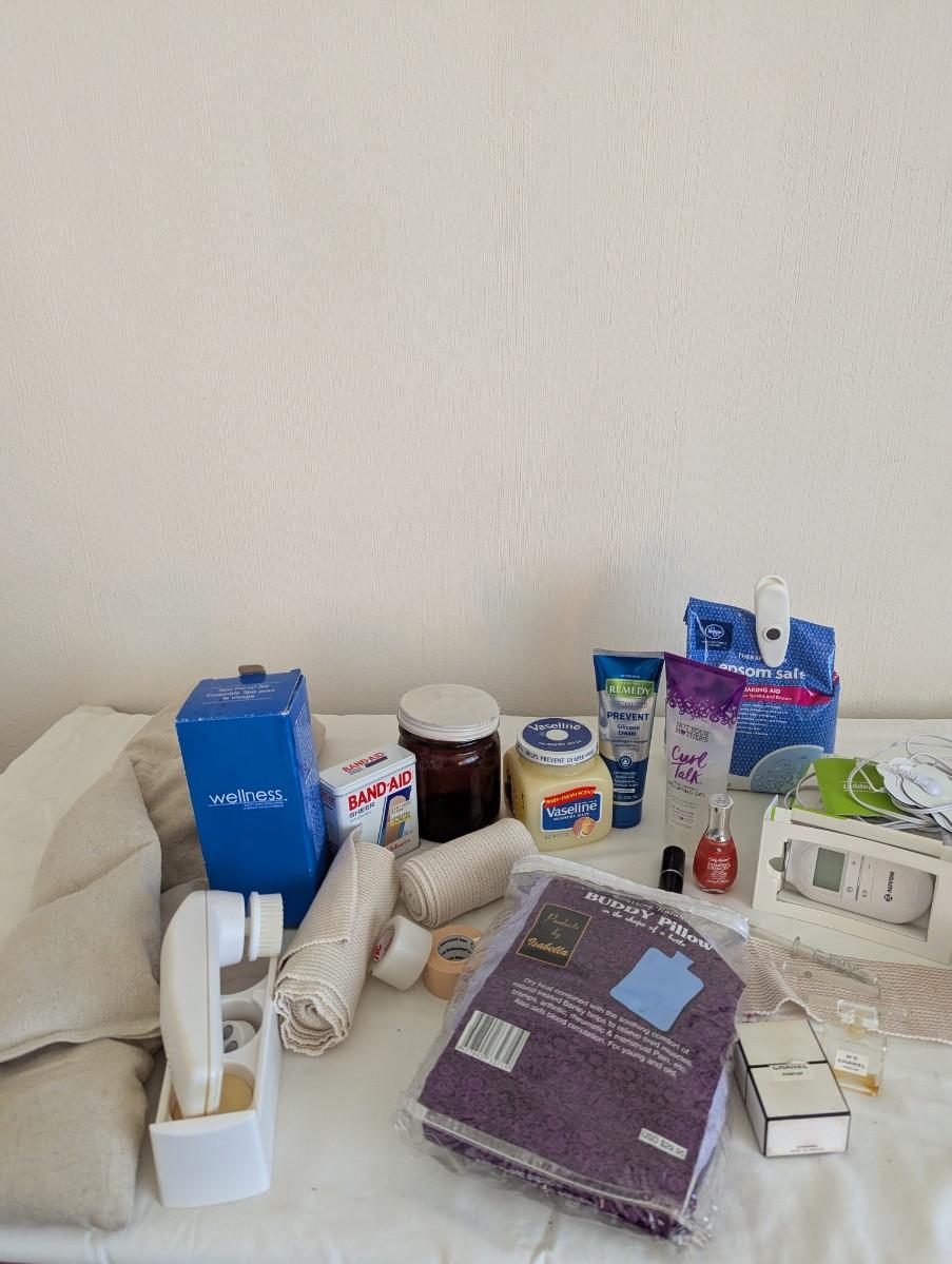 Tense unit, ace bandages, vintage vasoline (jar). Old glass syringes.