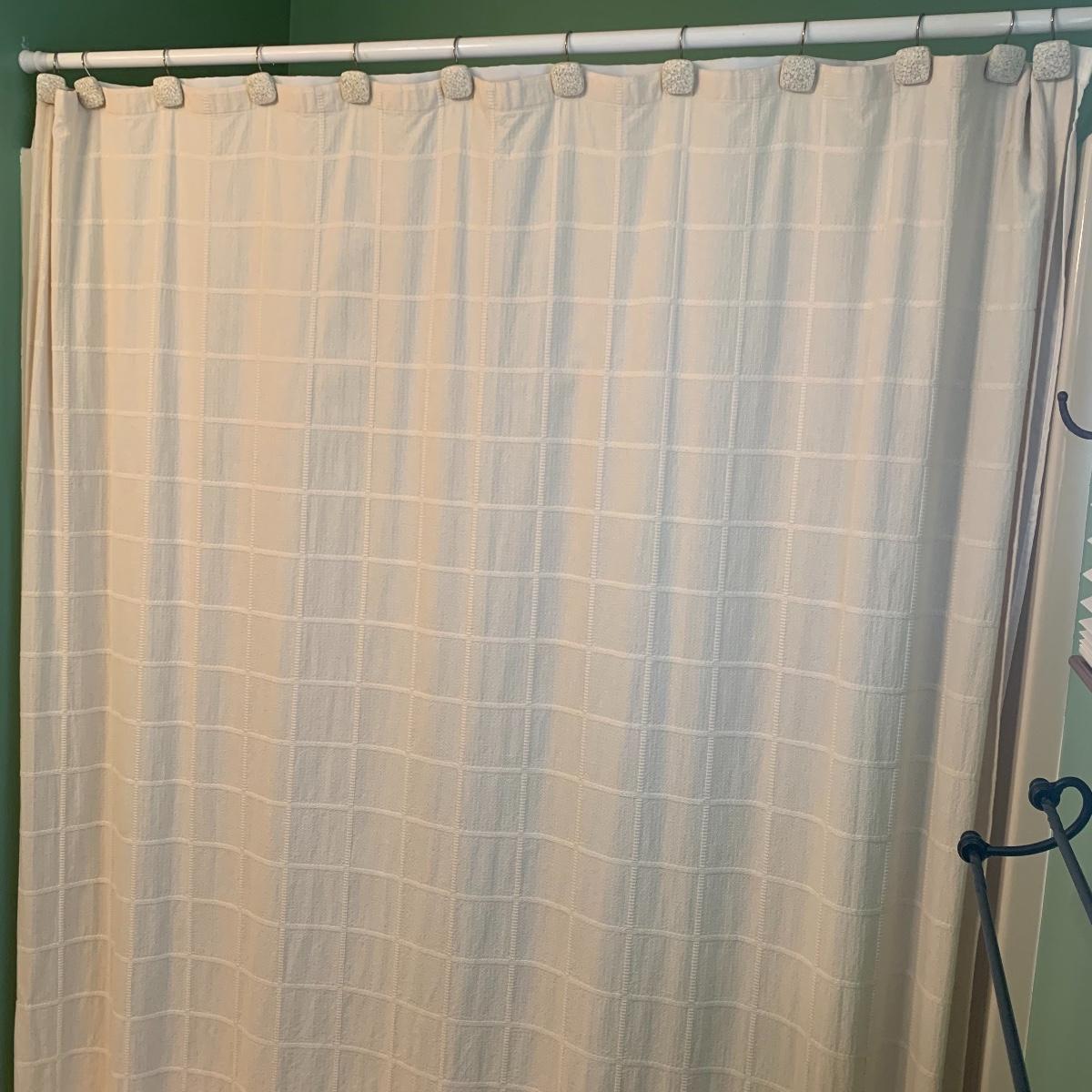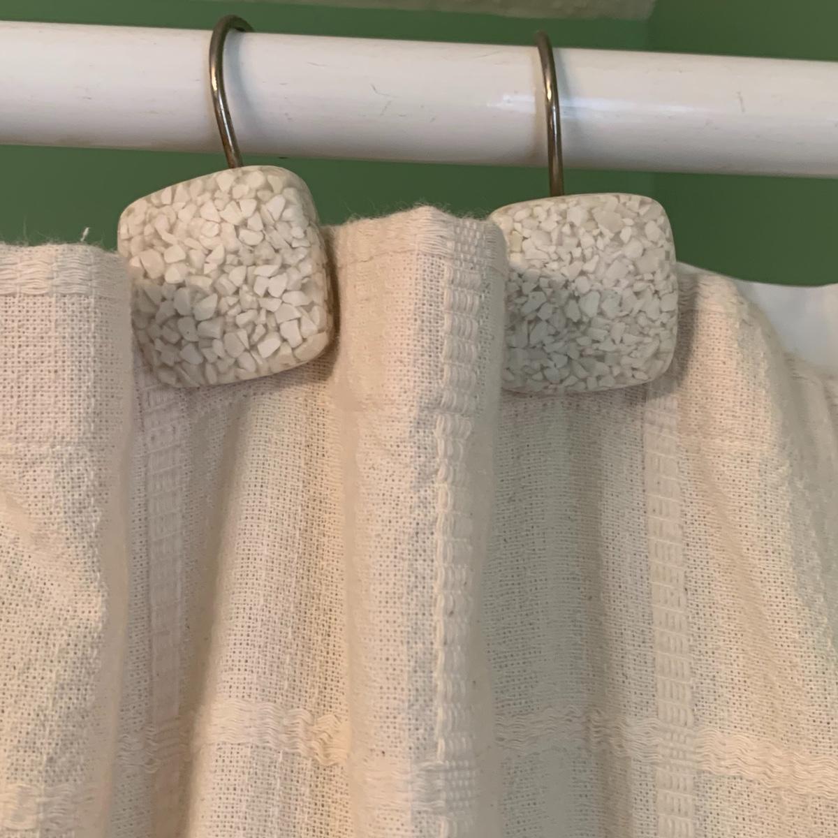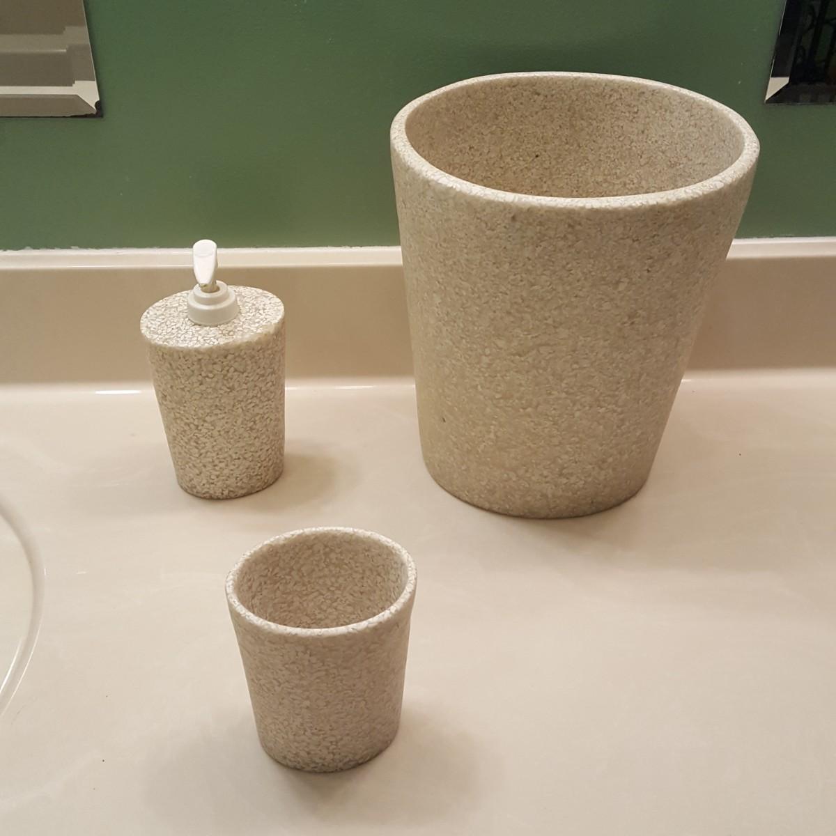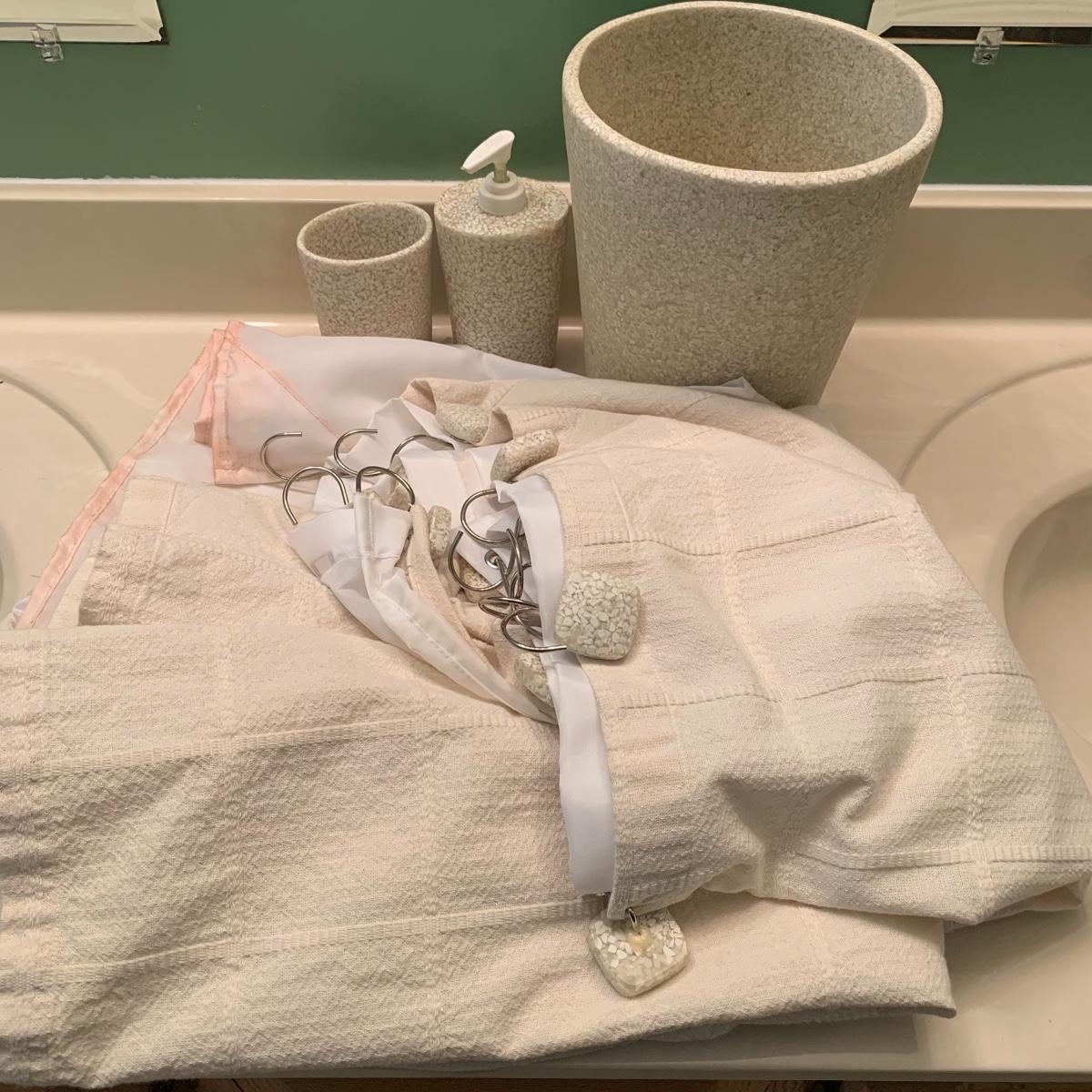 This lot contains a beautiful stone pattern in the soap dispenser (7” x 4”), toothbrush holder (4” x 3”), small garbage can (7” x 10”), and 12 shower curtain hooks. The shower curtain matches in the tan tones. It is 100% cotton and measures approximately 60” x 69”. A shower curtain liner is included too, which is 100% polyester. It has some discoloration along the bottom edge. The accessories appear to be in good condition. The garbage can does have some stains at the bottom, see pictures for details. Local pickup only.