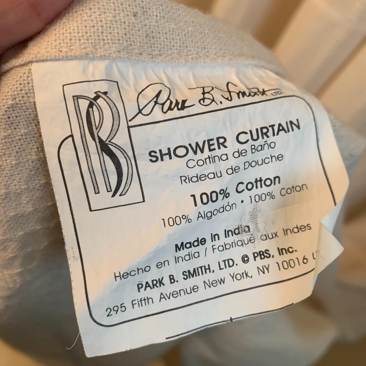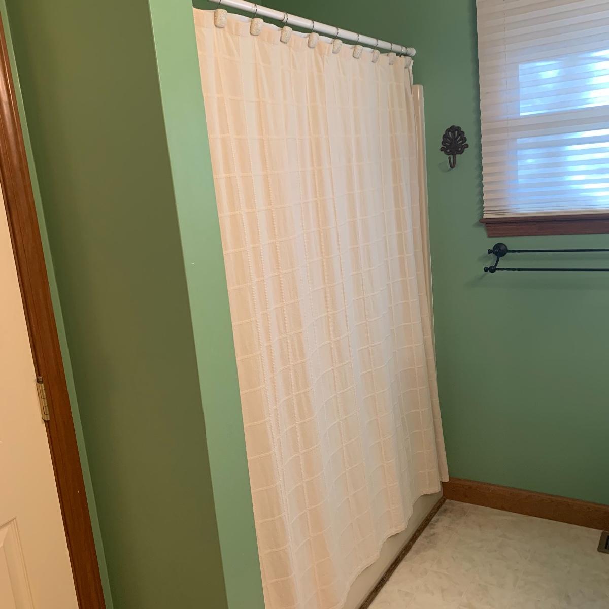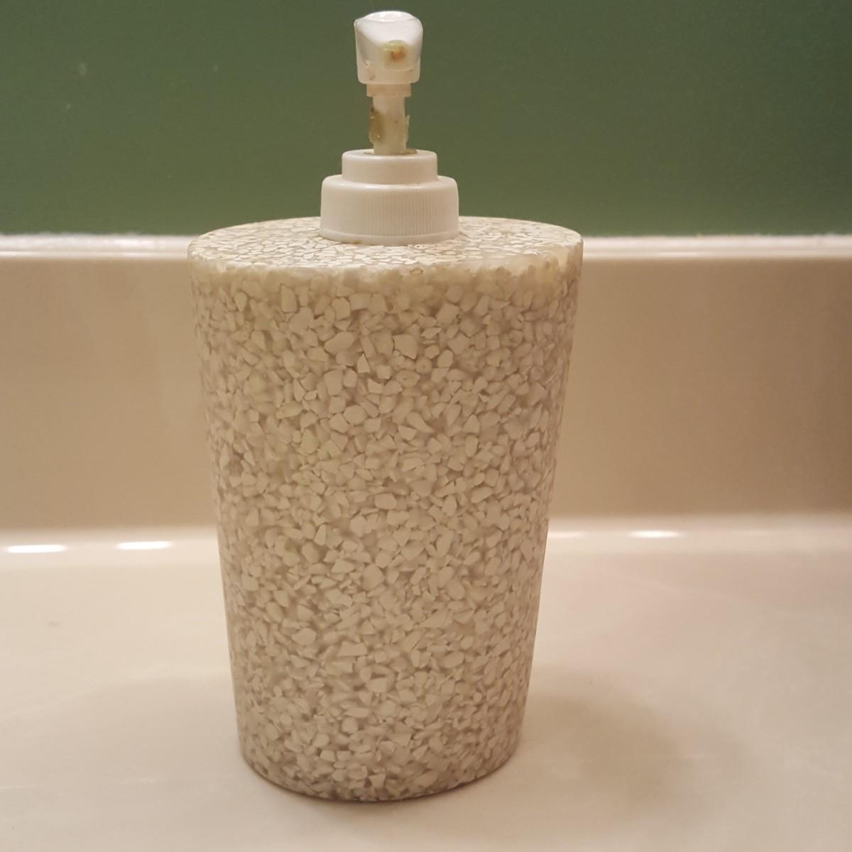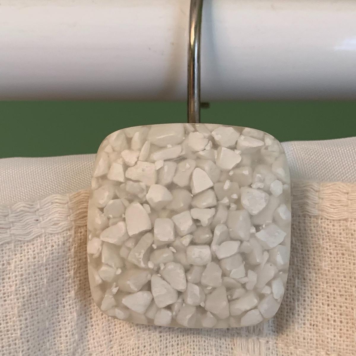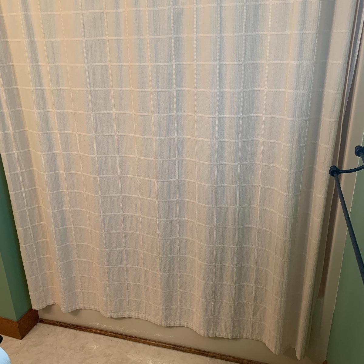This lot contains a beautiful stone pattern in the soap dispenser (7” x 4”), toothbrush holder (4” x 3”), small garbage can (7” x 10”), and 12 shower curtain hooks. The shower curtain matches in the tan tones. It is 100% cotton and measures approximately 60” x 69”. A shower curtain liner is included too, which is 100% polyester. It has some discoloration along the bottom edge. The accessories appear to be in good condition. The garbage can does have some stains at the bottom, see pictures for details. Local pickup only.