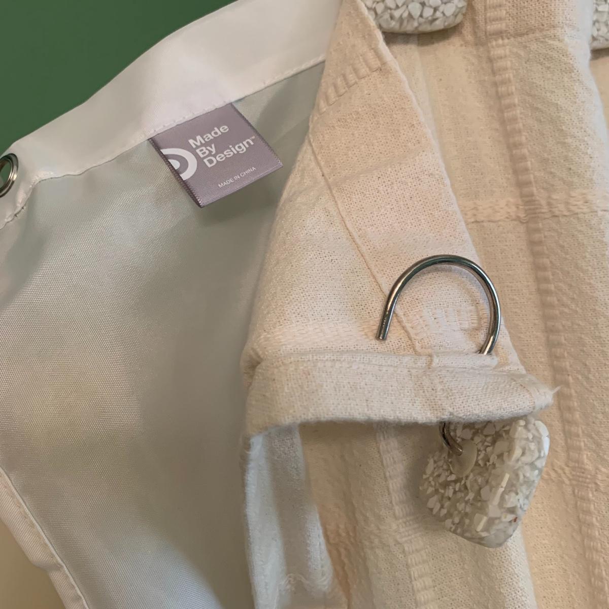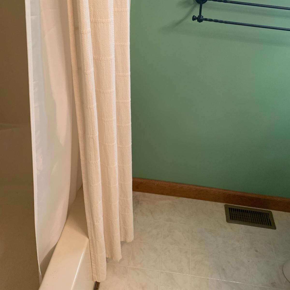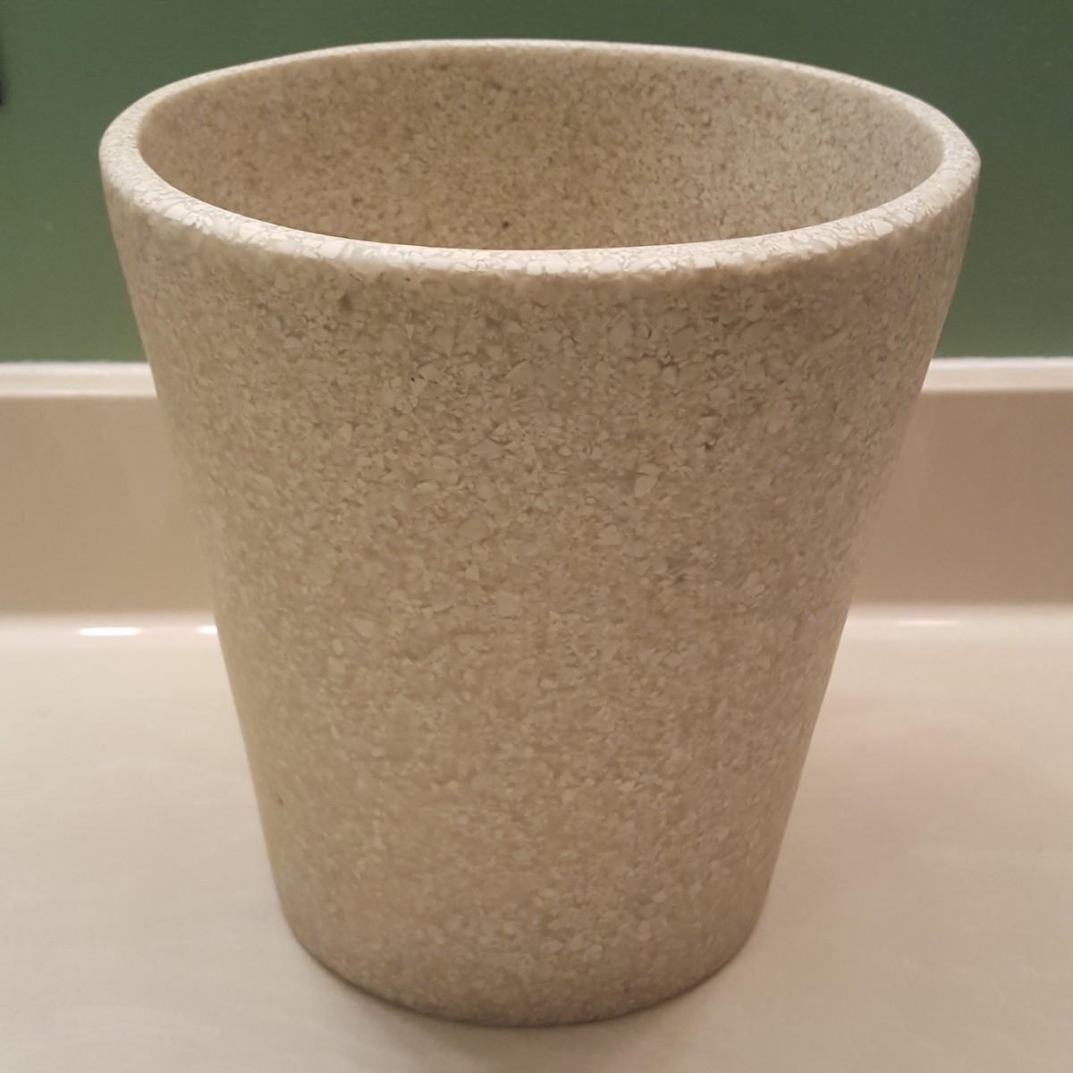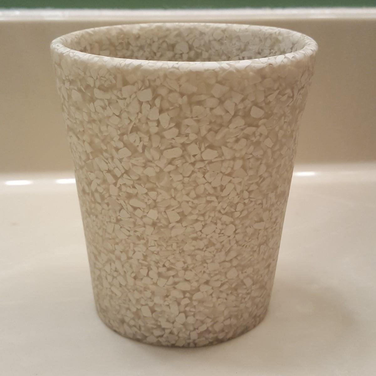 This lot contains a beautiful stone pattern in the soap dispenser (7” x 4”), toothbrush holder (4” x 3”), small garbage can (7” x 10”), and 12 shower curtain hooks. The shower curtain matches in the tan tones. It is 100% cotton and measures approximately 60” x 69”. A shower curtain liner is included too, which is 100% polyester. It has some discoloration along the bottom edge. The accessories appear to be in good condition. The garbage can does have some stains at the bottom, see pictures for details. Local pickup only.