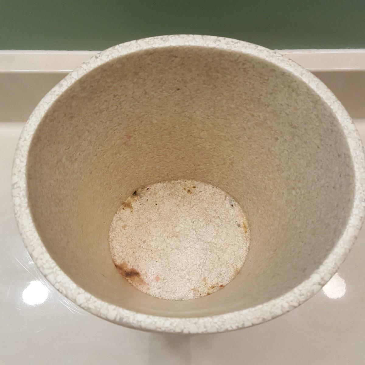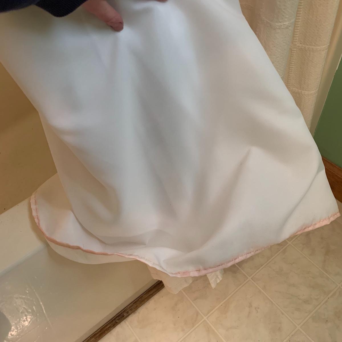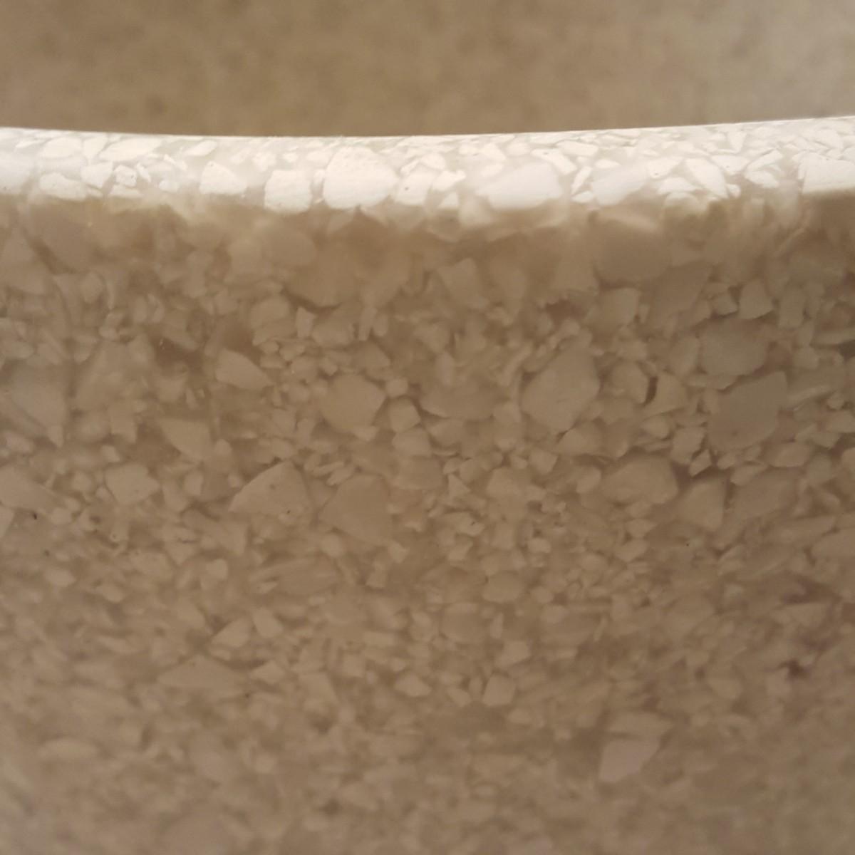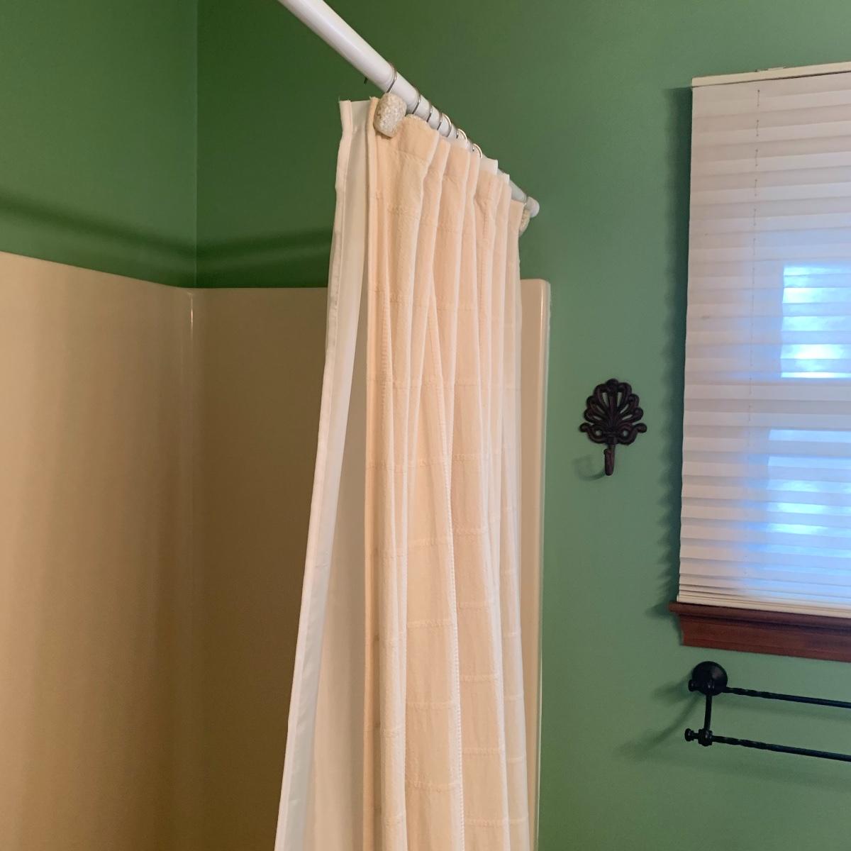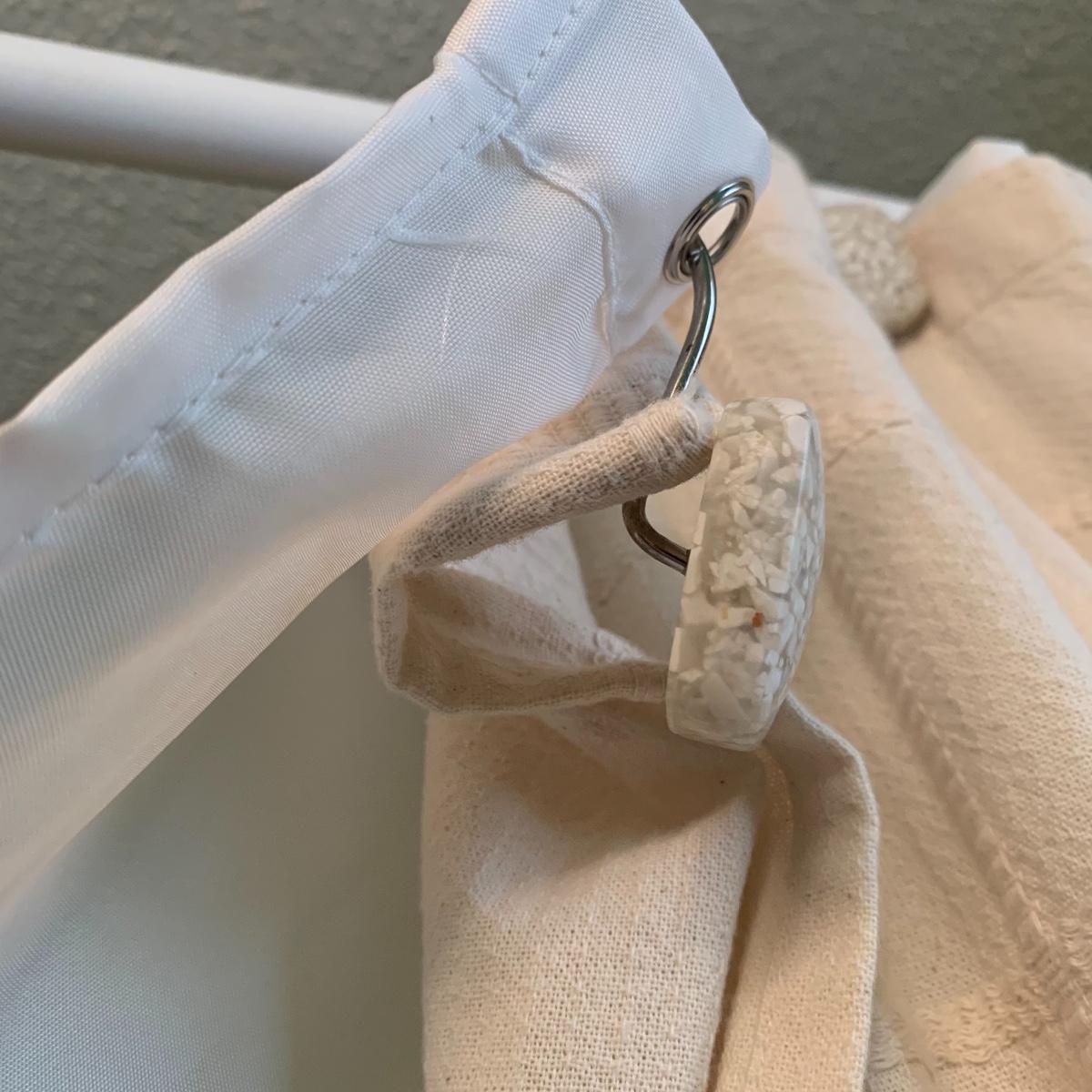 This lot contains a beautiful stone pattern in the soap dispenser (7” x 4”), toothbrush holder (4” x 3”), small garbage can (7” x 10”), and 12 shower curtain hooks. The shower curtain matches in the tan tones. It is 100% cotton and measures approximately 60” x 69”. A shower curtain liner is included too, which is 100% polyester. It has some discoloration along the bottom edge. The accessories appear to be in good condition. The garbage can does have some stains at the bottom, see pictures for details. Local pickup only.