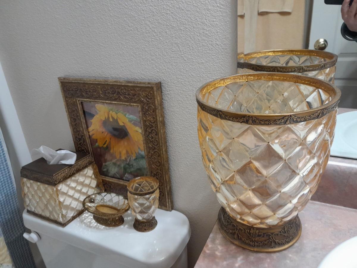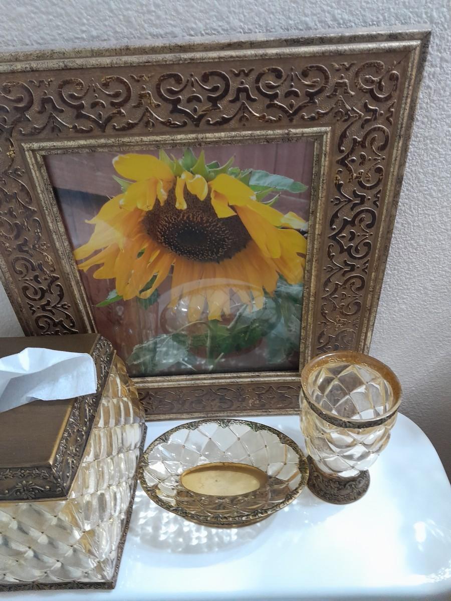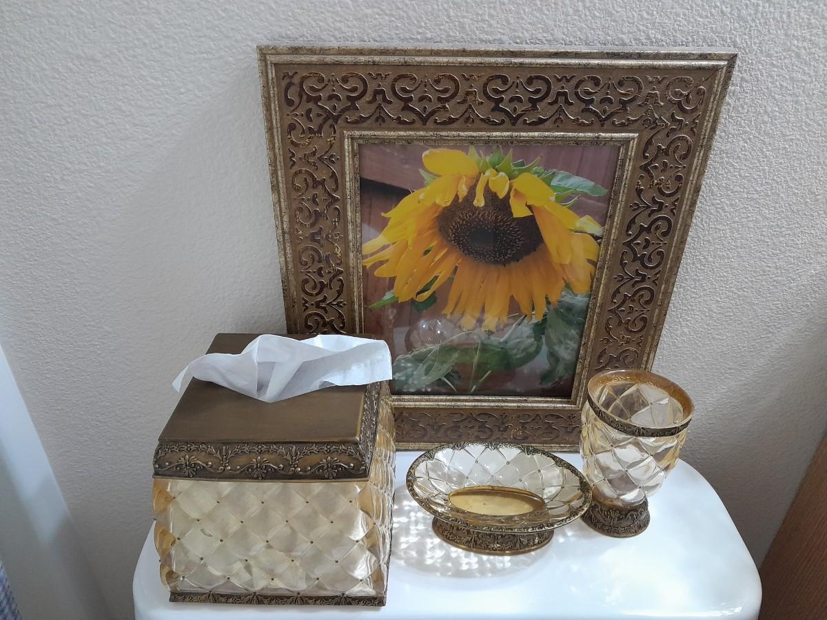 THICK PLASTIC WASTE CAN, SOAP DISH, KLEENEX BOX, CUP, SUNFLOWER PICTURE